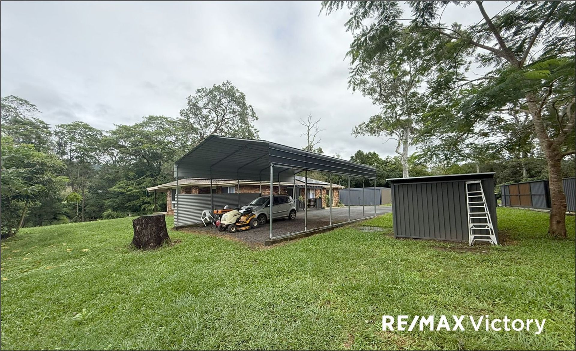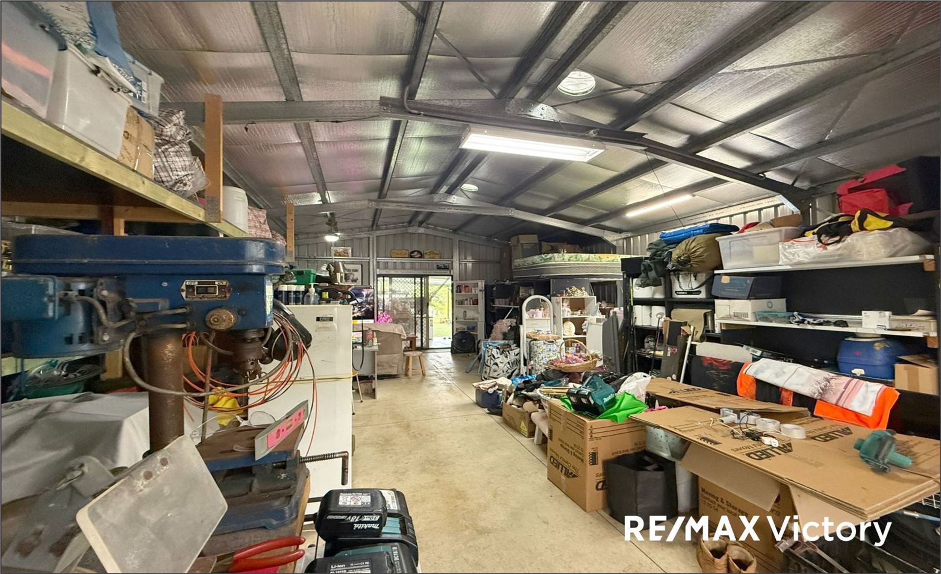 The shed internally is (9m x 7m), and the roof area is (9m x 7m), insulated. It has parking for two vehicles at the front (6m x 6m), an additional carport, a standard roller door entry, and a glass sliding door from the rear to a fantastic outdoor camp kitchen, under the shed's roof (3m x 7m). A caravan decked out for a Mates hotel is parked beside the camp kitchen.
