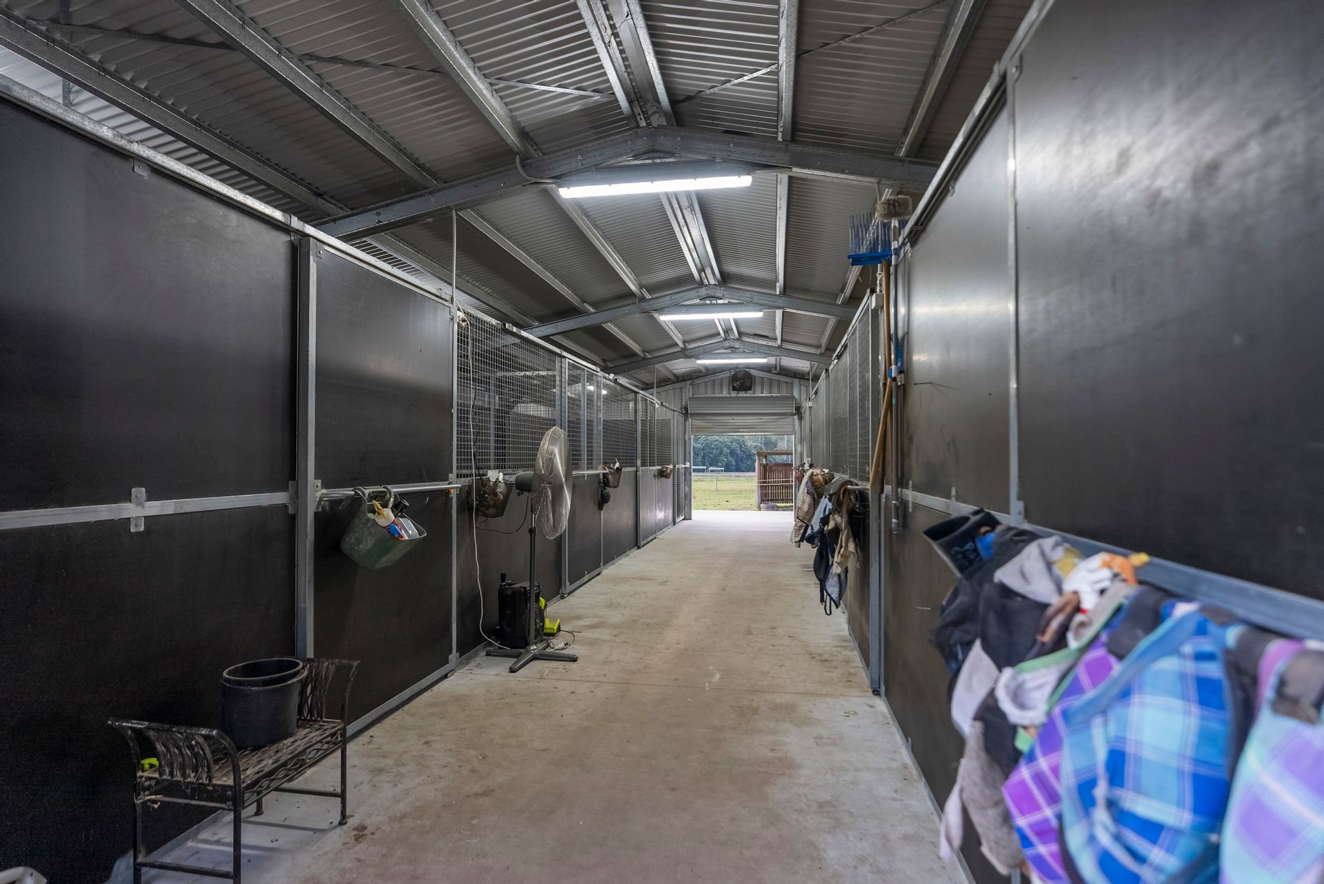 • Six-stable shed, fully rubber-lined with lighting and power.