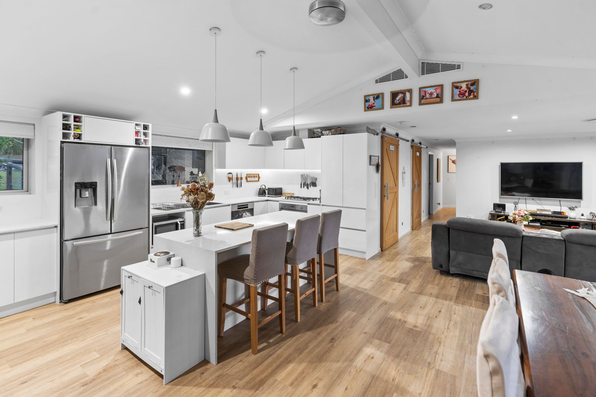 • Stylish barn-style sliding doors add character and provide access to the bathroom and laundry areas.