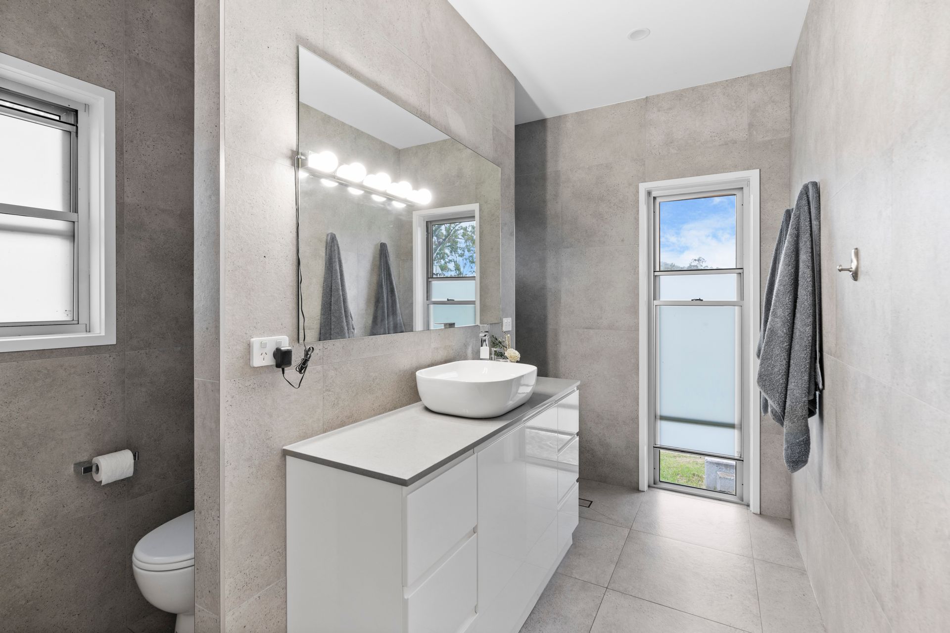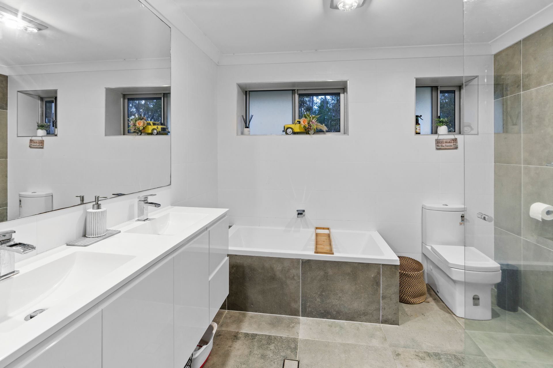 • Modern bathrooms with elegant double vanities and floor-to-ceiling natural stone-look tiles for a timeless, sophisticated finish.