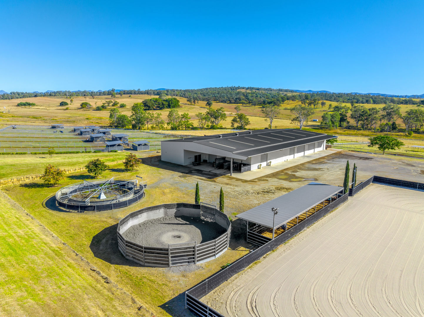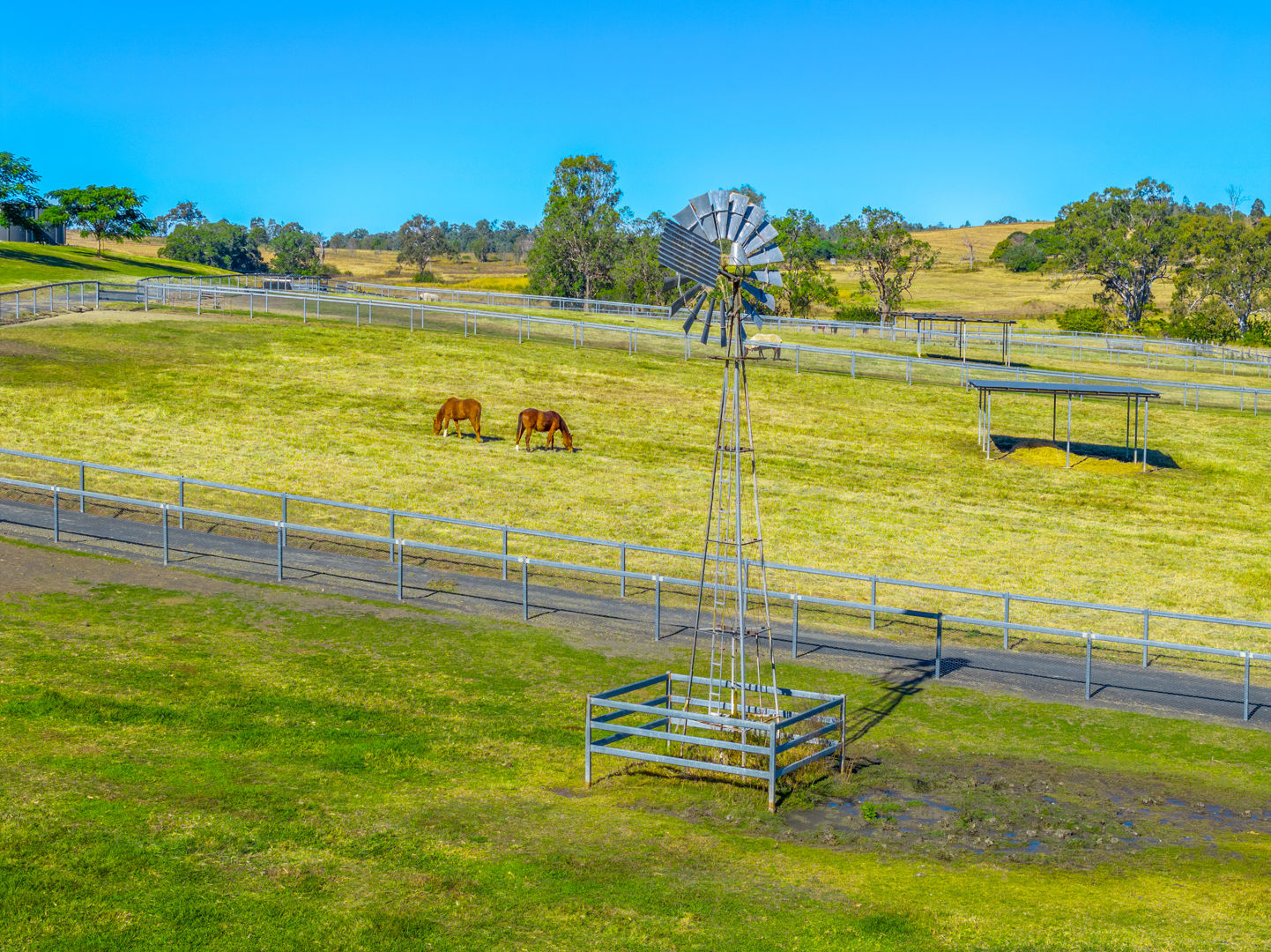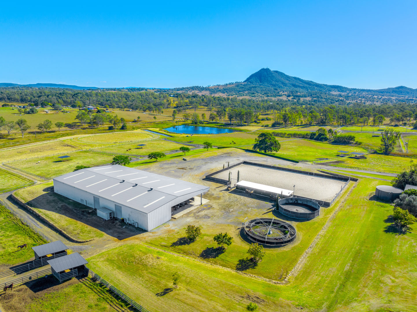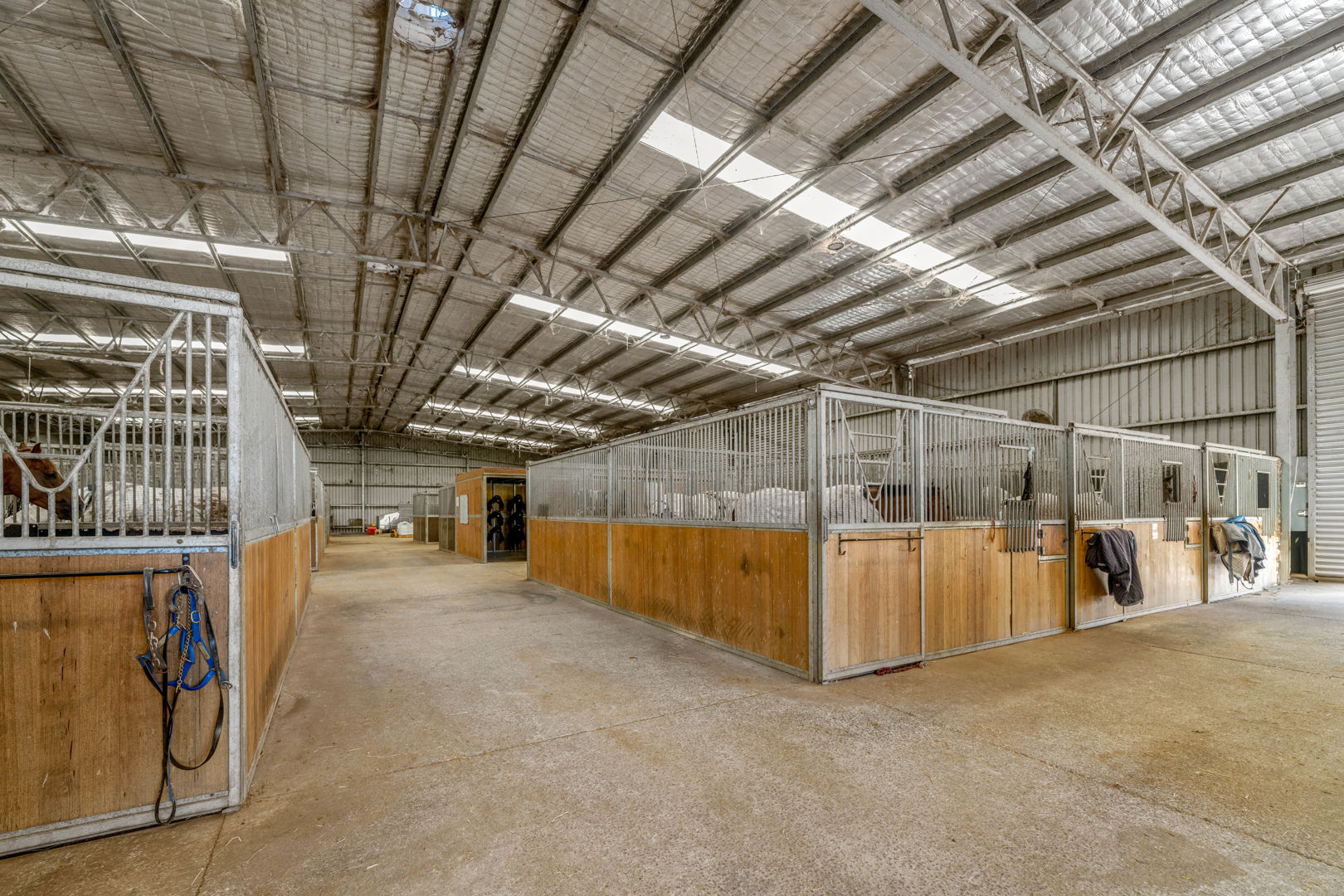 • Main Barn/Shed - 57m x 32m (1824m²) * 39 stables with cushioned flooring * Tack and rug/feed rooms * 3 wash bays with overhead sprays, hot/cold water * Vet crush, sawdust pit * 8 electric 6m-high roller doors for easy access * Internal Manager's Residence: 3 bed, 1 bath + office, kitchen, ducted a/c • Arena & Training * E.L.D Sand Arena - 70m x 40m with floodlighting * 4 covered outdoor boxes (5x4m) along arena * 16m Round Yard * 8-Horse Electric Walker with water supply * Horse Swim - 65m * 400m training Track • External Equine Infrastructure * 17 external stables (approx. 6x6m) with day yards & lighting * 12 internal paddocks with shelters * Large secure post-and-rail grazing paddocks * Extensive room for expansion