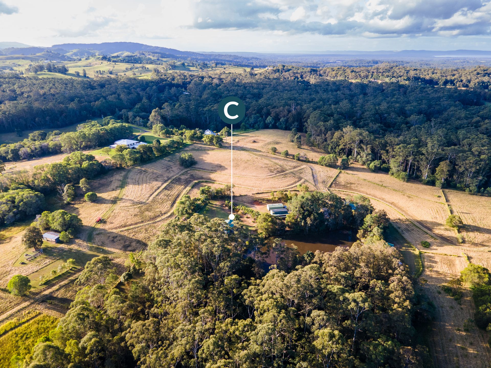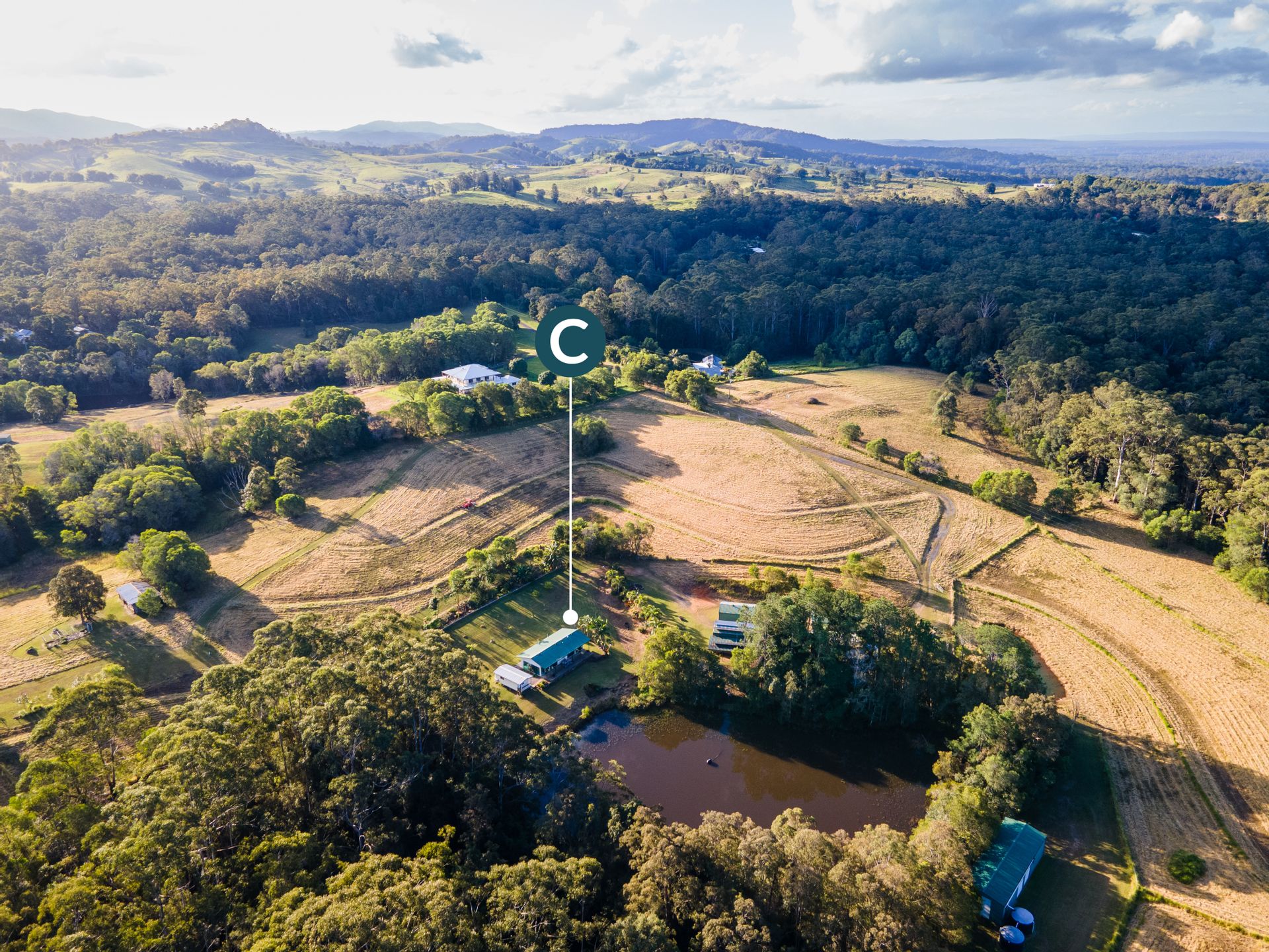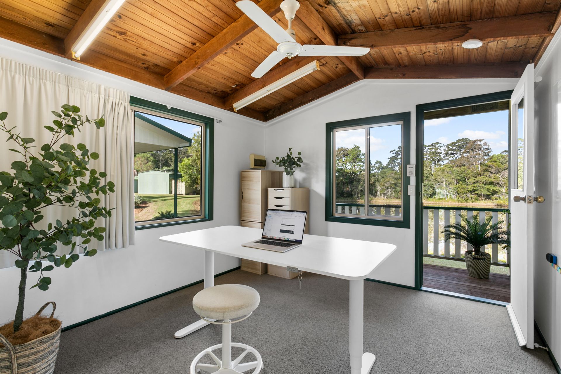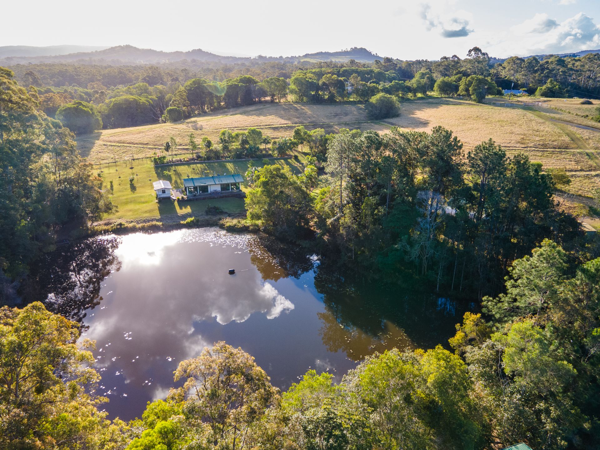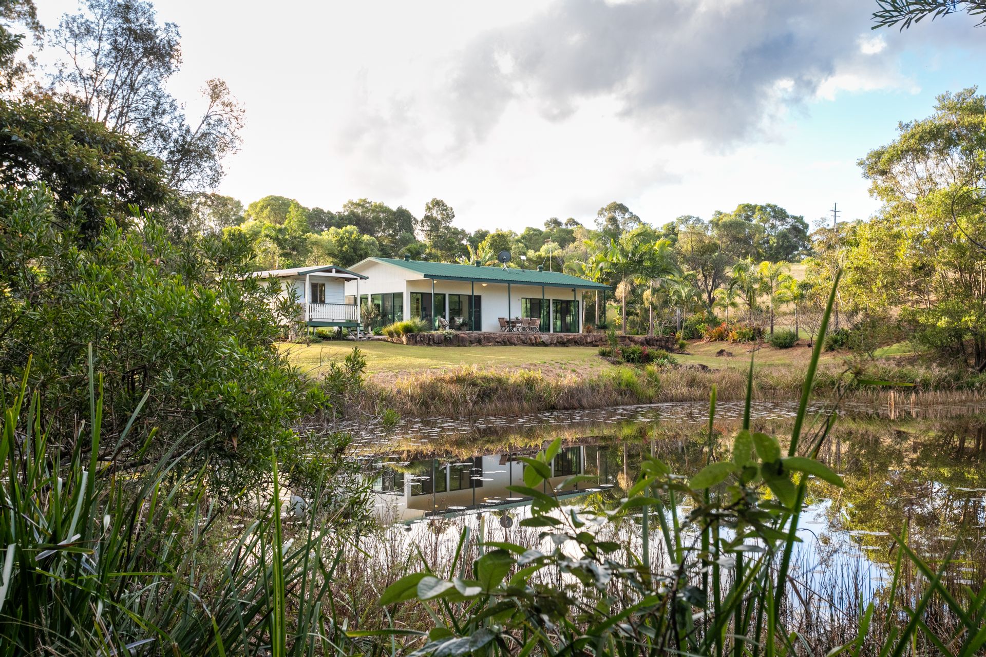 The main home is a fully air-conditioned steel-frame building comprising master bedroom, bathroom/laundry combo, modern kitchen and open plan living, flowing onto an east-facing covered balcony overlooking the main dam. Alongside it is a 2-bedroom air-conditioned cabin with deck; one bedroom is currently used as an office.