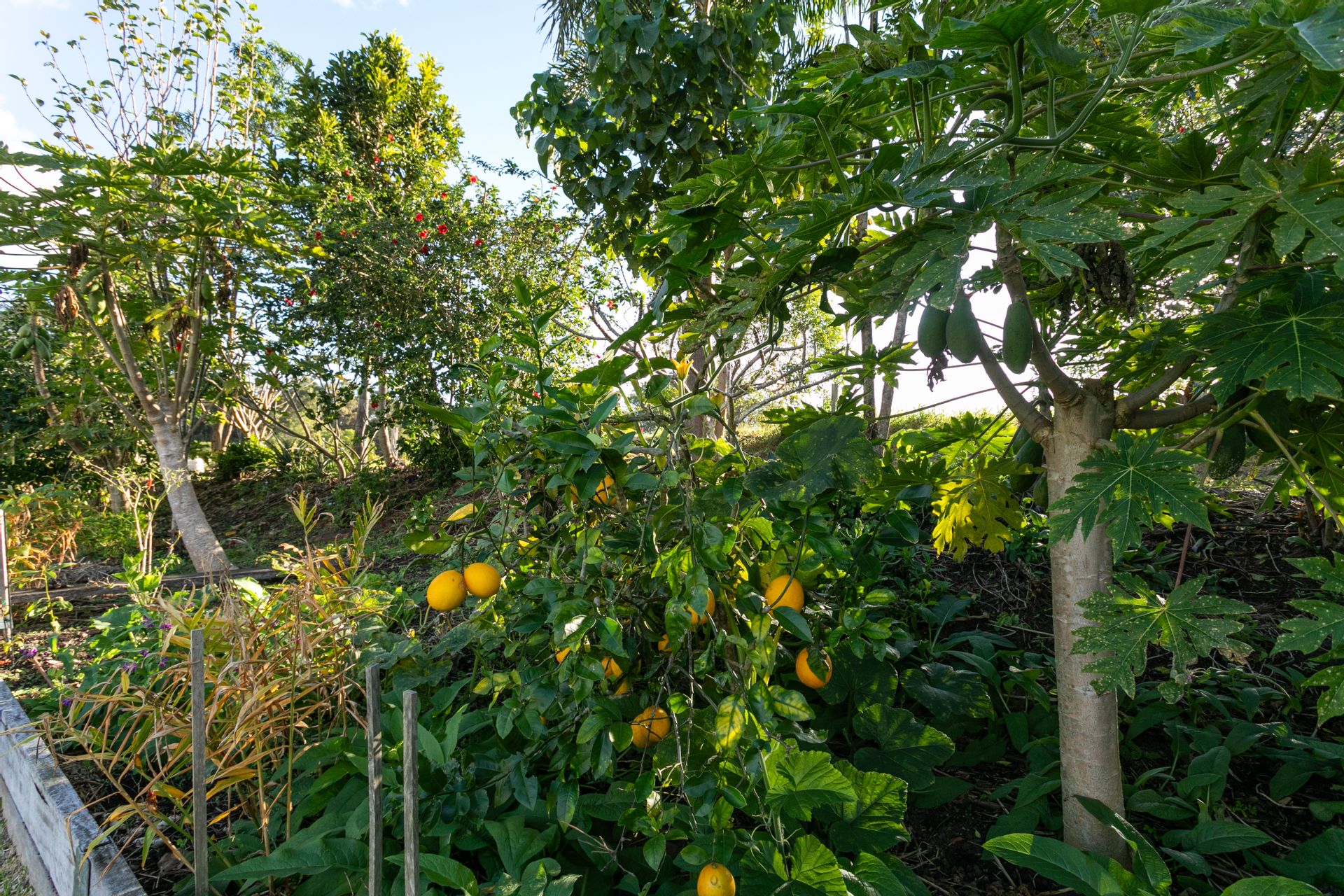 Numerous trees are still maturing, offering future bounty and a wide range of self-seeding or perennial vegetables and herbs thrive here, including green peppers, chokos, cherry tomatoes, and edible greens including Kyoto spinach and tree lettuce.