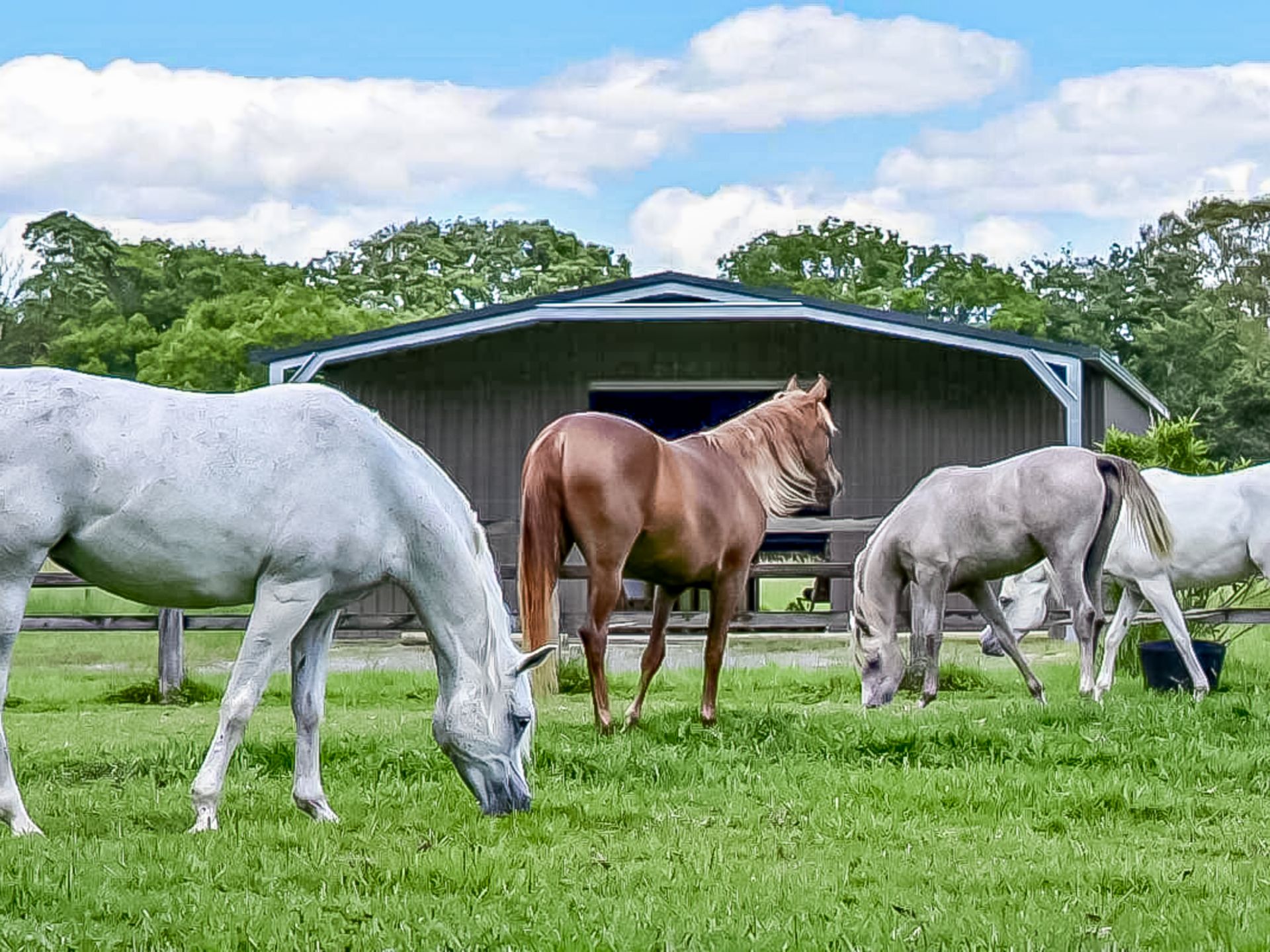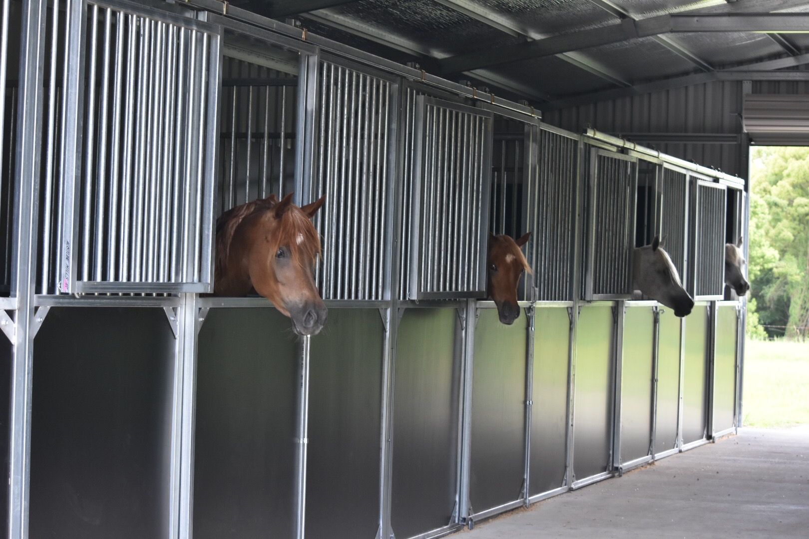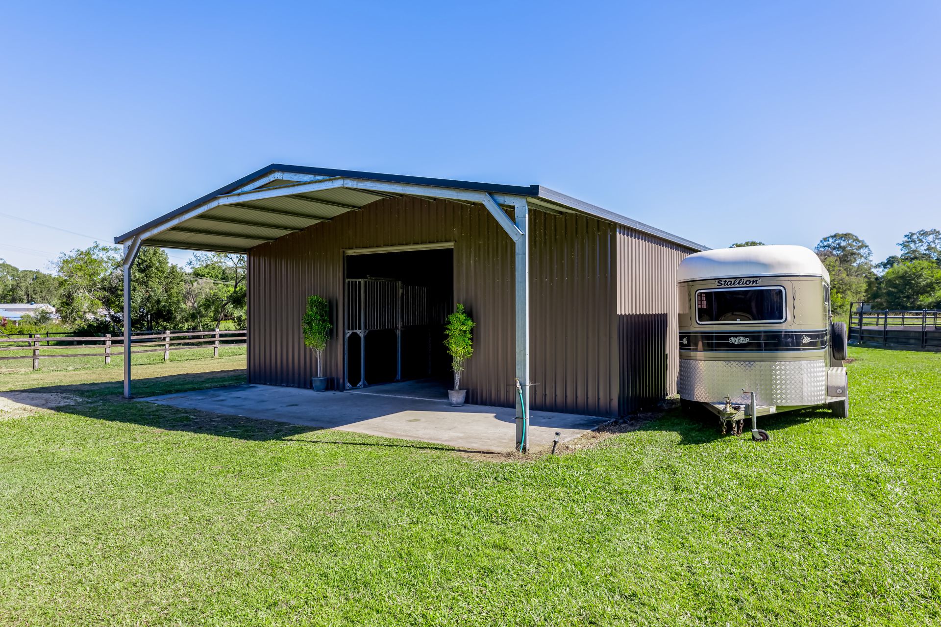 - A Council-approved Colourbond (Ranbuild) 20m x 10m barn featuring six good-sized stables with fans and sliding doors, built on a concrete slab with 20 mm thick rubber in all stables. There is a wash bay with hot and cold water, a feed room, a laundry and toilet area, and power outlets.