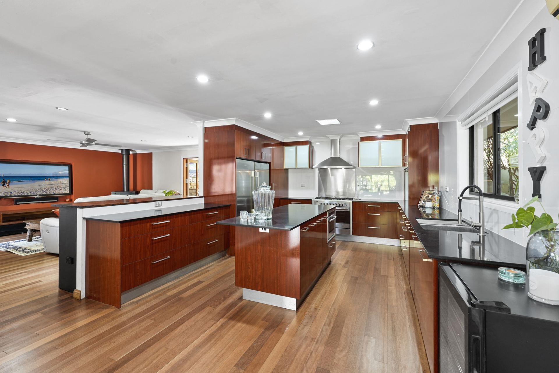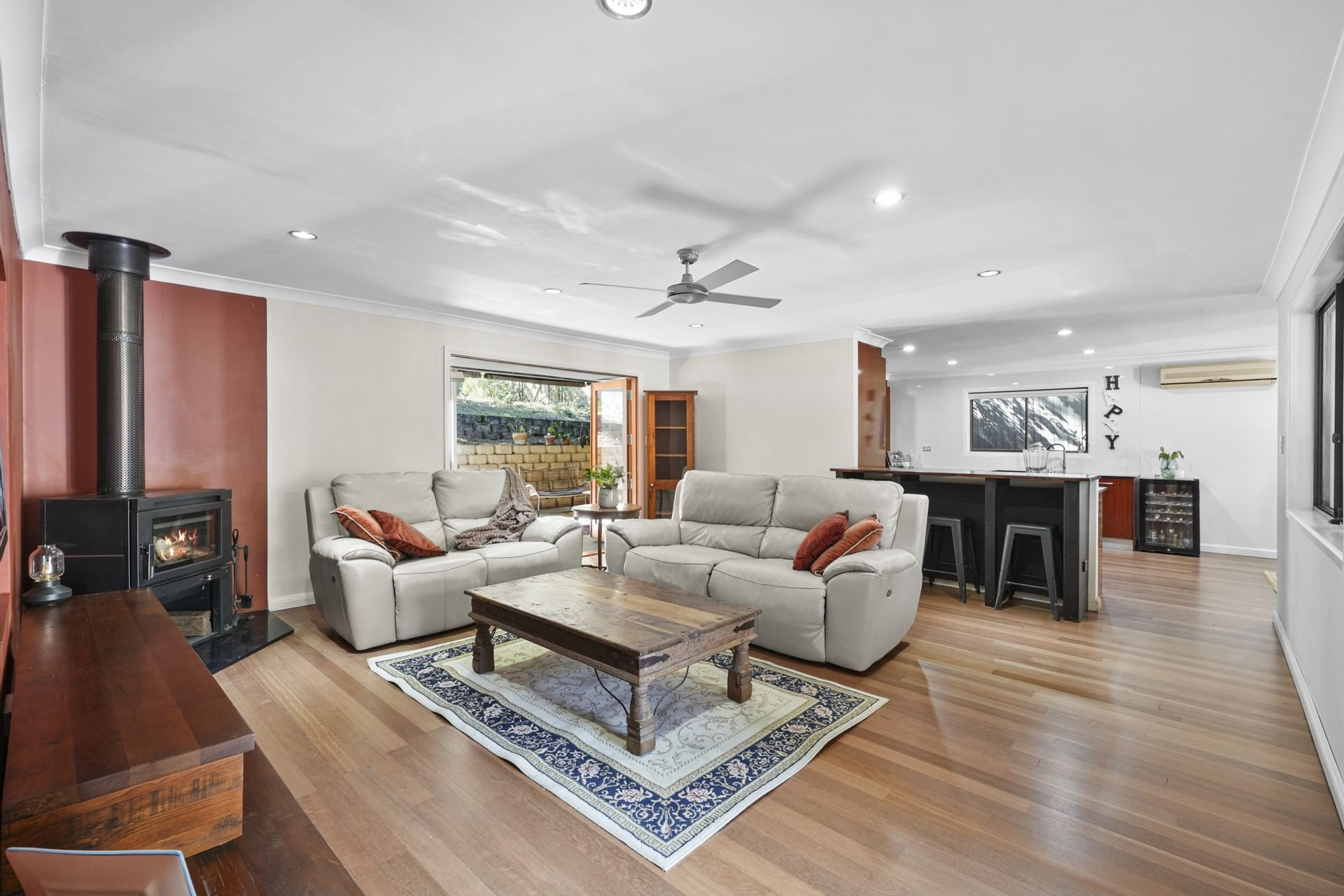 At the heart of the home is an open-plan kitchen that flows effortlessly into the main living and dining areas, all warmed by a cozy indoor fireplace. This central hub opens out to a sprawling outdoor entertaining area featuring a magnificent open fireplace, perfect for year round gatherings.