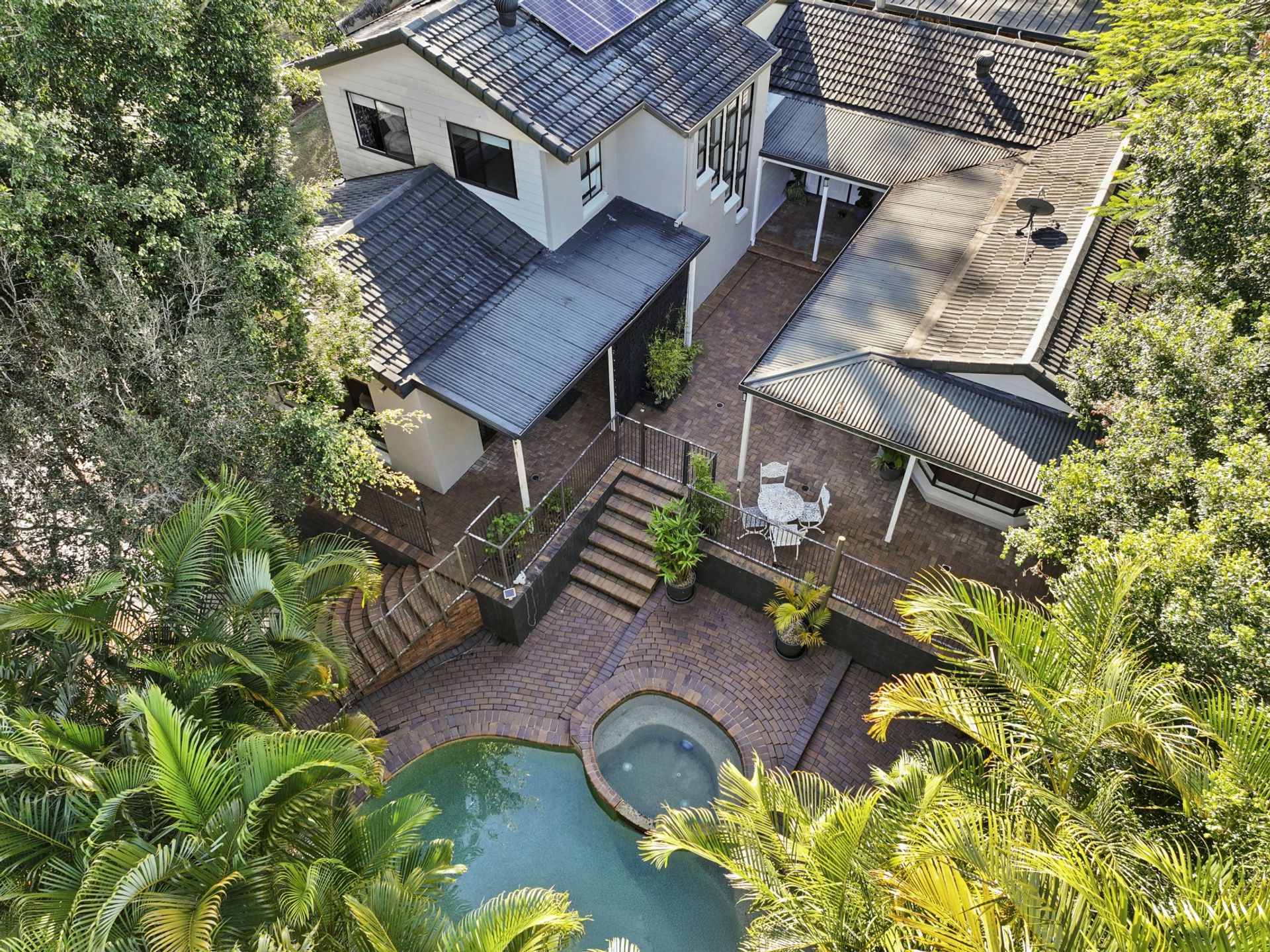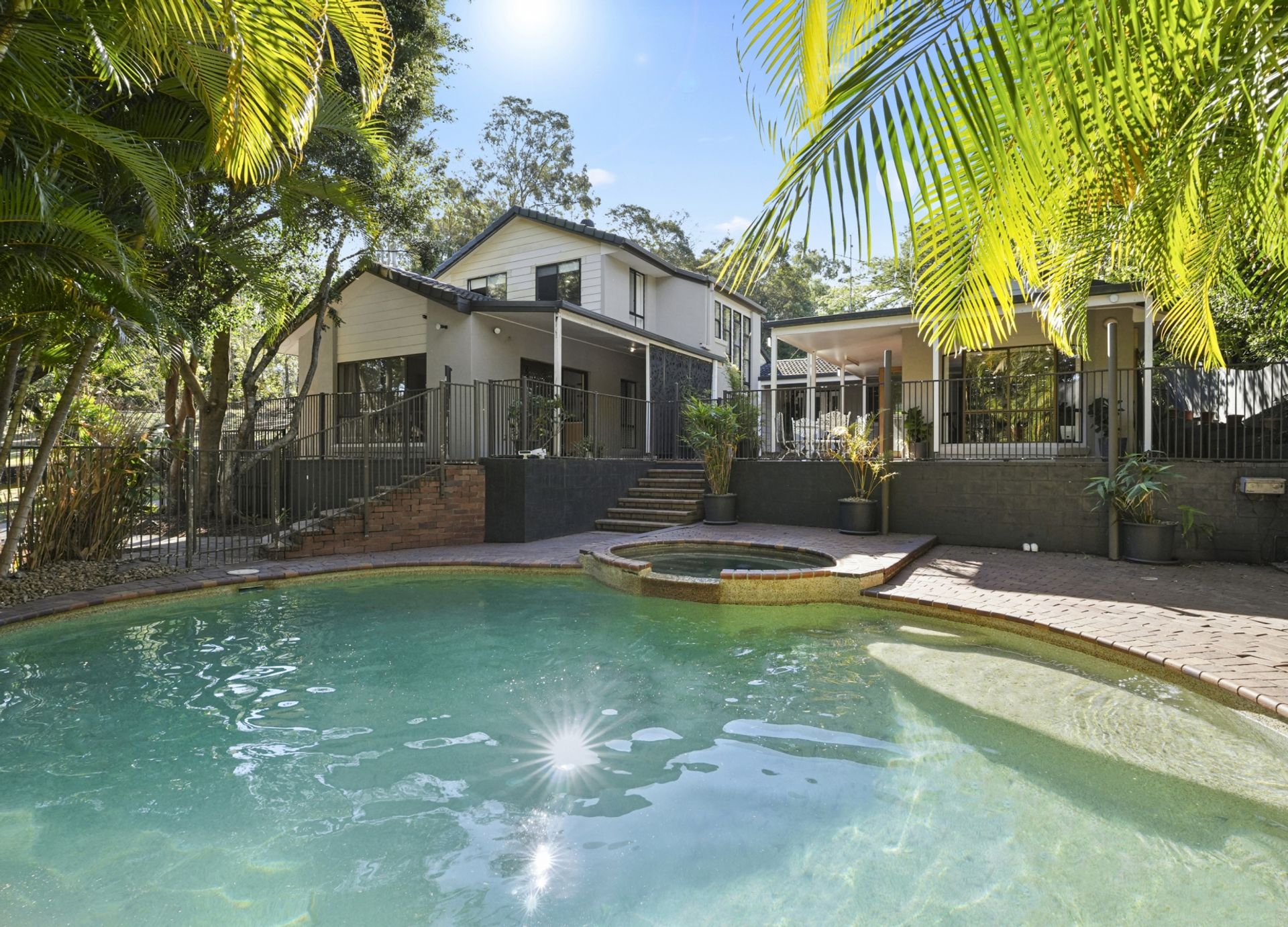 The home is currently configured for dual living, making it ideal for extended family, guests, or investors looking for rental income. Multiple living zones ensure space and privacy for everyone, while the tropical family swimming pool serves as a centerpiece of the courtyard, surrounded by lush landscaping and garden views.