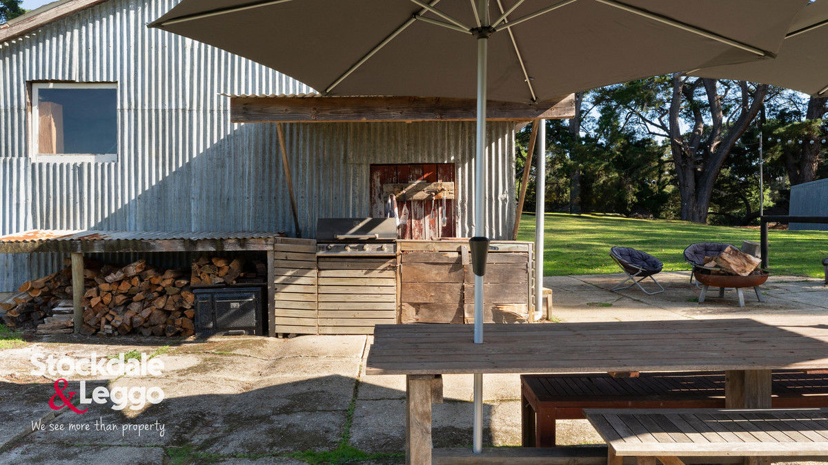 Shedding and outdoor facilities are a standout feature. A brand-new shed includes three open bays and one secure bay with a concrete floor and power. The original shearing shed has been partially converted into a charming entertaining space or studio, complete with a kitchenette, two wood fires, hot and cold water, and power. An adjoining courtyard with ambient lighting and a firepit creates a warm and inviting outdoor dining area.
