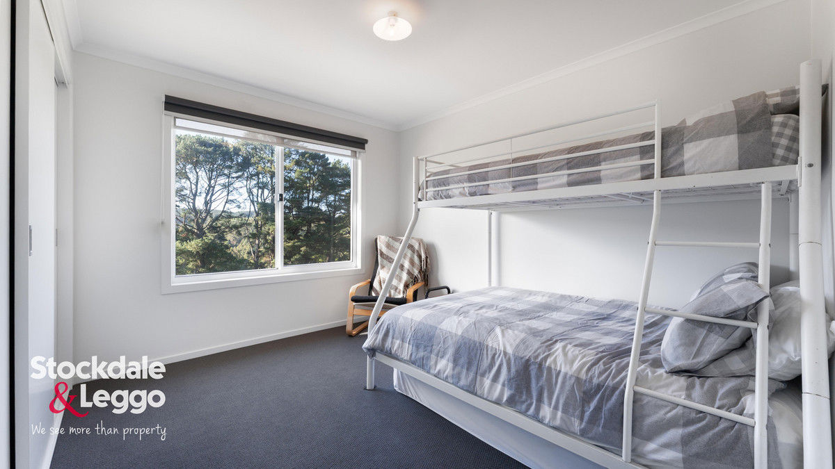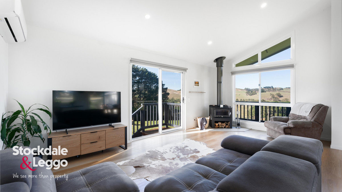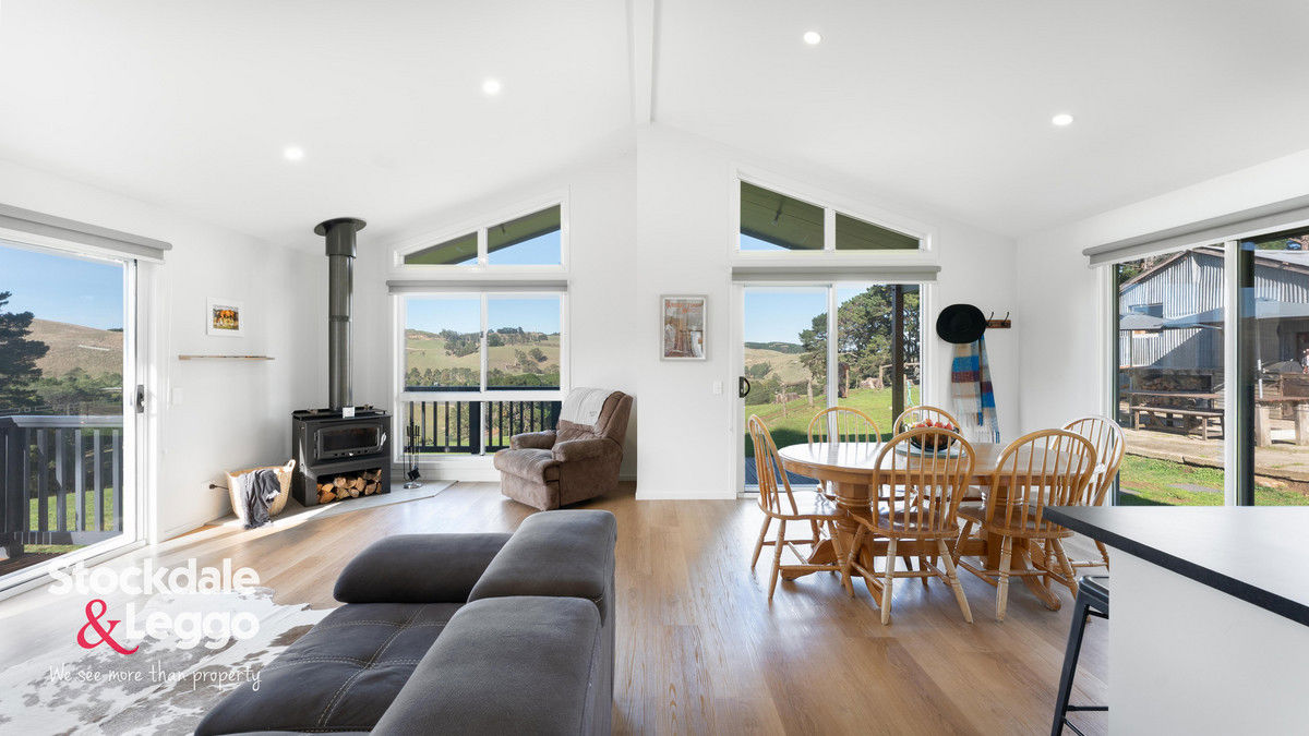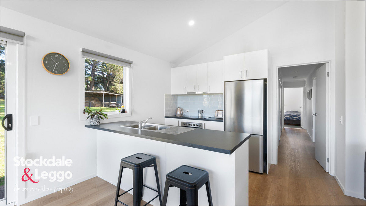 The home features an open-plan kitchen, living, and dining area enhanced by soaring cathedral ceilings and three large sliding doors that flood the space with natural light while framing the idyllic landscape beyond. The well-equipped kitchen includes electric cooking, a dishwasher, and generous storage. Double-glazed windows, cosy woodfire and split system ensure year-round comfort, while the protected deck flowing directly from the living area provides the perfect vantage point to relax or entertain while taking in the breathtaking views.