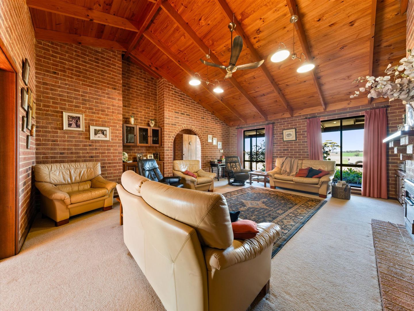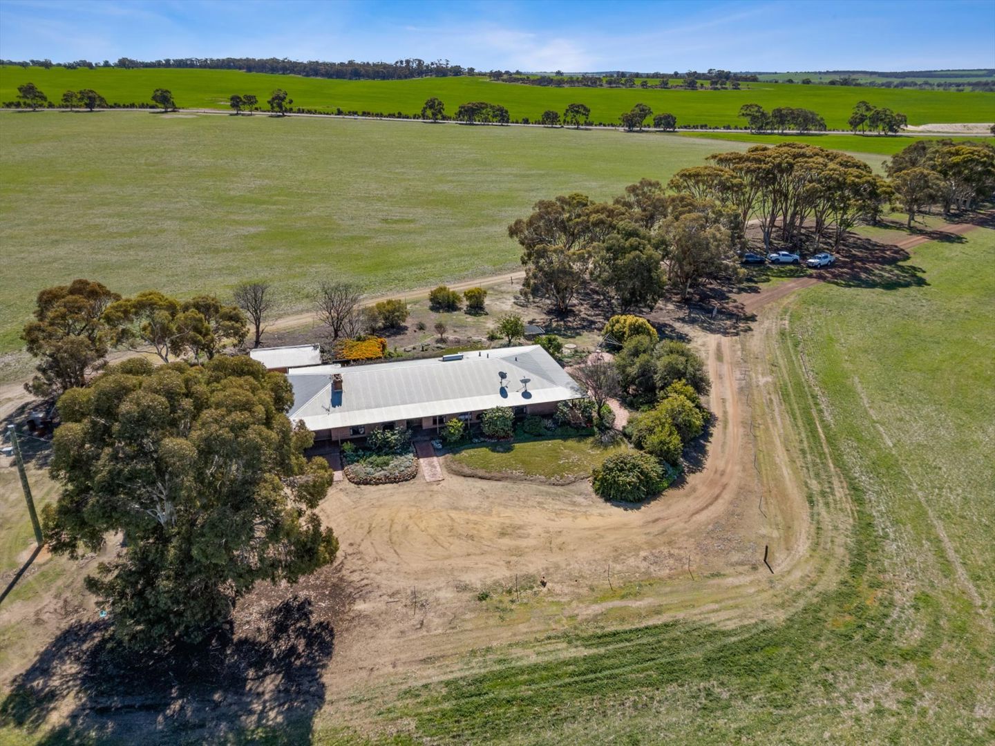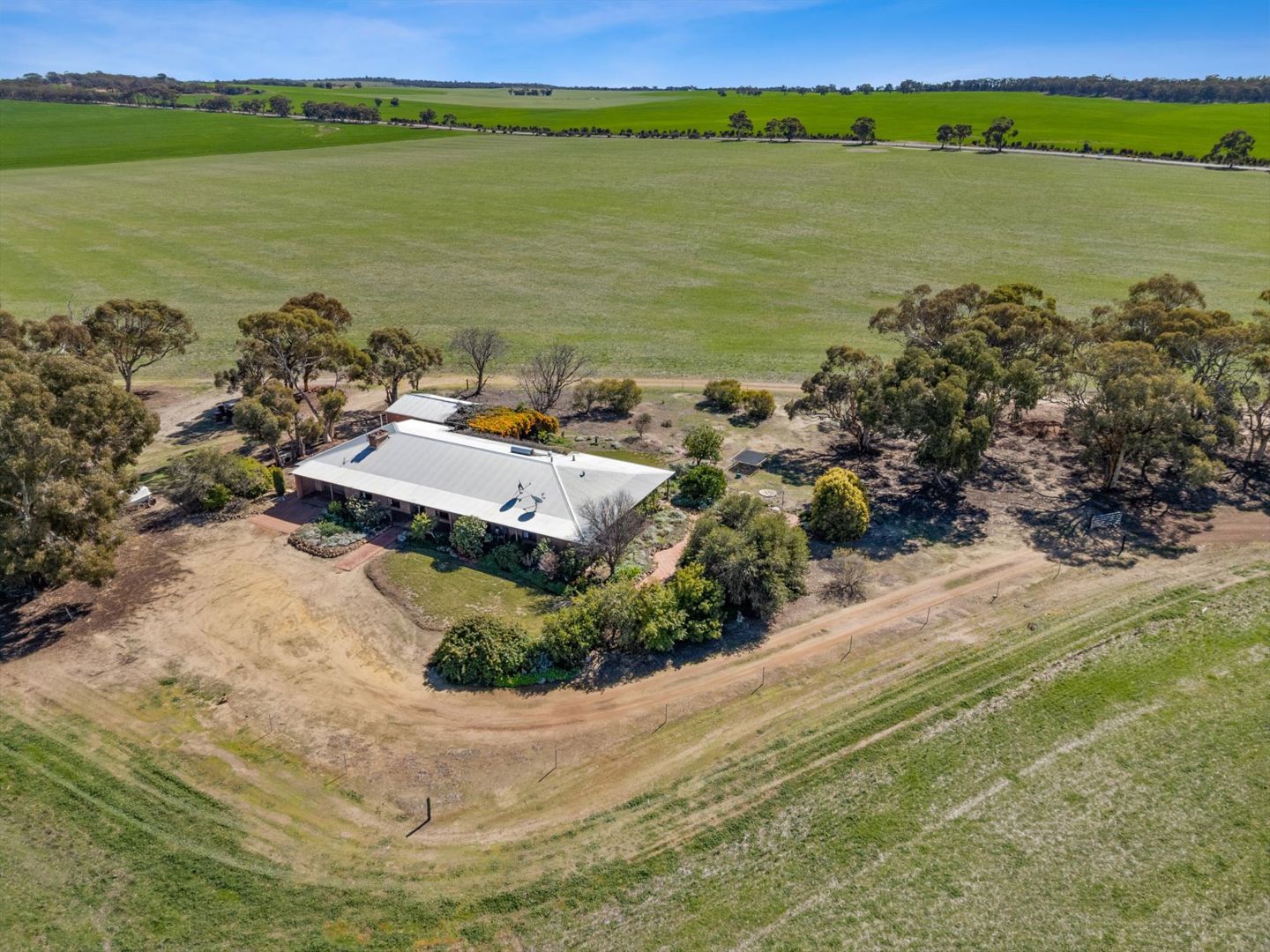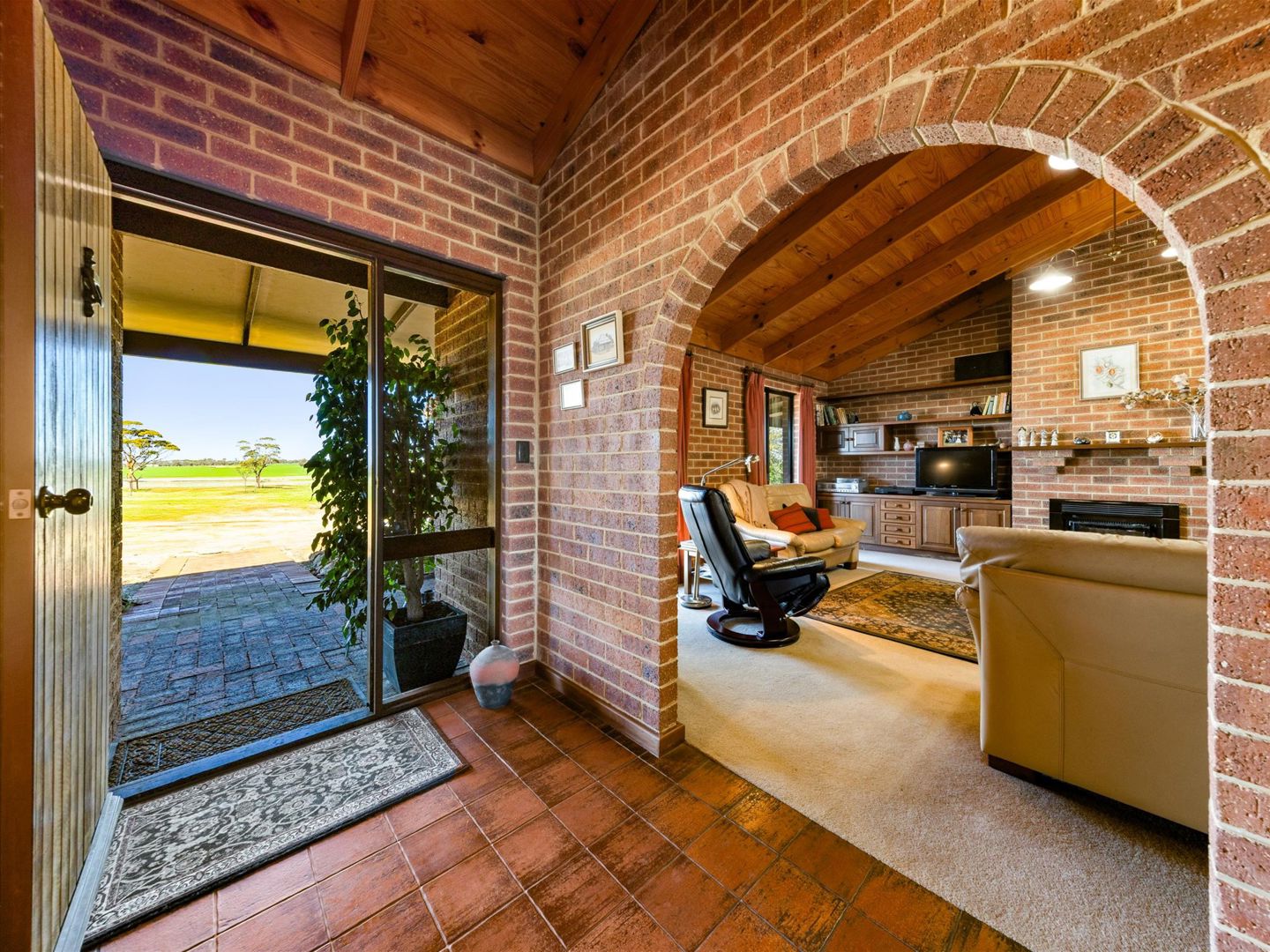Located centrally is a three-bedroom, two bathroom, double brick homestead, set amongst natural timber and well-manicured, auto reticulated lawns and gardens which make it a wonderful family home. The owners built this 'solar passive' design home in 1985, orientated east-west to take full advantage of the sun's 'travel' in all seasons, with emphasis on energy efficiency and the comfort of the family living there. The home is airconditioned in the open plan kitchen and dining room, unique raked ceilings with exposed timber creating a spacious, open feel with a second living area, farm office, all bedrooms with built-in robes and the second bathroom is thoughtfully located to act as a 'mud room' for those that have been 'in the garden' or 'on the farm'. The outdoor entertaining area on the north side of the home boasts impressive views across the surrounding countryside, there is a two-bay garage on the west side plus undercover of the main roof another single bay garage with direct access to the home that could easily be converted to another bedroom or living area. The home is connected to the scheme water supply.
