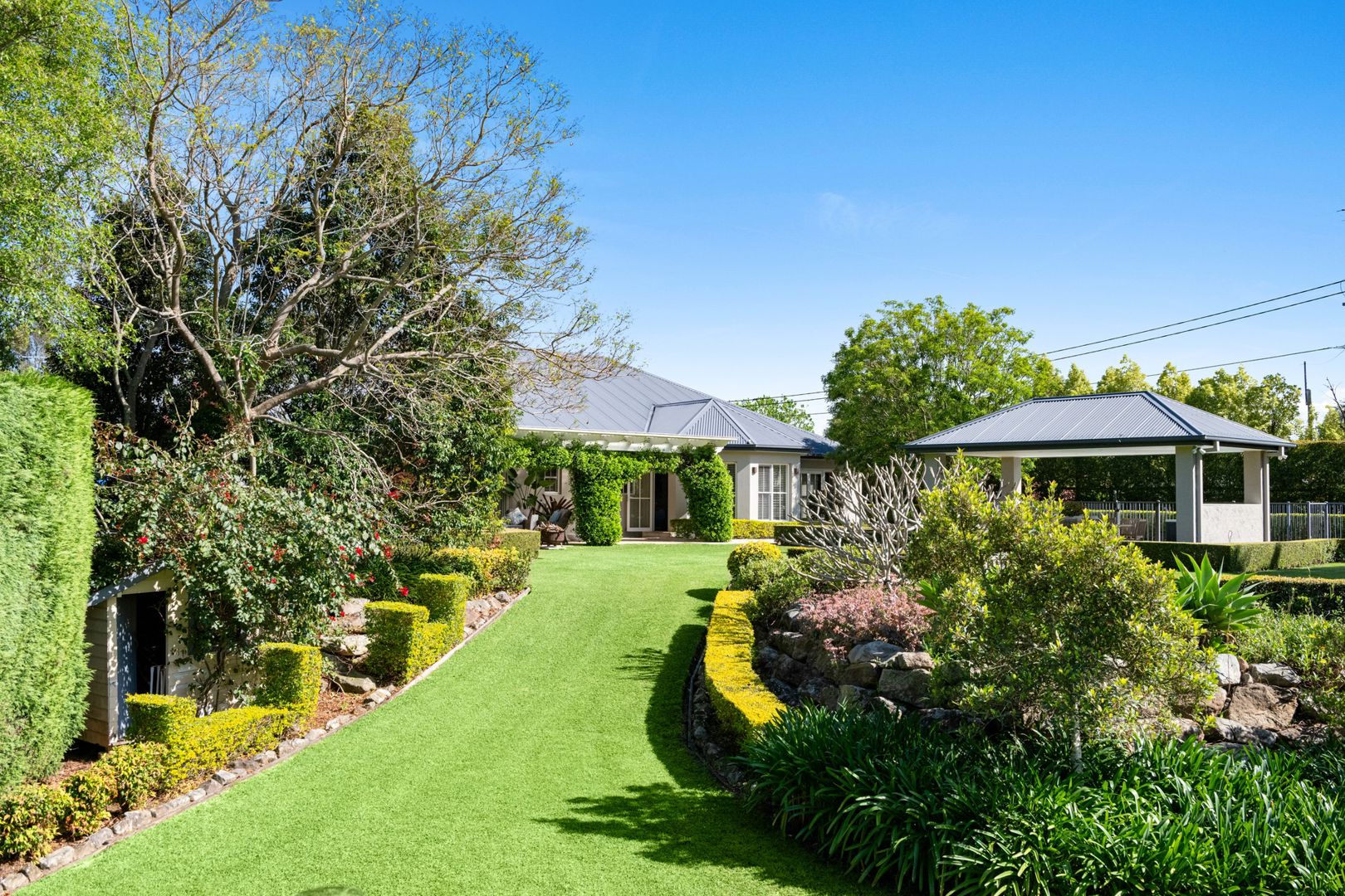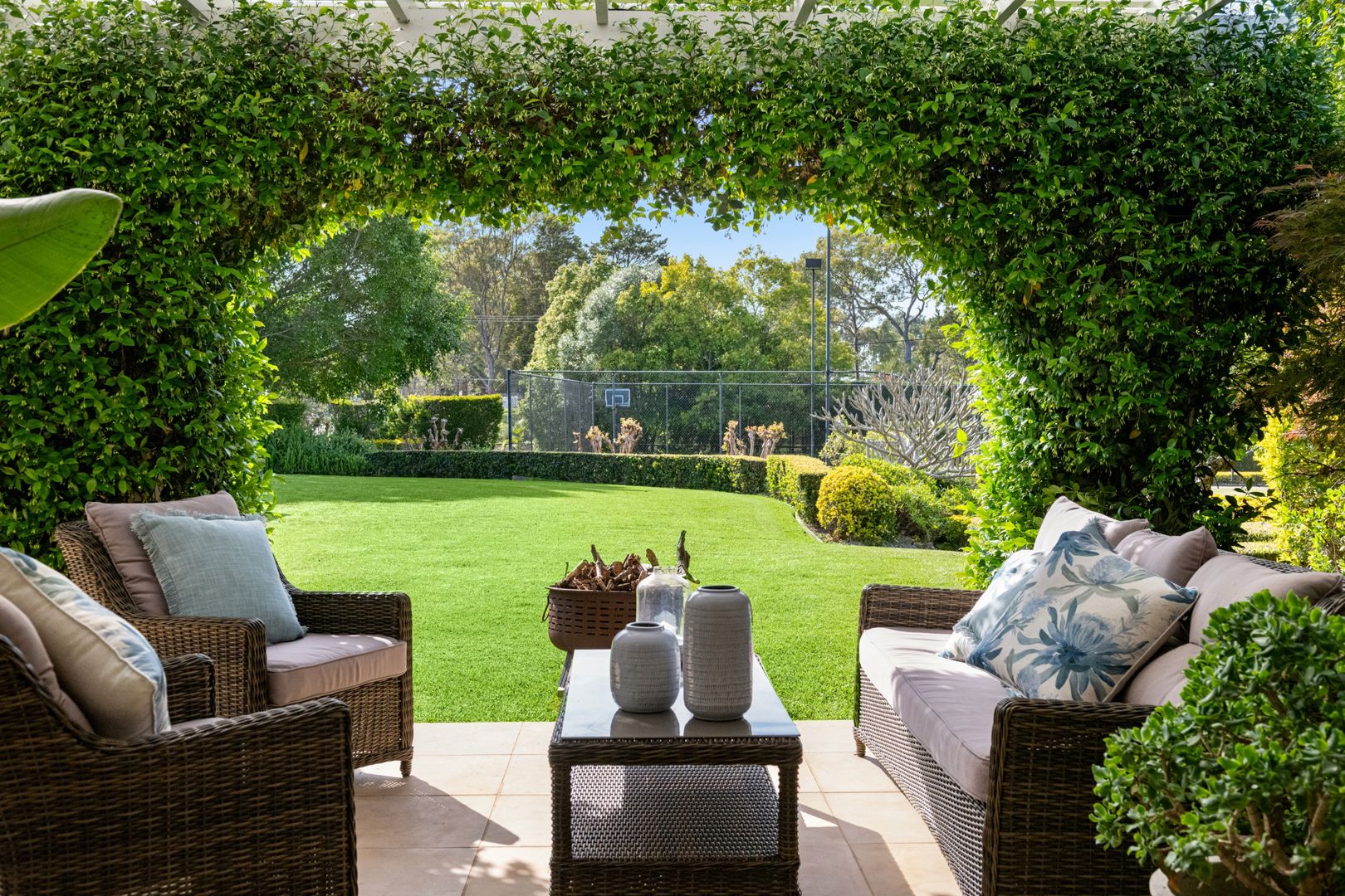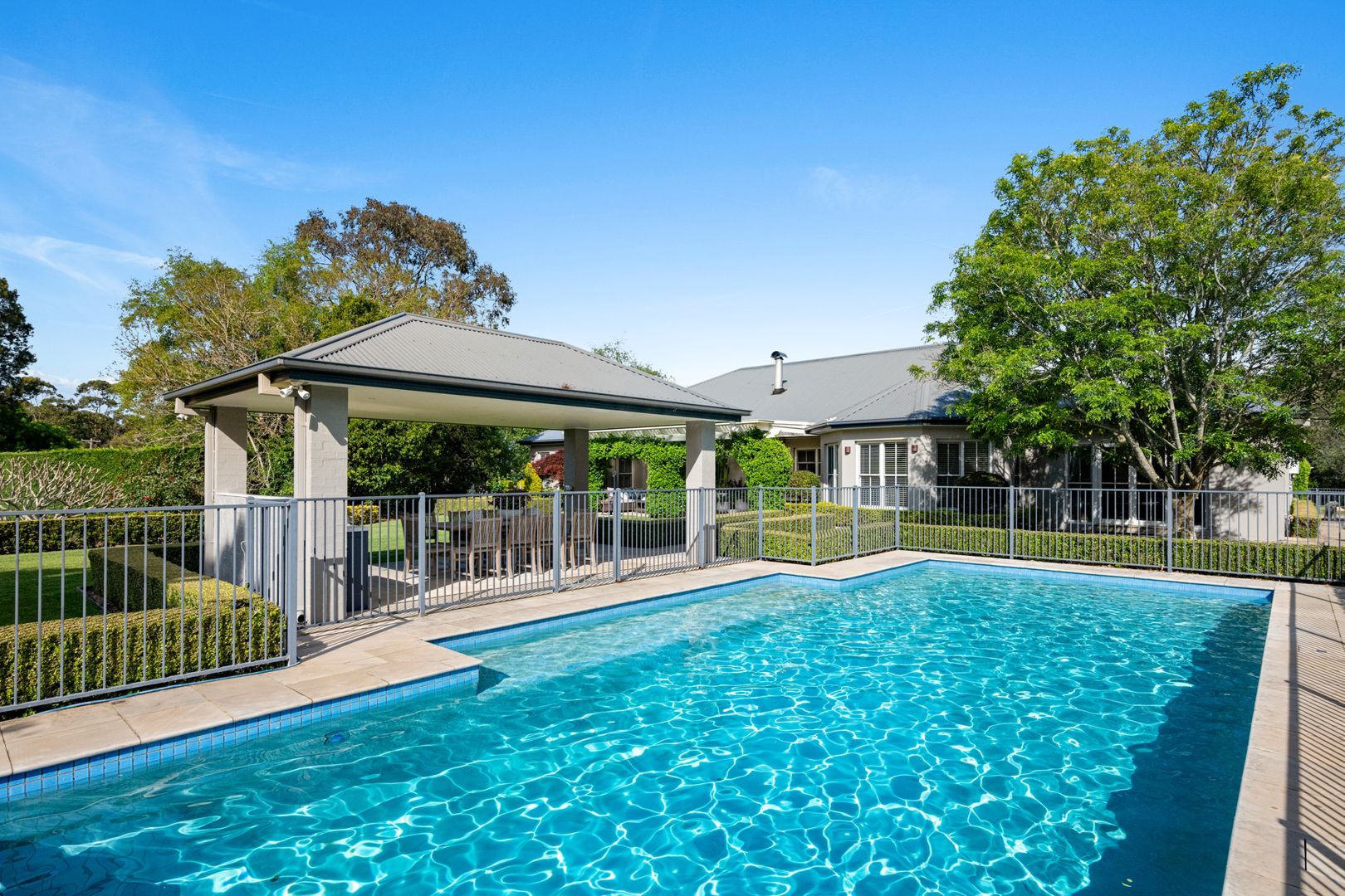 The gardens are beautifully arranged with English country-style hedges and complemented by select trees, including Jacarandas, a giant frangipani, palms, and an orchard grove featuring lime, orange, mandarin, nectarine, and olive trees.