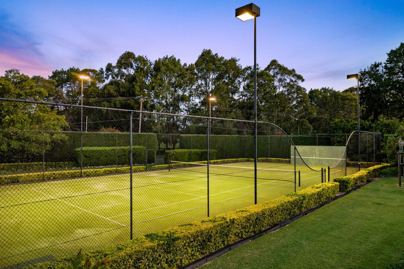 Occupying a private corner setting with additional vehicular access to the rear gardens via Larool Road, the grounds feature sprawling, near-level lawn areas ideal for children's sports, play, and exploration. The sparkling pool is overlooked by an entertainer's cabana fitted with a barbecue and double-fronted glass wine fridge, and the championship-size north/south tennis court is equipped with floodlights and a practice hitting wall.