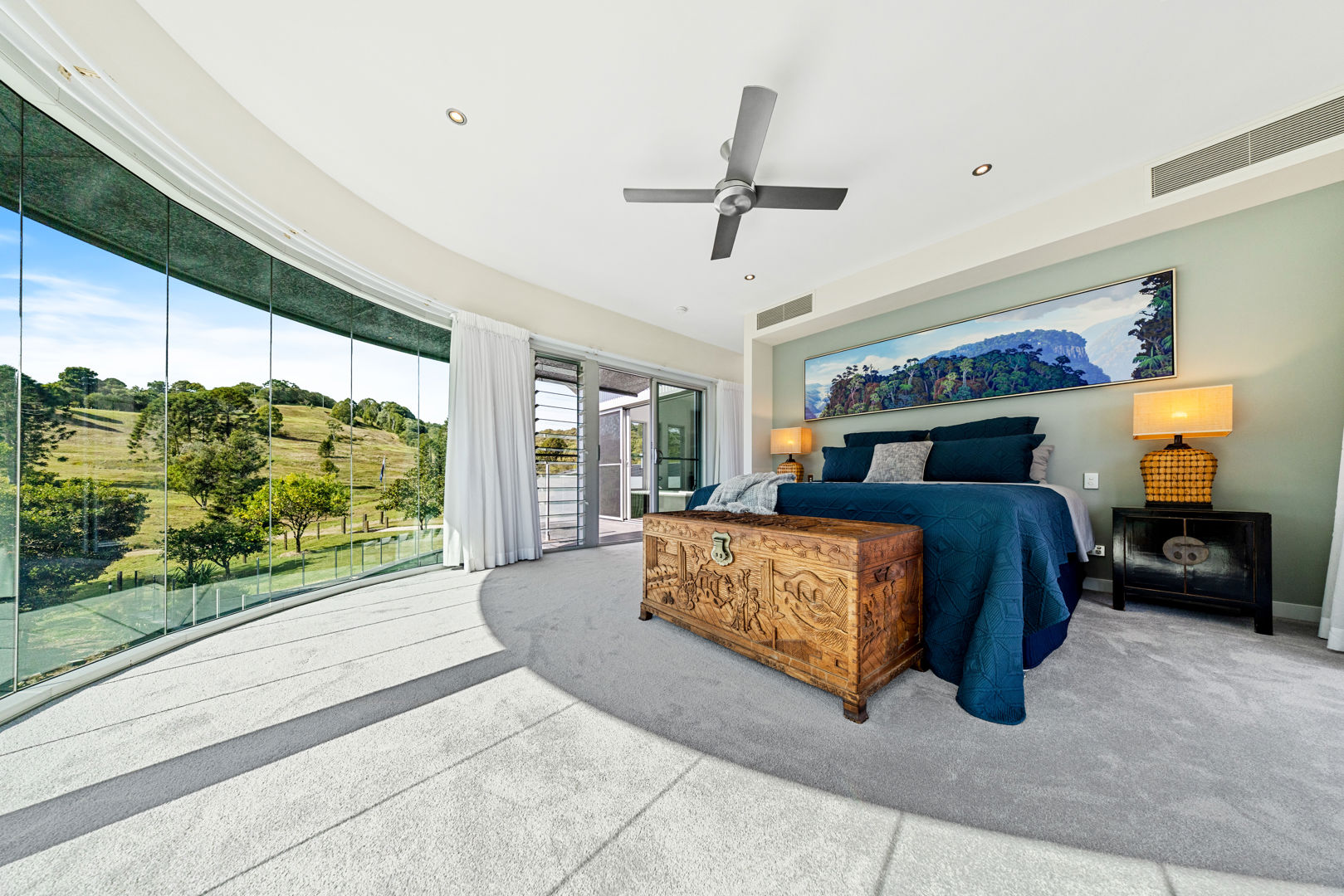 The principal residence draws inspiration from the timeless principles of modern organic architecture, in the spirit of Fallingwater. Strong horizontal lines, wide overhangs and cantilevered decks appear to float above the landscape, while expansive panes of glass frame the natural theatre outside. Every vantage point captures a unique aspect of the setting, from the gentleness of flowing water to the stillness of rainforest canopy, weaving the sounds and sights of nature and rural life into the fabric of the home. Inside, warm timbers, honed stone and tactile finishes create a seamless dialogue between indoors and out, shifting in character with the light and seasons.