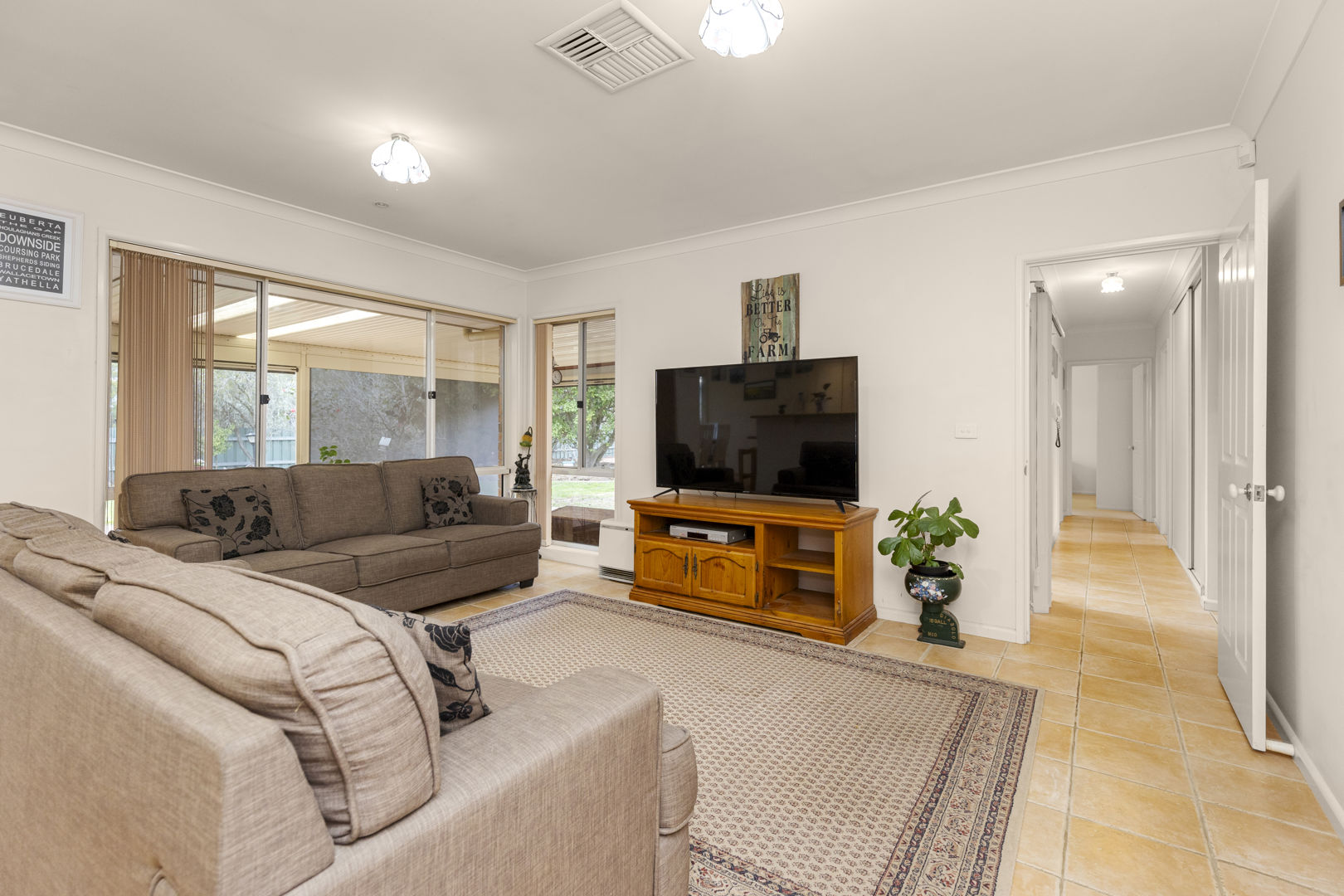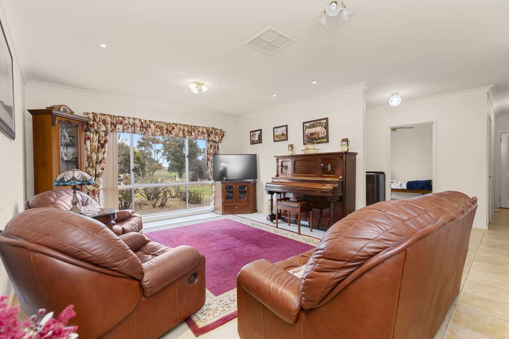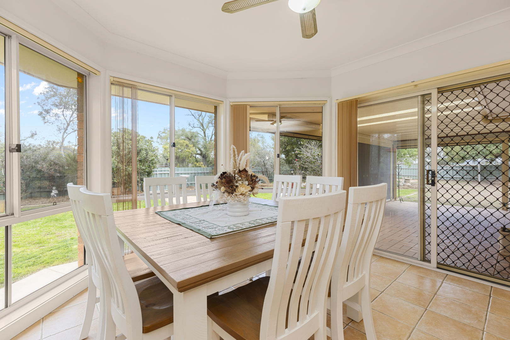 Esthervale features a large brick home with five bedrooms and three bathrooms, The home has two separate living areas and a contemporary kitchen that overlooks the dining space. The flooring throughout the main living areas is tiled, while the bedrooms are carpeted for comfort. The home is equipped with gas heating for warmth in winter and evaporative cooling for the summer months, and all five bedrooms come with built-in wardrobes.