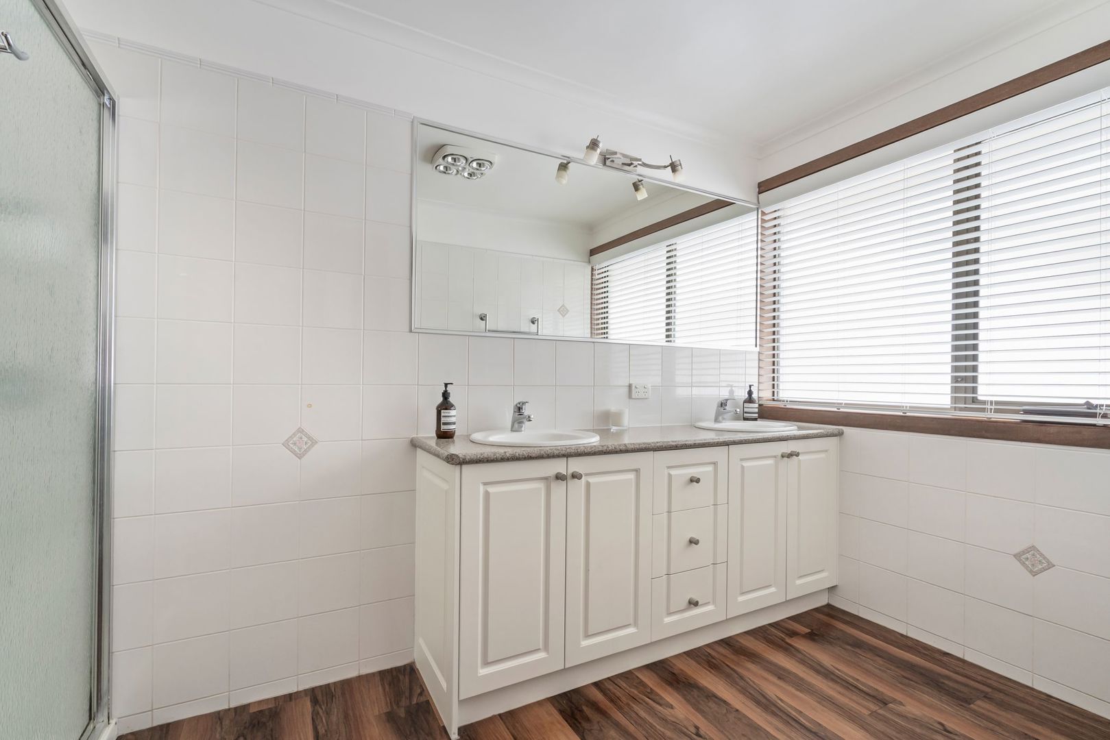 Main Bathroom: Modern floors, dual vanity with underbench storage, shower, and separate toilet.