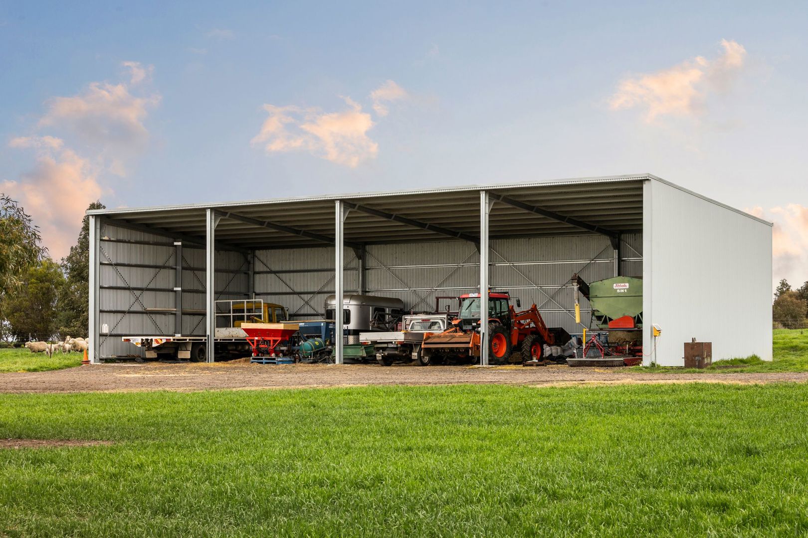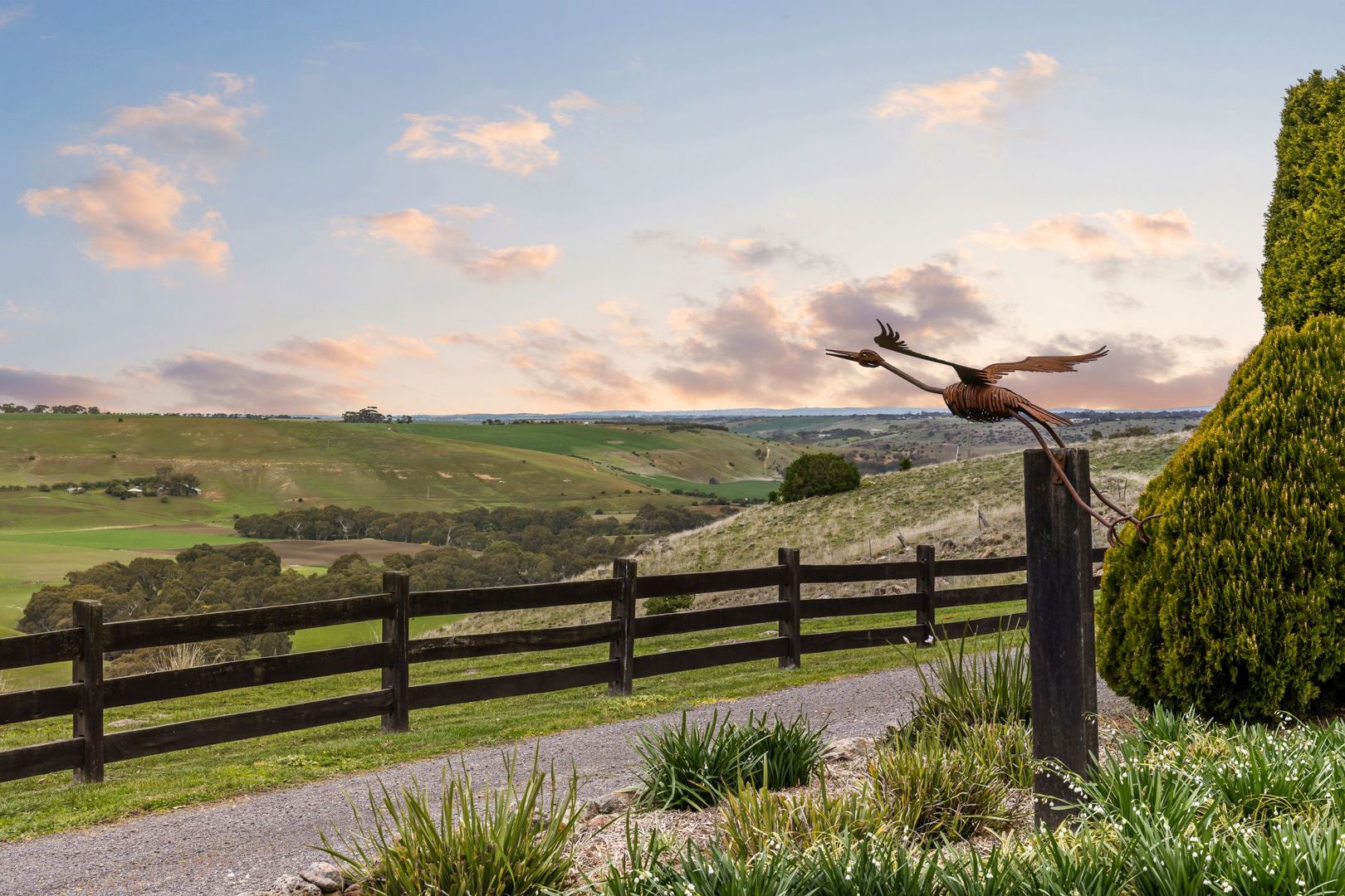 Outside: A perfect countryside setting with a circular drive set amongst established trees and undulating landscapes, the approximately 56.5acres of land includes a completely fenced in-ground pool, large four-bay machinery/hay shed(24x10m) with extended height, a shearing shed with adjoining (12x9m) holding station/shed, stock yard, rear dam, 13.5x5.5m standalone garden/wood shed, chicken coop, and a large open paddock perfect for livestock.