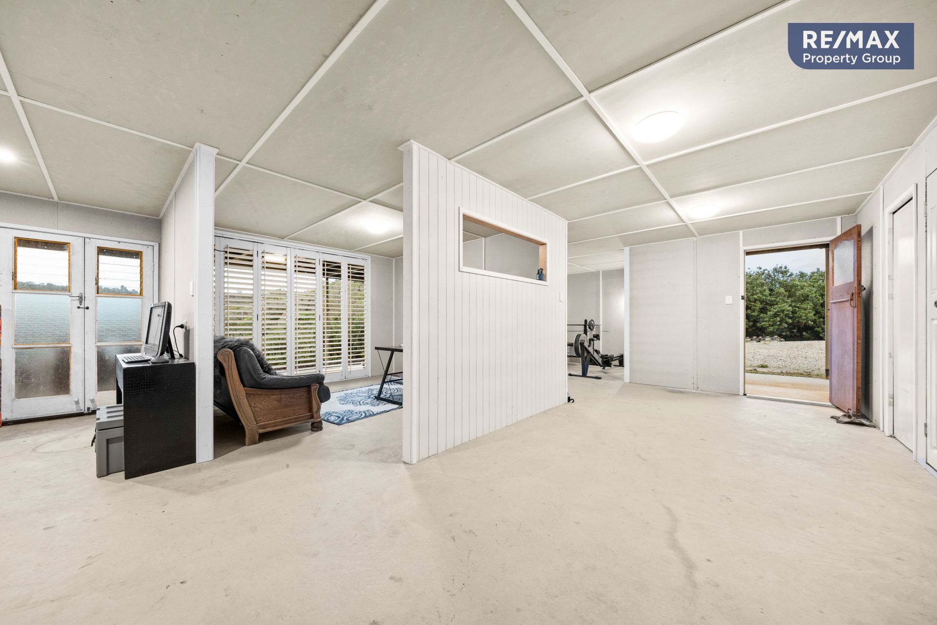 • Downstairs includes a lounge, bedroom (currently a gym), provisions for a kitchenette, full bathroom, and storage cupboards, offering excellent dual-living potential