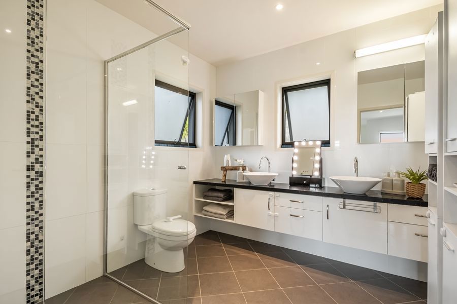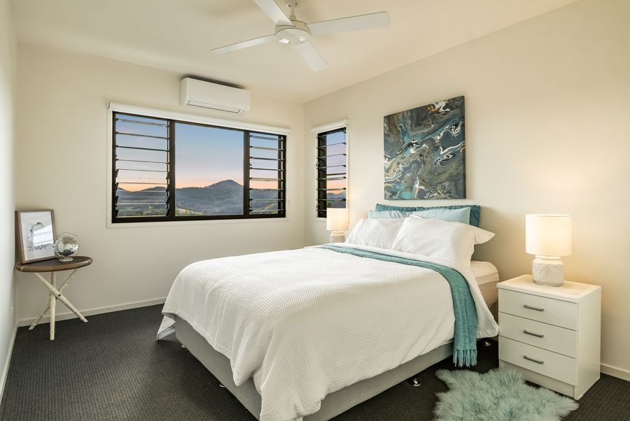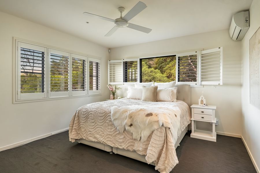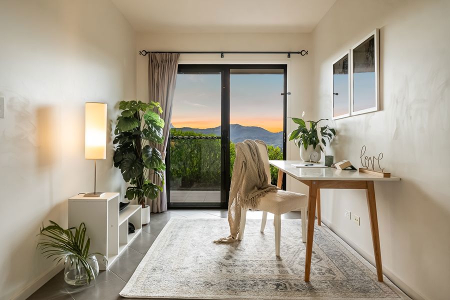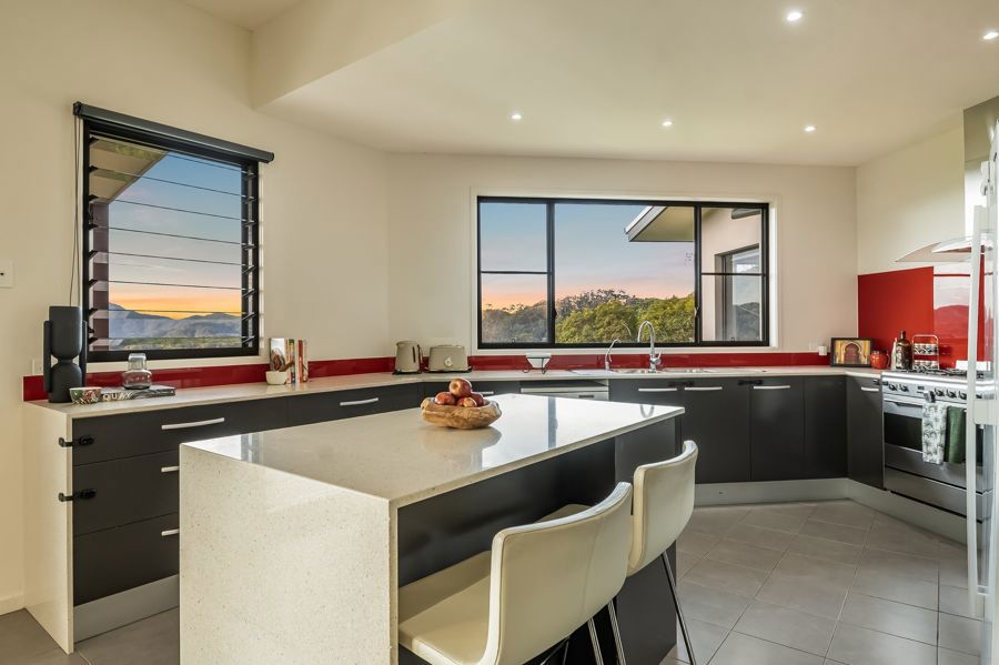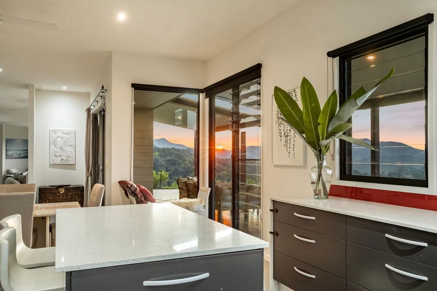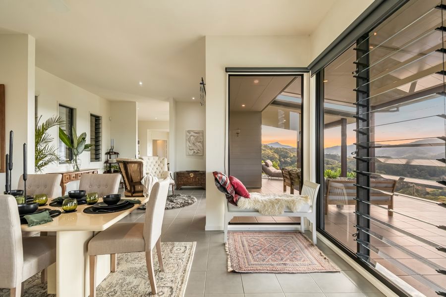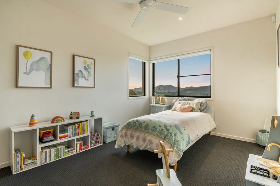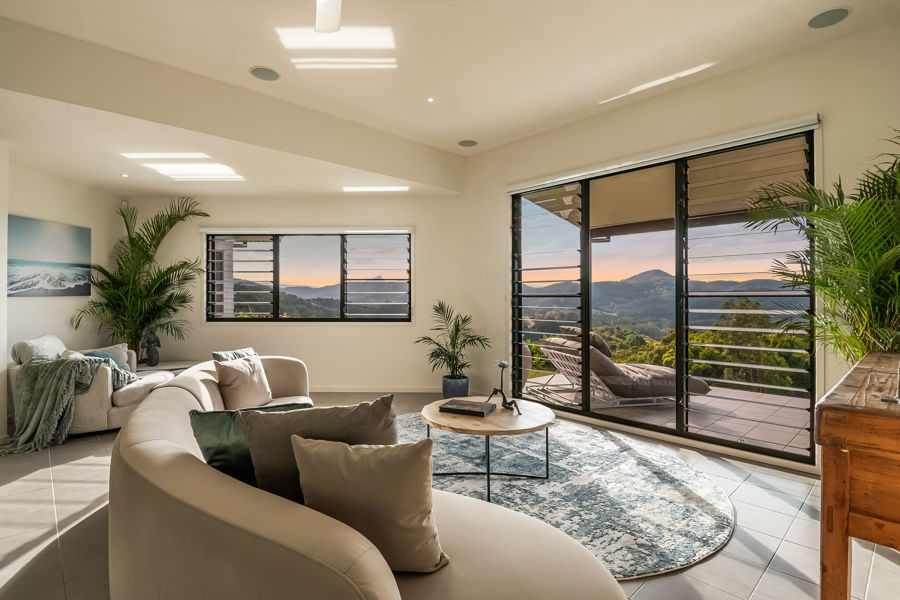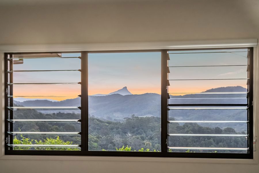 The home features four spacious bedrooms. The master suite is extraordinary: a double-sized retreat with windows on two sides, mountains one way, rainforest the other. Vast enough to fit two super-king beds, it offers a private sitting area, walk-in wardrobe and ensuite. Each morning you wake to soft light filtering through rainforest and the peaceful sound of birdsong, as if sleeping in the treetops.