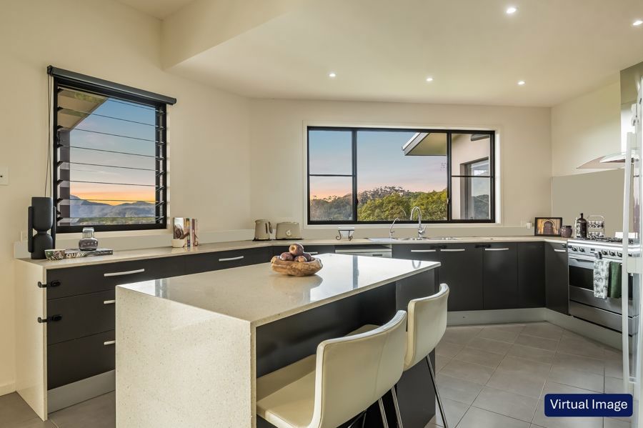 Out back, a second covered deck overlooks a fully fenced yard, ideal for pets, children, and relaxed BBQ afternoons in your green oasis. Tidy green lawns frame the house, while beyond them untouched rainforest cascades down the slope, creating a beautiful treetop vista with little maintenance required.