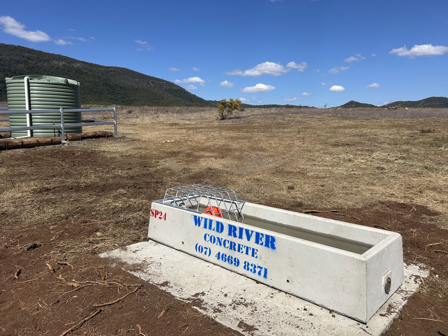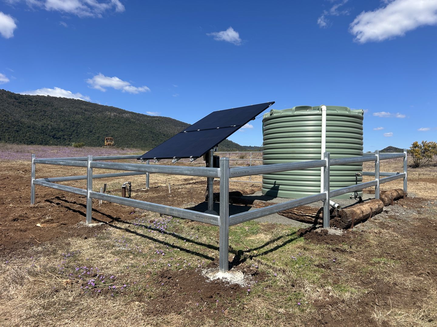 - 10,000 litre tank on crusher dust base and concrete trough on concrete pad installed at the bore site