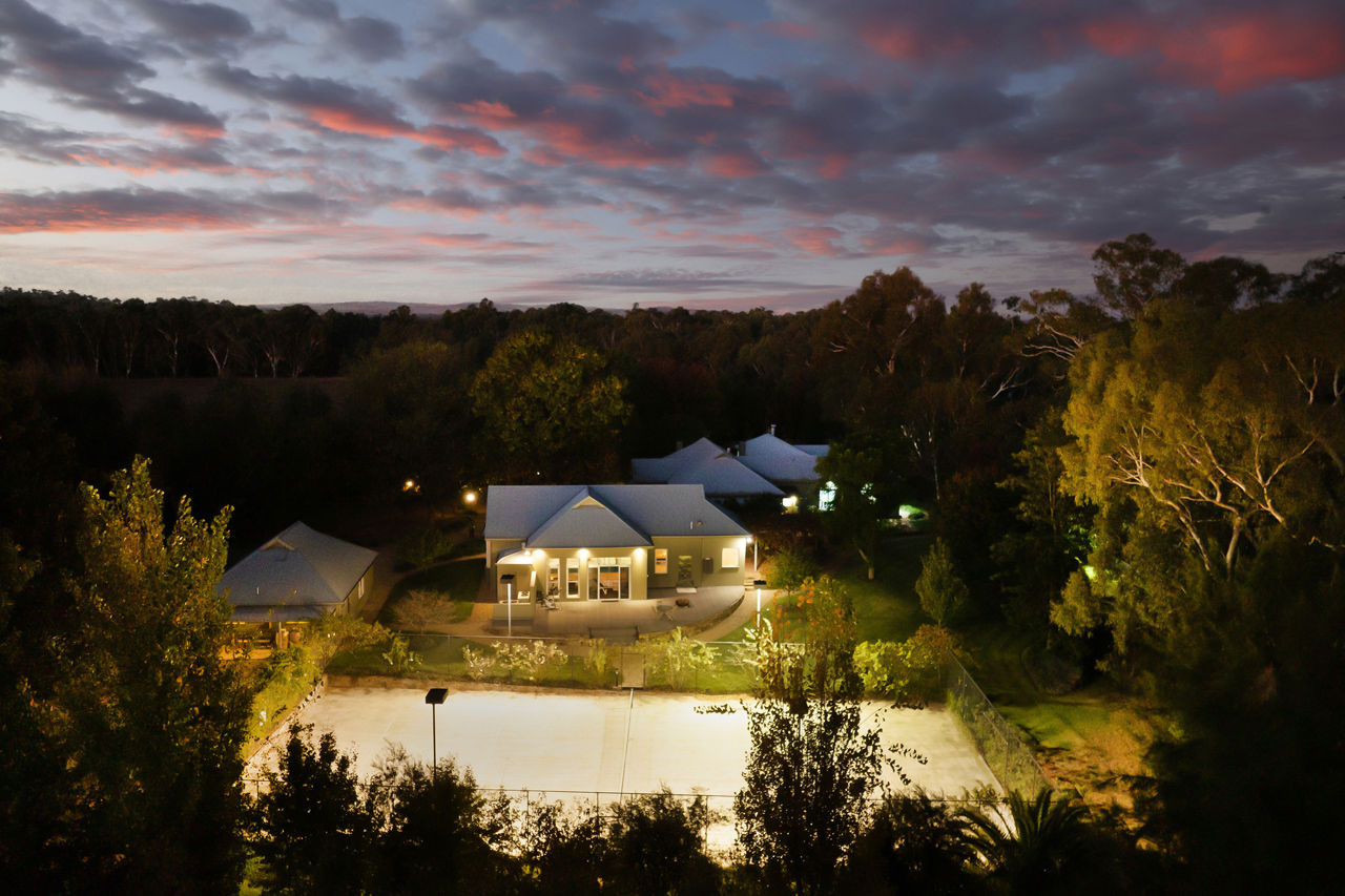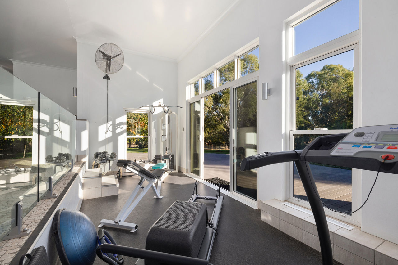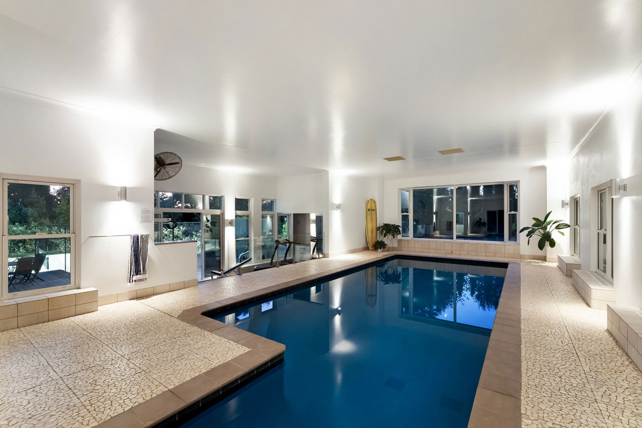 Indoor Pool House & Gym - This estate embraces leisure, recreation and options for outdoor living and entertaining. There is a separate de humidified building with indoor heated indoor pool and gym, offering year-round swimming and fitness in the privacy of your own home. The pool is currently heated via a heat pump system but also has gas provisions installed if you wanted to convert. There is also a floodlit synthetic grass tennis court with viewing deck, outdoor shower and central firepit. The perfect place for a relaxed meal or afternoon drinks.