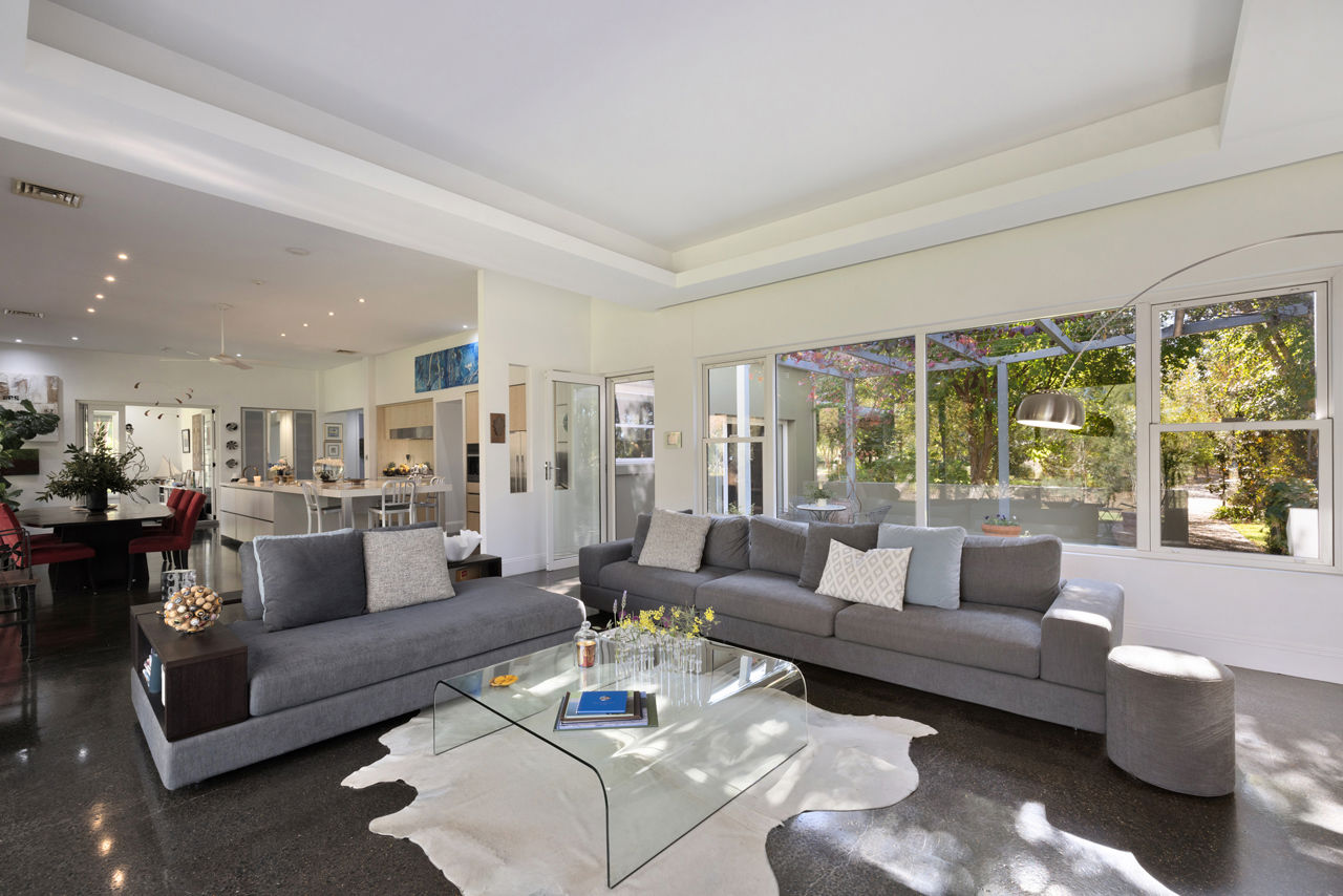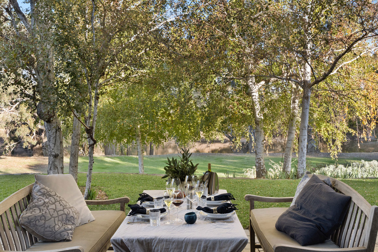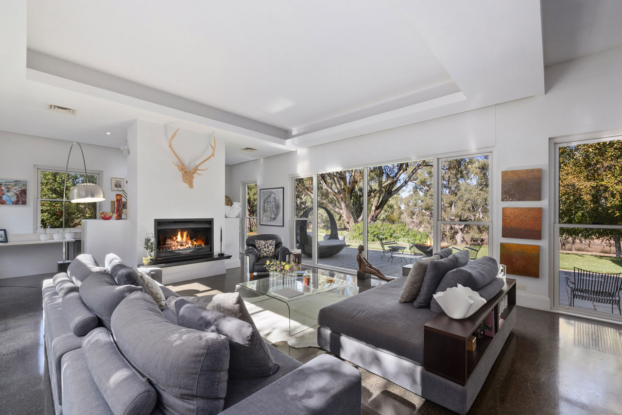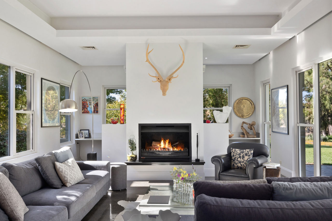 Floor to ceiling picture windows frame the views of the river and landscape, a seamless transition from house and nature. The homestead sits gracefully amongst the changing seasonal colours of the gardens and trees.