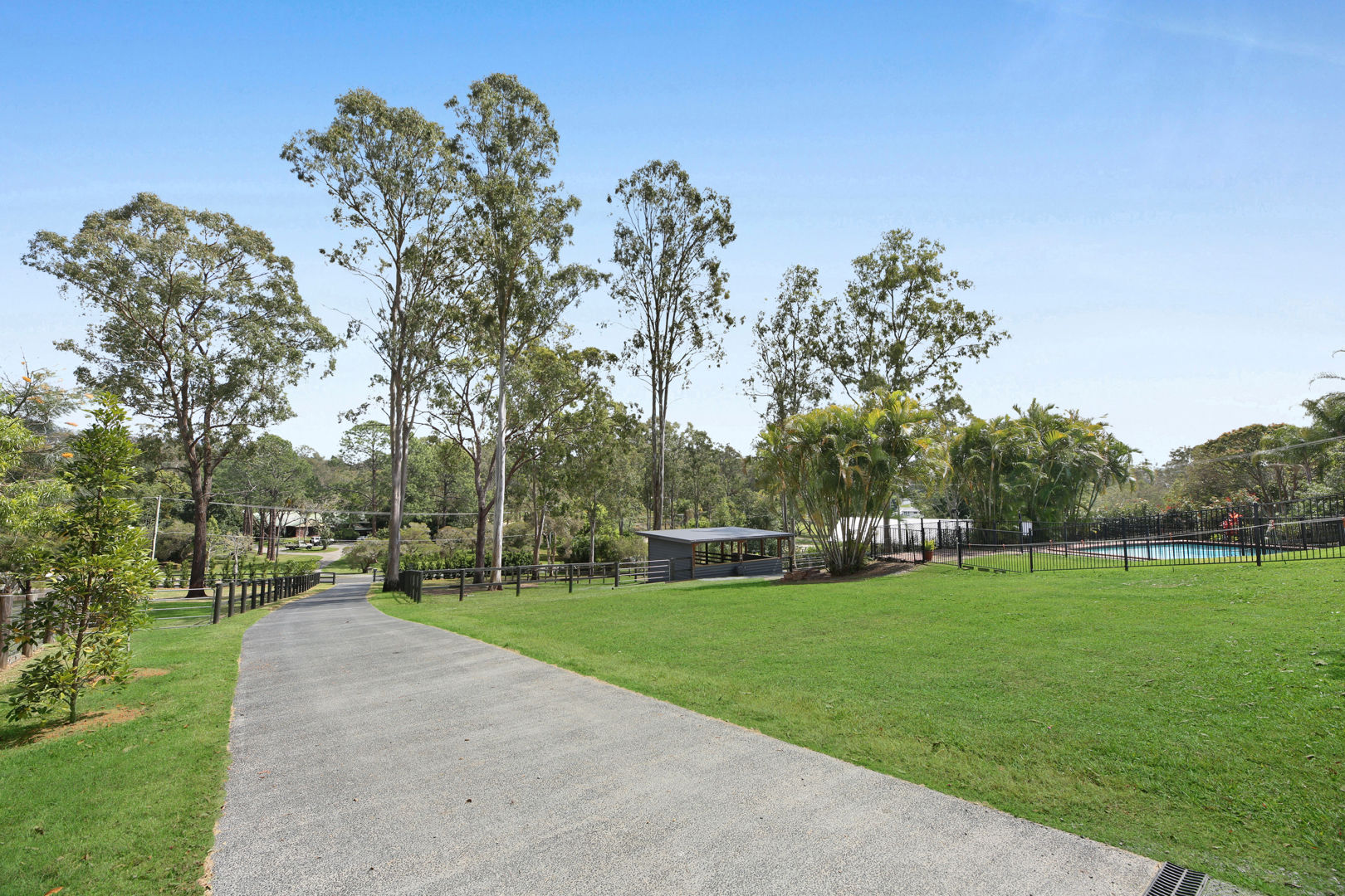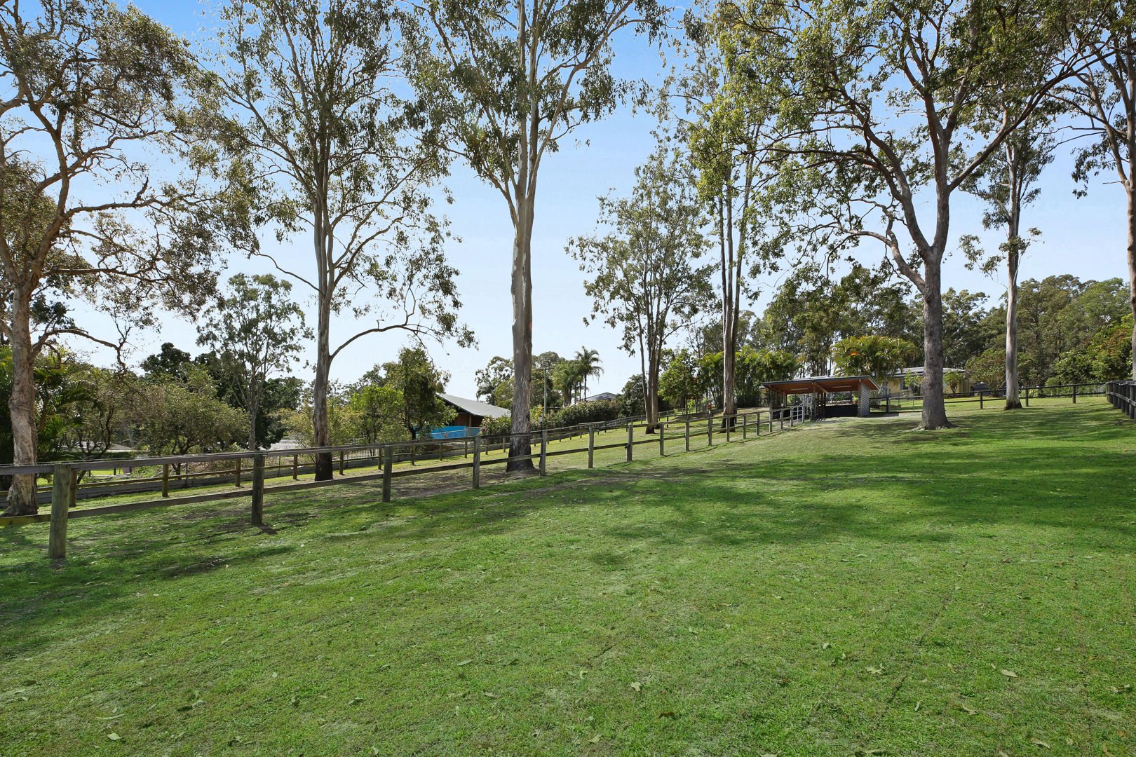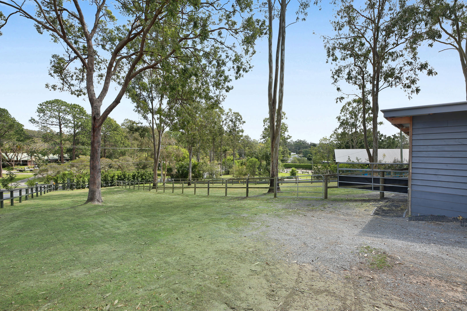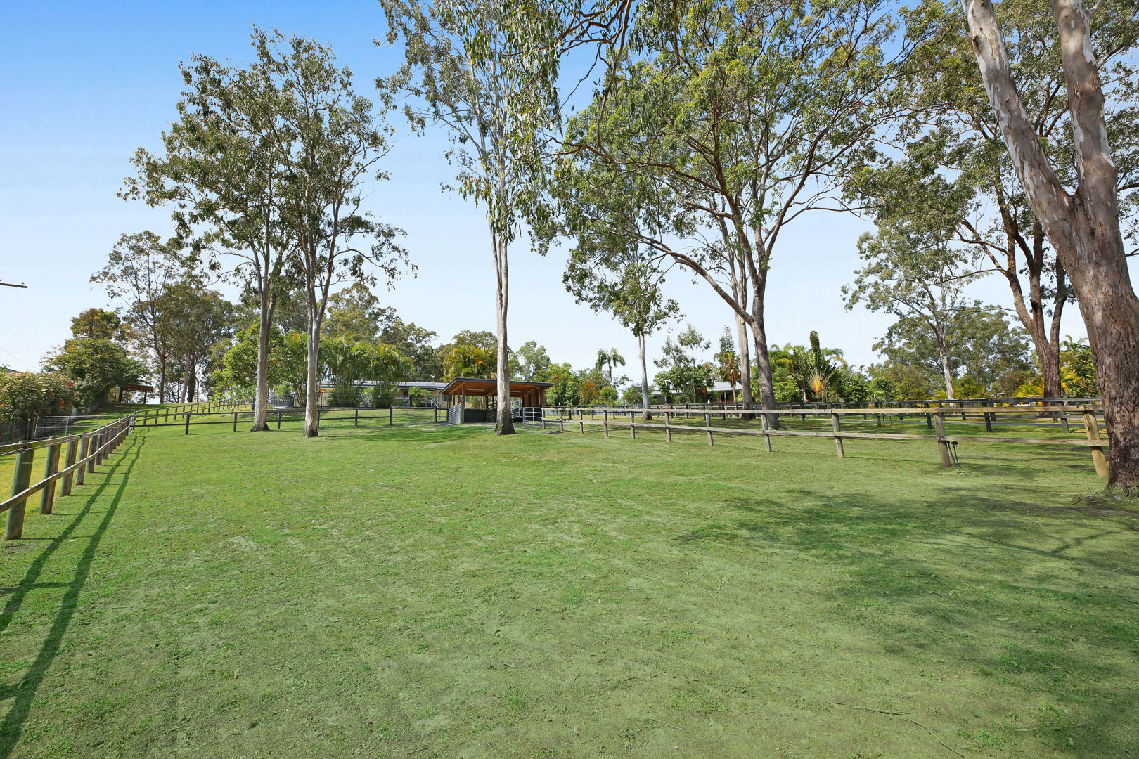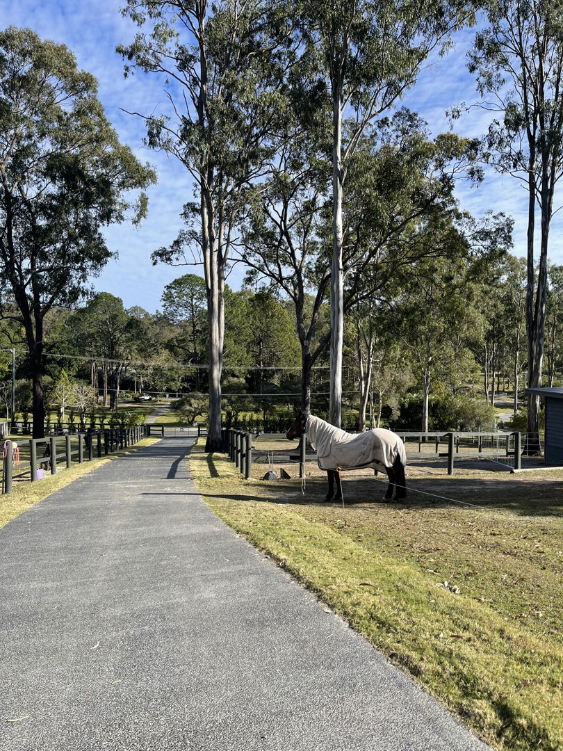 - A horse lovers delight: The property has been designed to accommodate horses, utilising all 2 acres to be able to have 5 generous paddocks, a smaller Shetland paddock, & have seasonal rotation, with equine grass seeding and fertilising. Entire property is fenced, equine mesh used, and quality wooden post and rail fencing installed. Stables specifically designed with careful thought to keep water out, keeps hooves dry with a fitted rubber base, can be used to stable overnight, and built to stand the test of time! The crusher dust base (instead of concrete) was engineered to have a base that is gentle on horses legs, and drainage was also installed so the stables are never damp. Further shelters are placed in the other paddocks at the side and rear of the property. The round yard has a sand base; the 50 x 18 arena was left as a grass base to offer added paddock space when needed. The shelter for the float doubles as a stable, can be split in 2, and access to parking the float is driving straight into the shelter. Another large shelter in the side paddock is very convenient & built to house horses in a premium shelter. The main front paddocks, and rear arena/paddock have automatic sprinklers. Water is accessible at all points and paddocks on the property. Star picket fencing has been used to extend front paddocks for day grazing and create paddocks at the top of the property. Horses can roam the property, or there are multiple horse gates to close off areas and separate horses as desired. Easy access for mowing and maintenance. Power & lighting have been installed in the stables, as well as a spotlight for the paddocks. A short 10-minute walk with the horses to the pony club, and all the fabulous Shows that the Mudgeeraba Show Grounds offer
