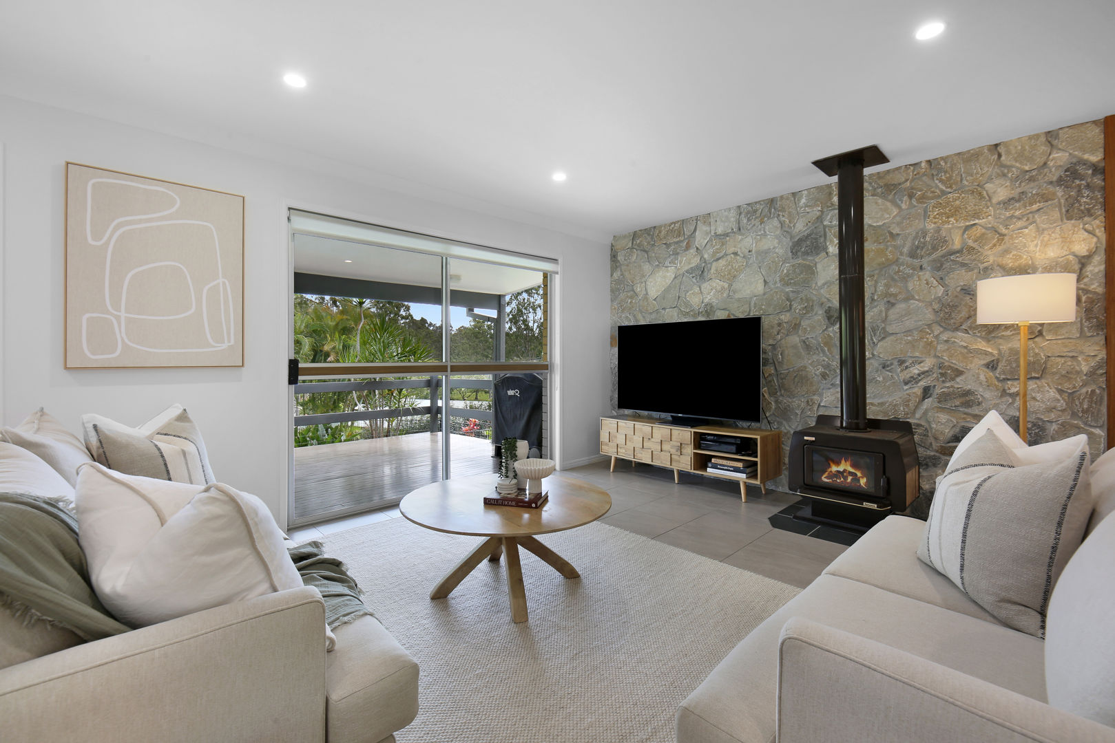 - Oversized lounge and living area with stunning exposed beams, cozy fireplace set against a stunning stone feature wall, air conditioning & serene views make it perfect for family relaxation