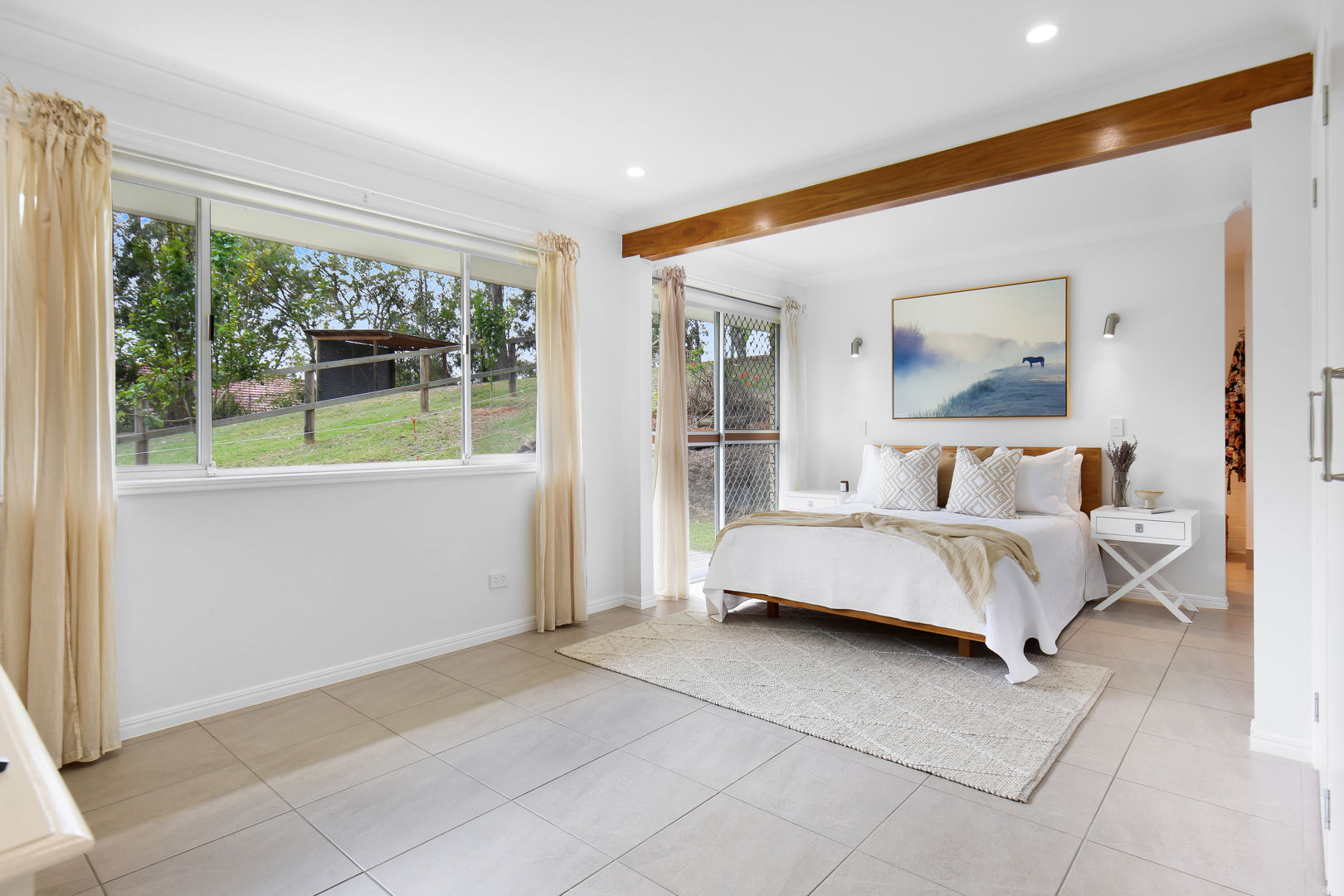 - Spacious master bedroom with exposed beams, built in robe, air conditioning, modern ensuite including stunning dual showers & high end finishings including stunning acreage backdrop