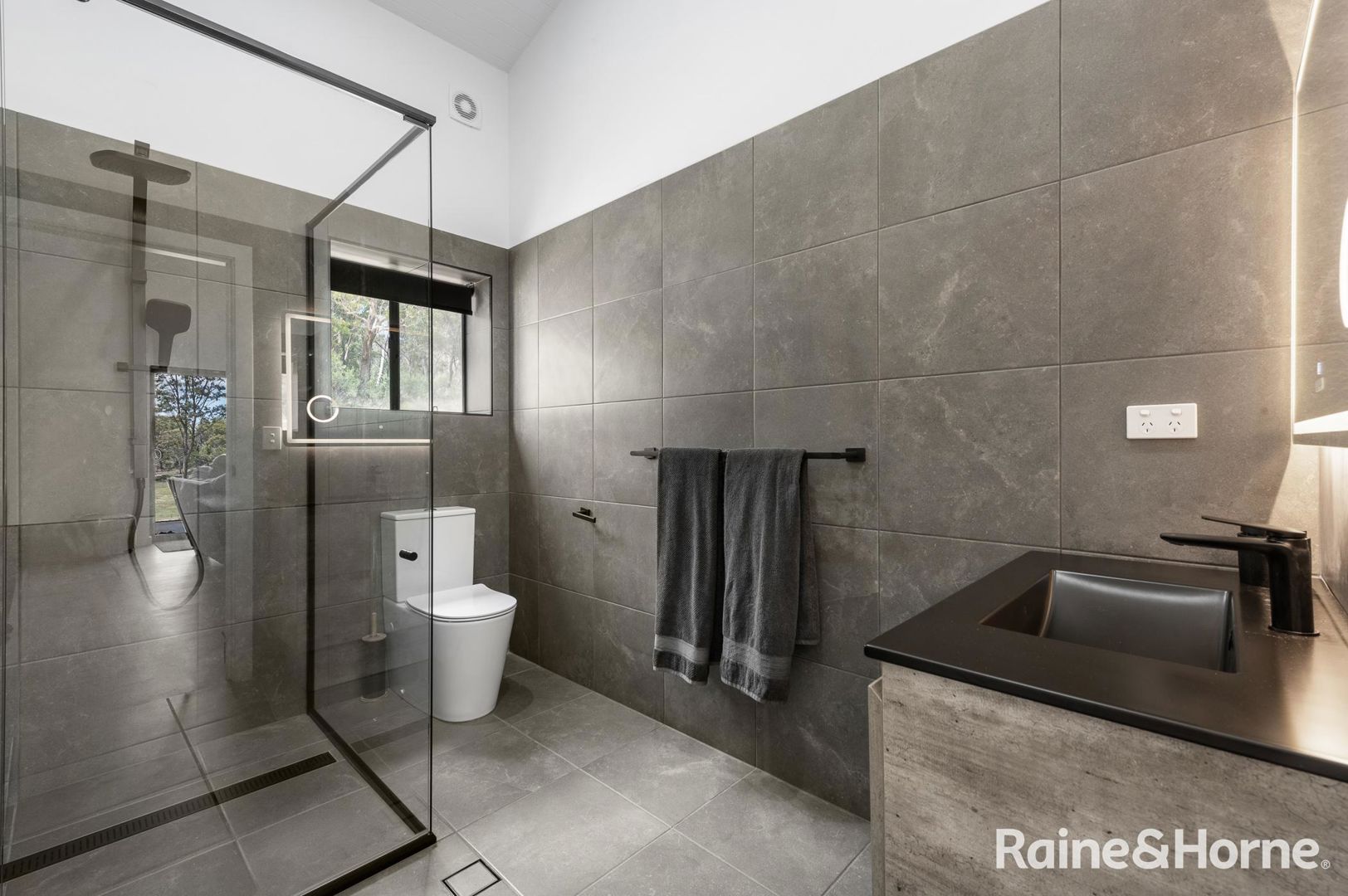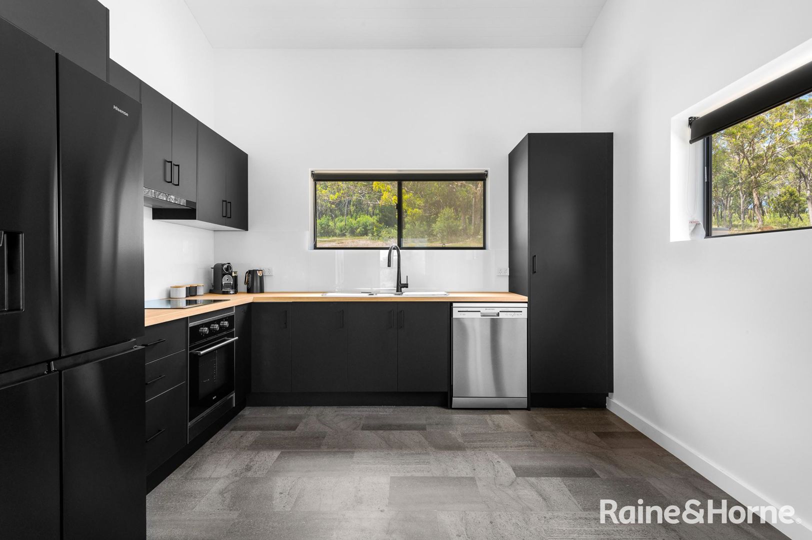 Step inside and be welcomed by a light-filled, open-plan living space with soaring raked ceilings, exposed timber beams, and expansive windows framing beautiful bushland views. The stylish kitchen features sleek black cabinetry, timber benchtops, and quality appliances, perfect for home cooks and entertainers alike.