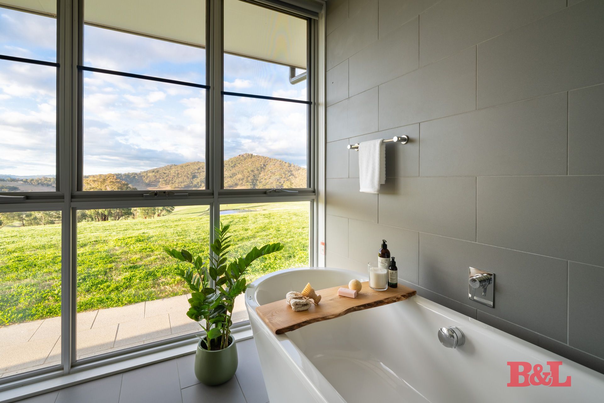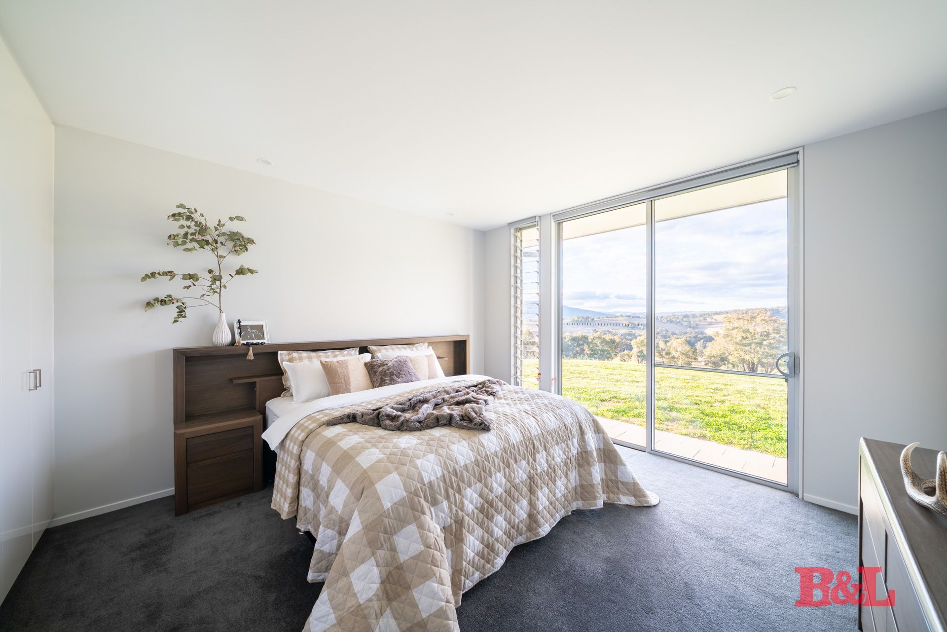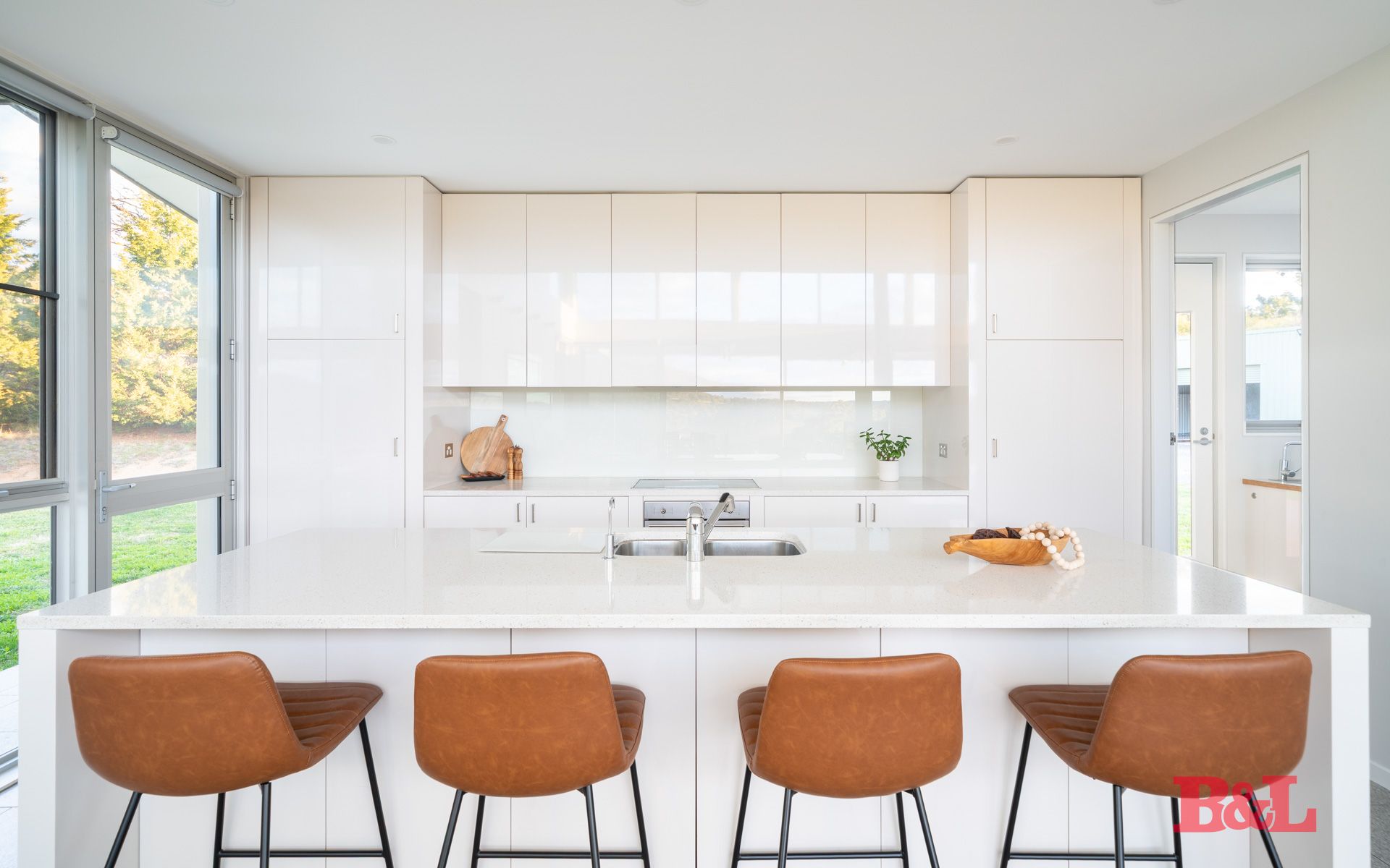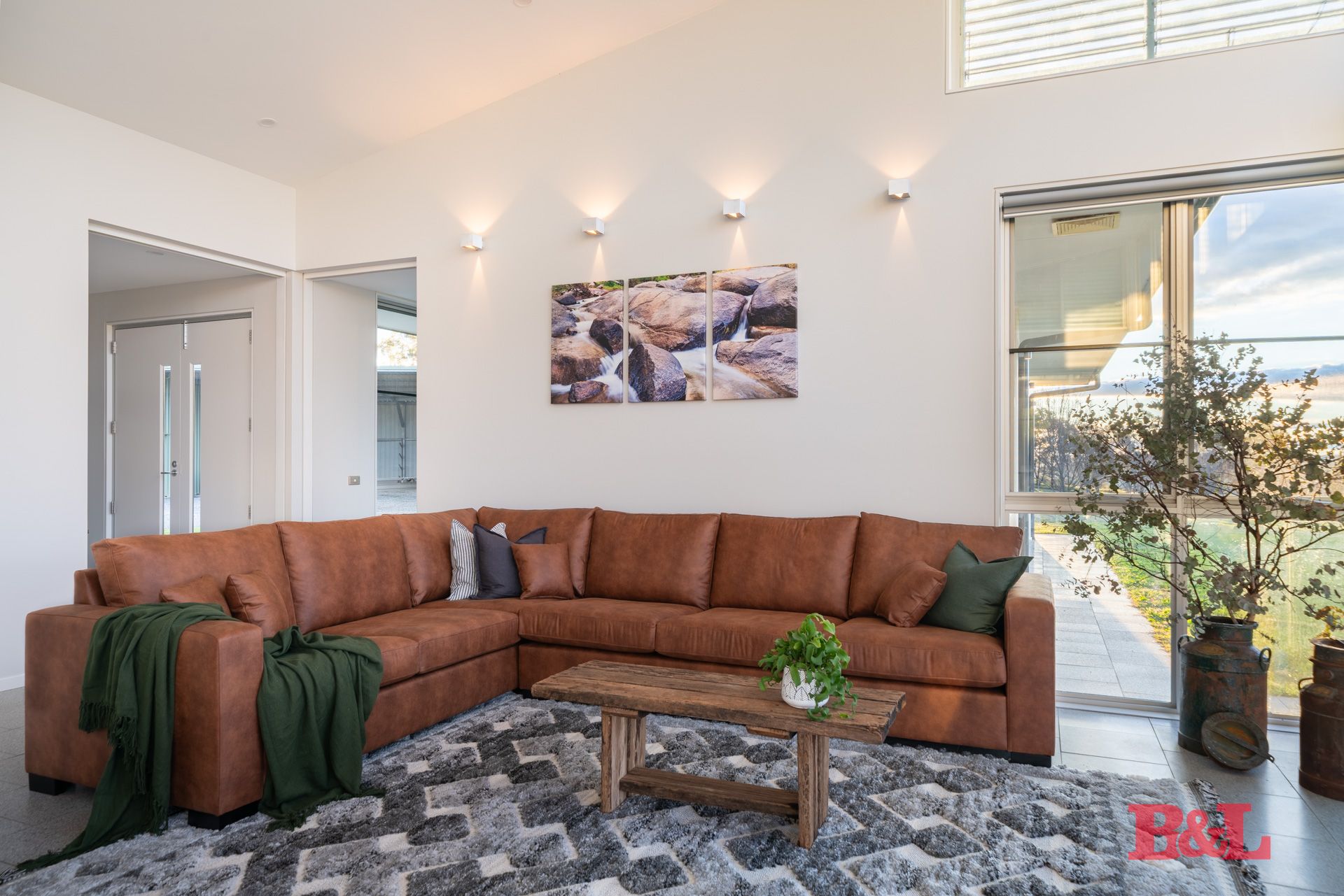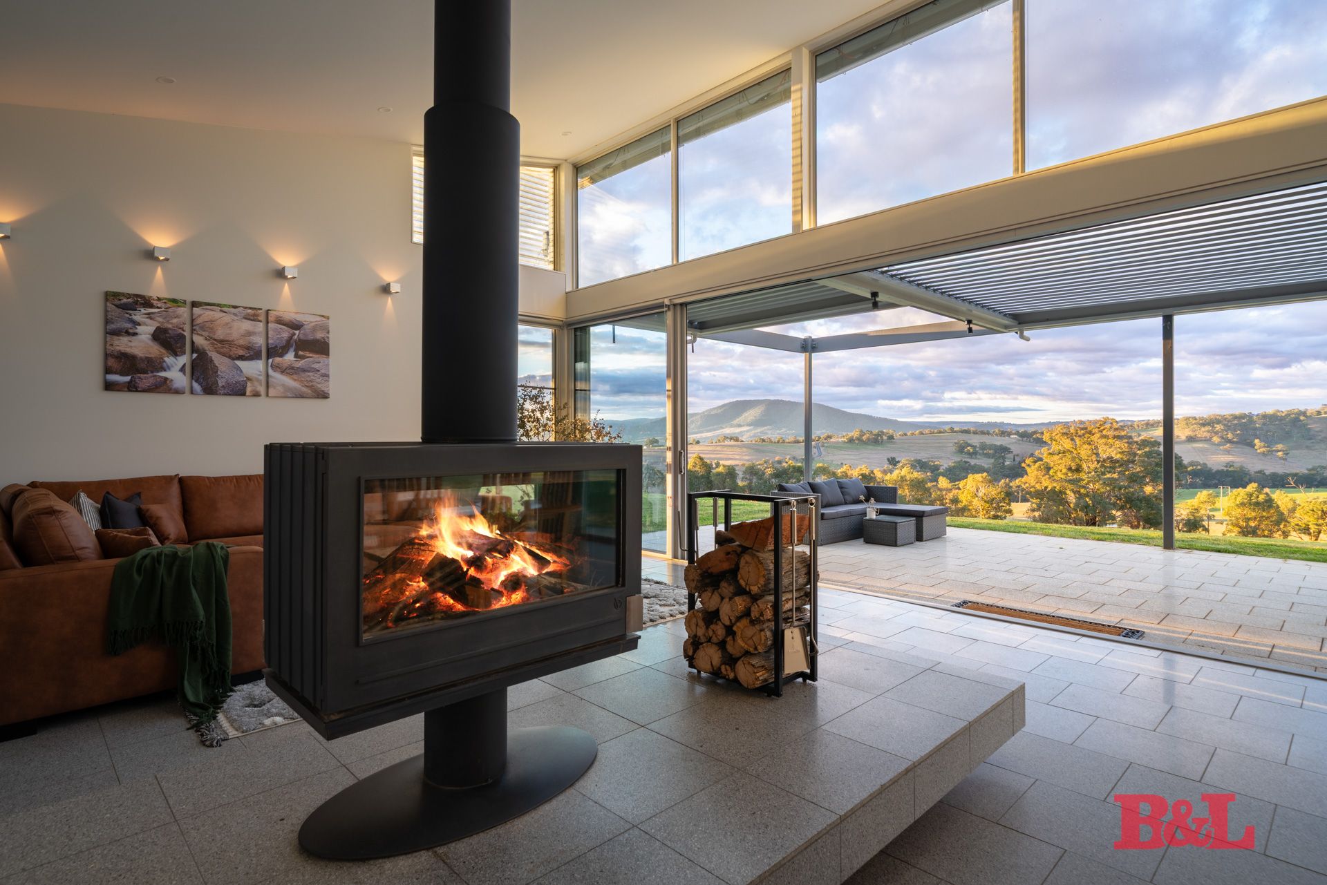 The four-bedroom residence was designed to embrace its northerly aspect, with every room taking in the light and outlook. Expansive open-plan living is centered around a double-sided slow combustion fireplace, complemented by a designer kitchen with premium electric appliances. The entire northern wall is finished with floor-to-ceiling glass, framing the panoramic scenery and opening onto outdoor entertaining spaces and a beautifully irrigated lawn.