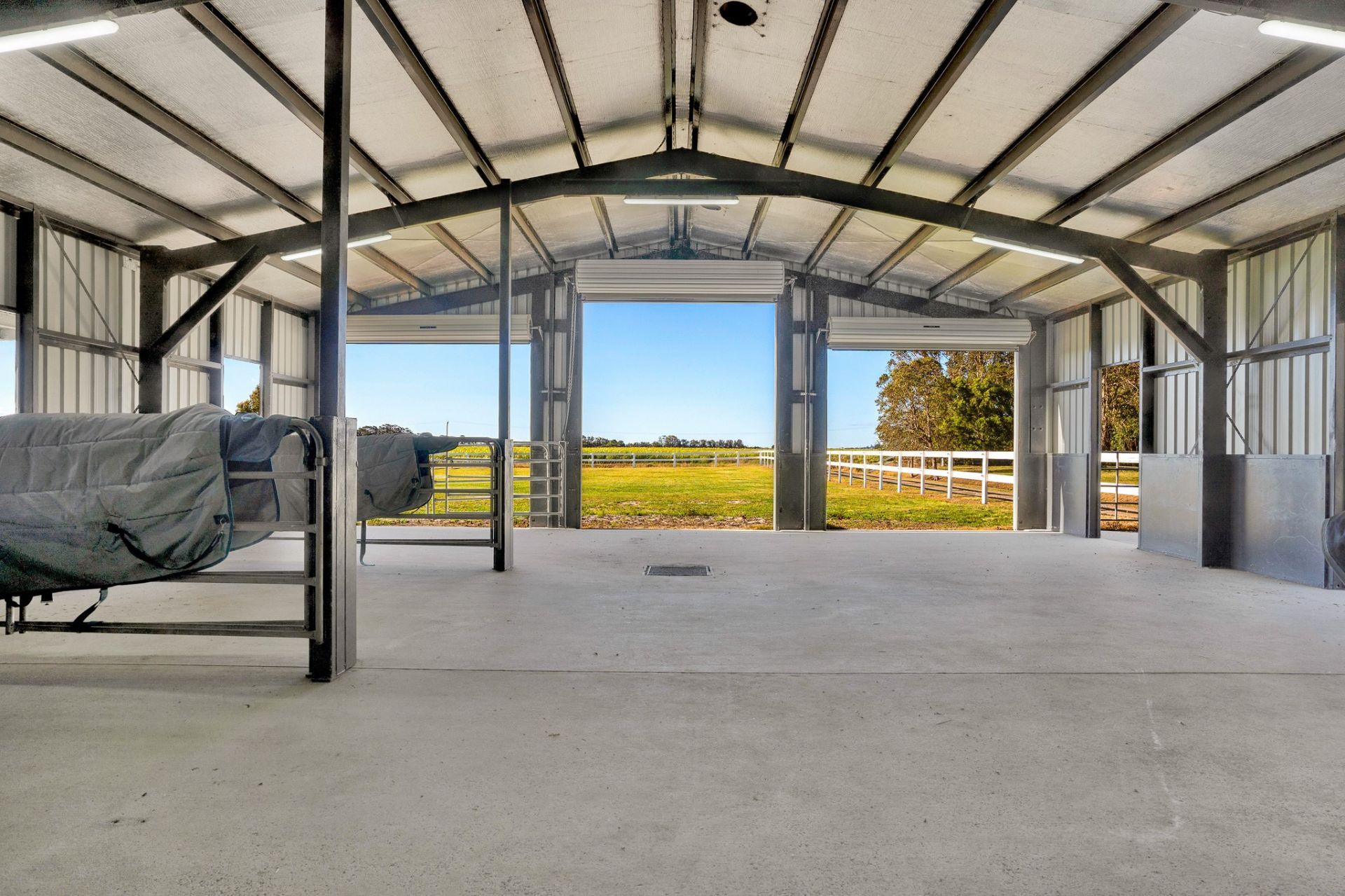 Equine facilities are exceptional, including premium CCA-treated hardwood fencing, mains-powered electric boundary wire, contoured drains for horse-friendly access, and a 16m x 12m stable complex with a 16m x 6m awning, hot/cold water, laundry, shower, and toilet. A sand hill on the property provides a continuous supply of quality sand.