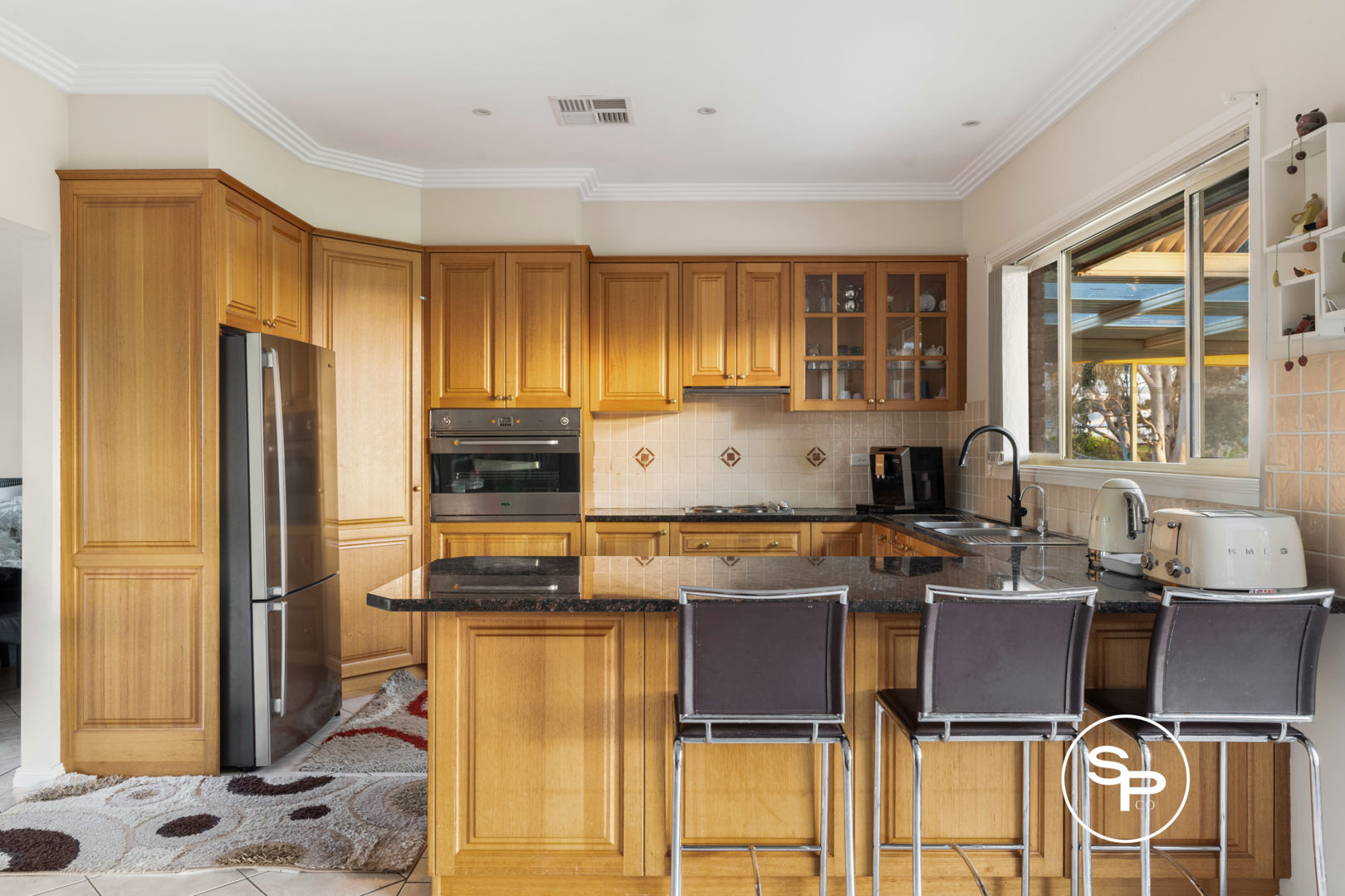 * Kitchen featuring stone bench tops, stainless steel appliances and ample storage