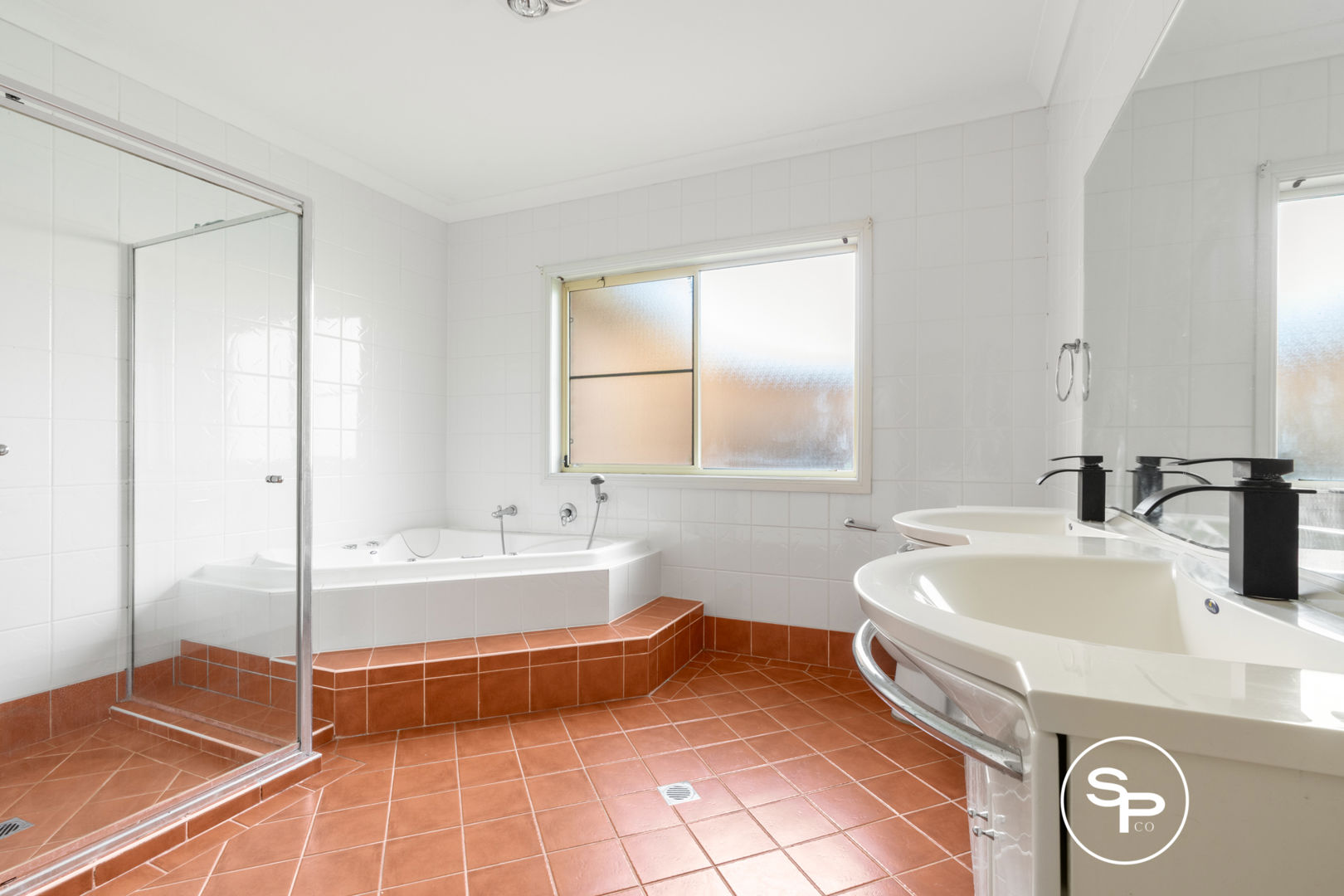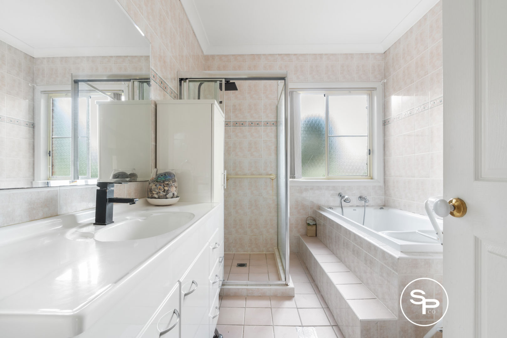 * Main bathroom featuring floor-to-ceiling tiles, dual vanity and spa bath