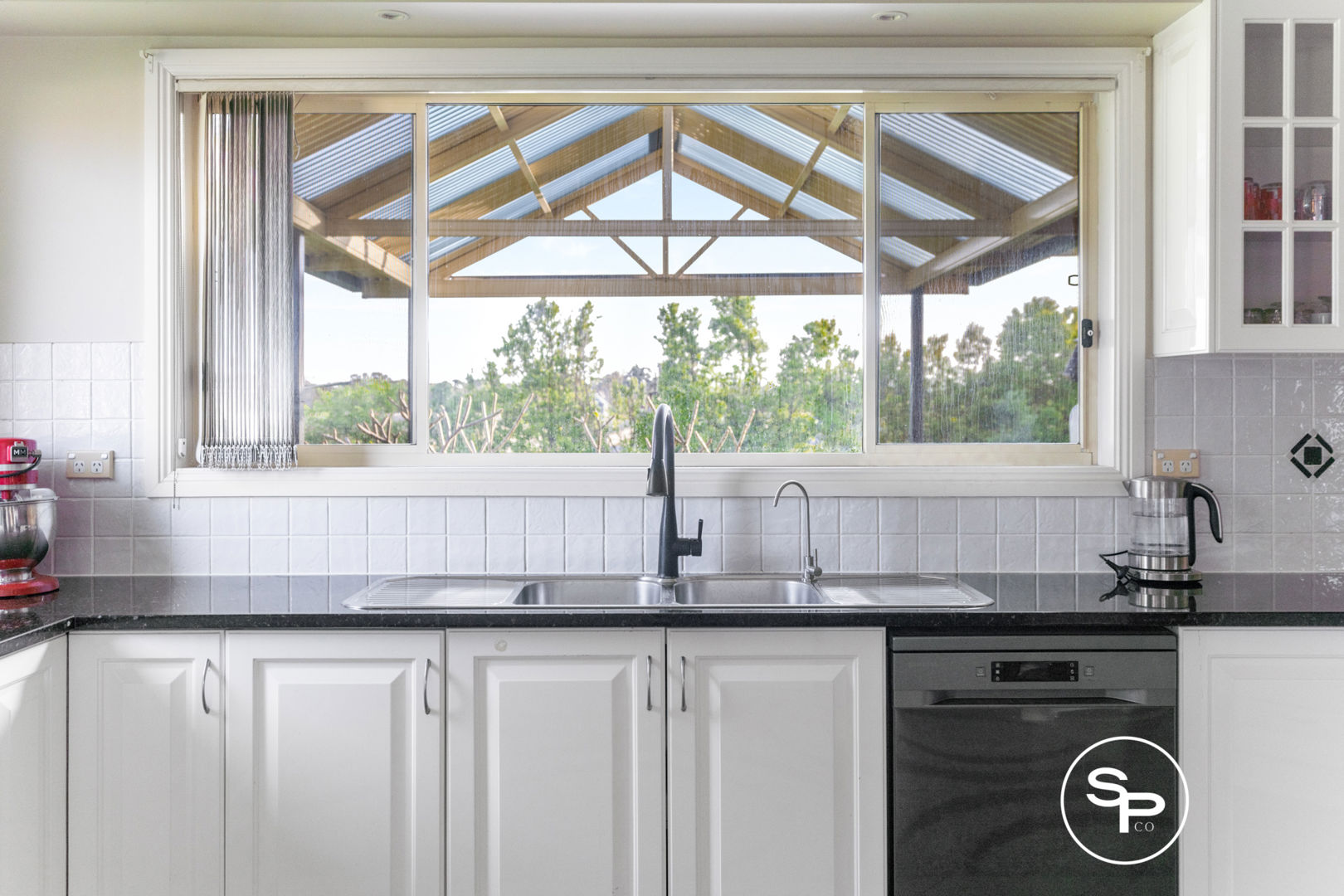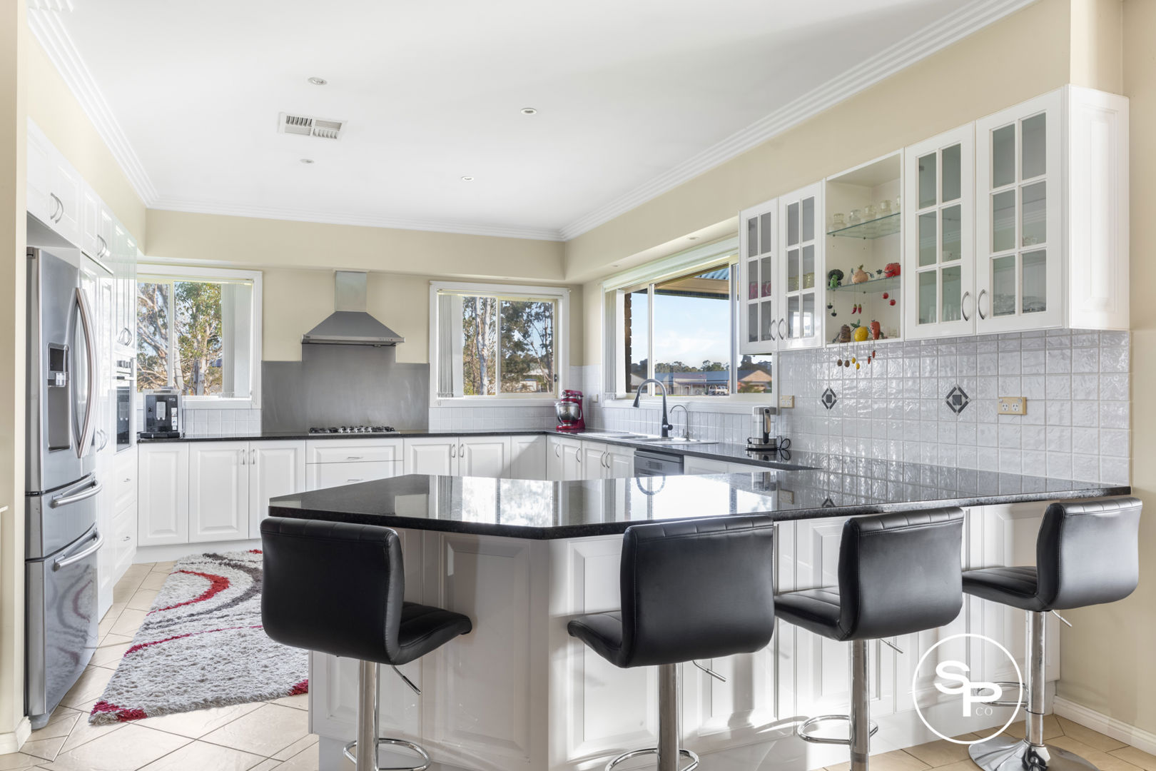* Modern kitchen featuring stone bench tops, stainless steel appliances and ample storage