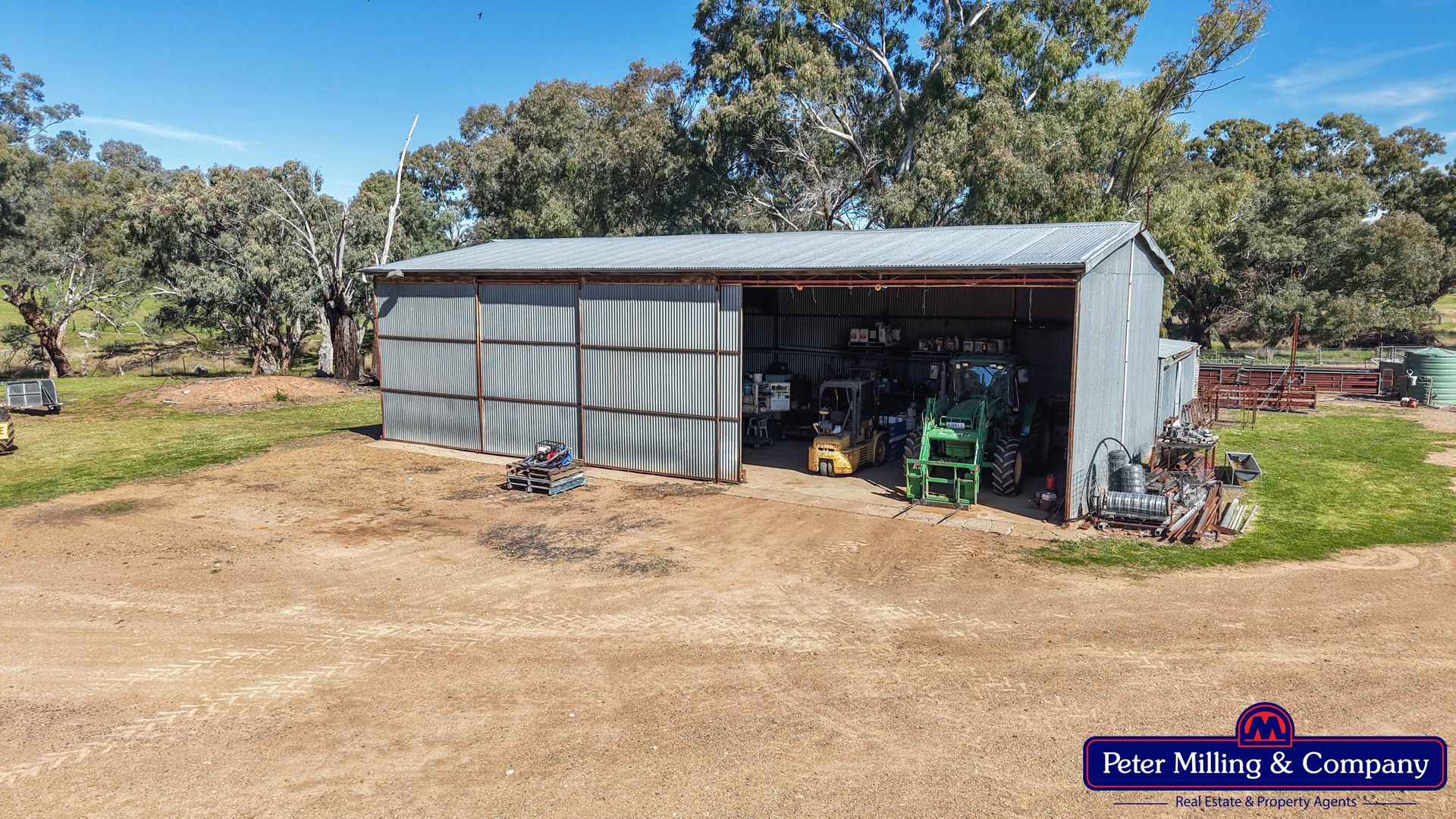 • Steel-framed enclosed machinery shed/workshop: 60' x 40' with concrete floor, power, and sliding doors.