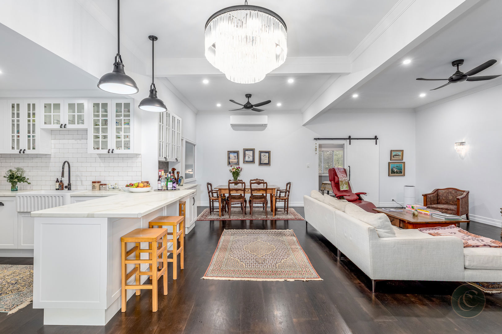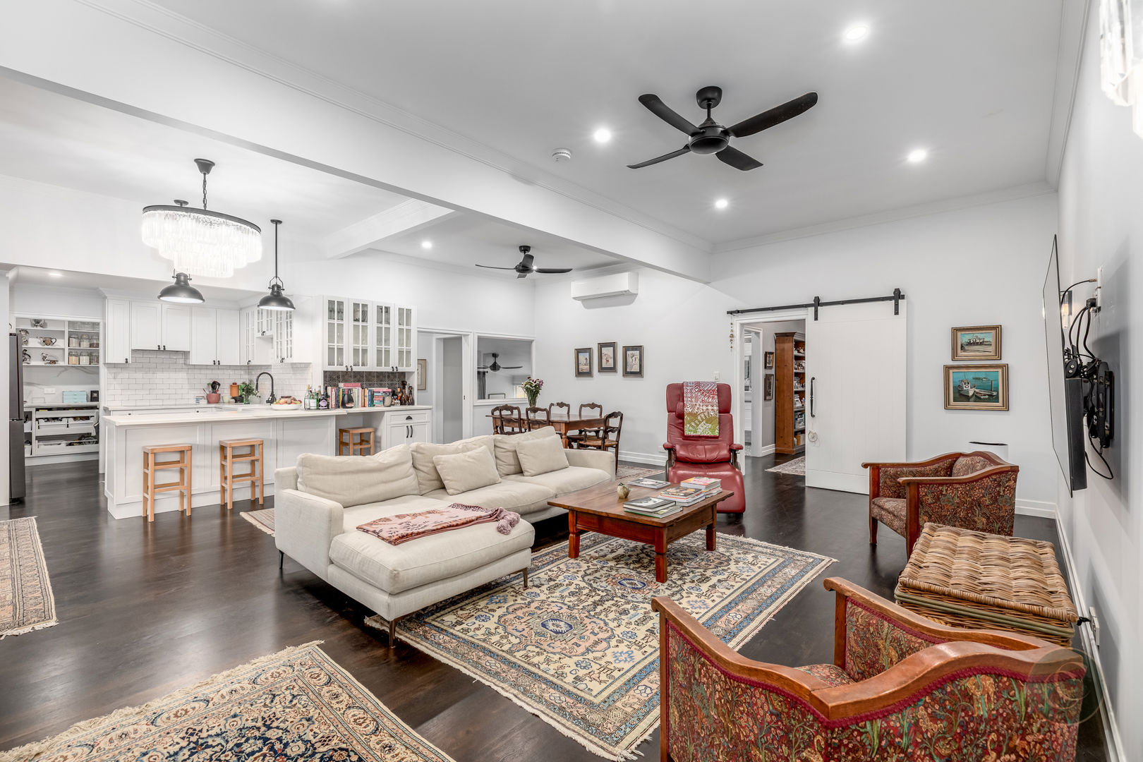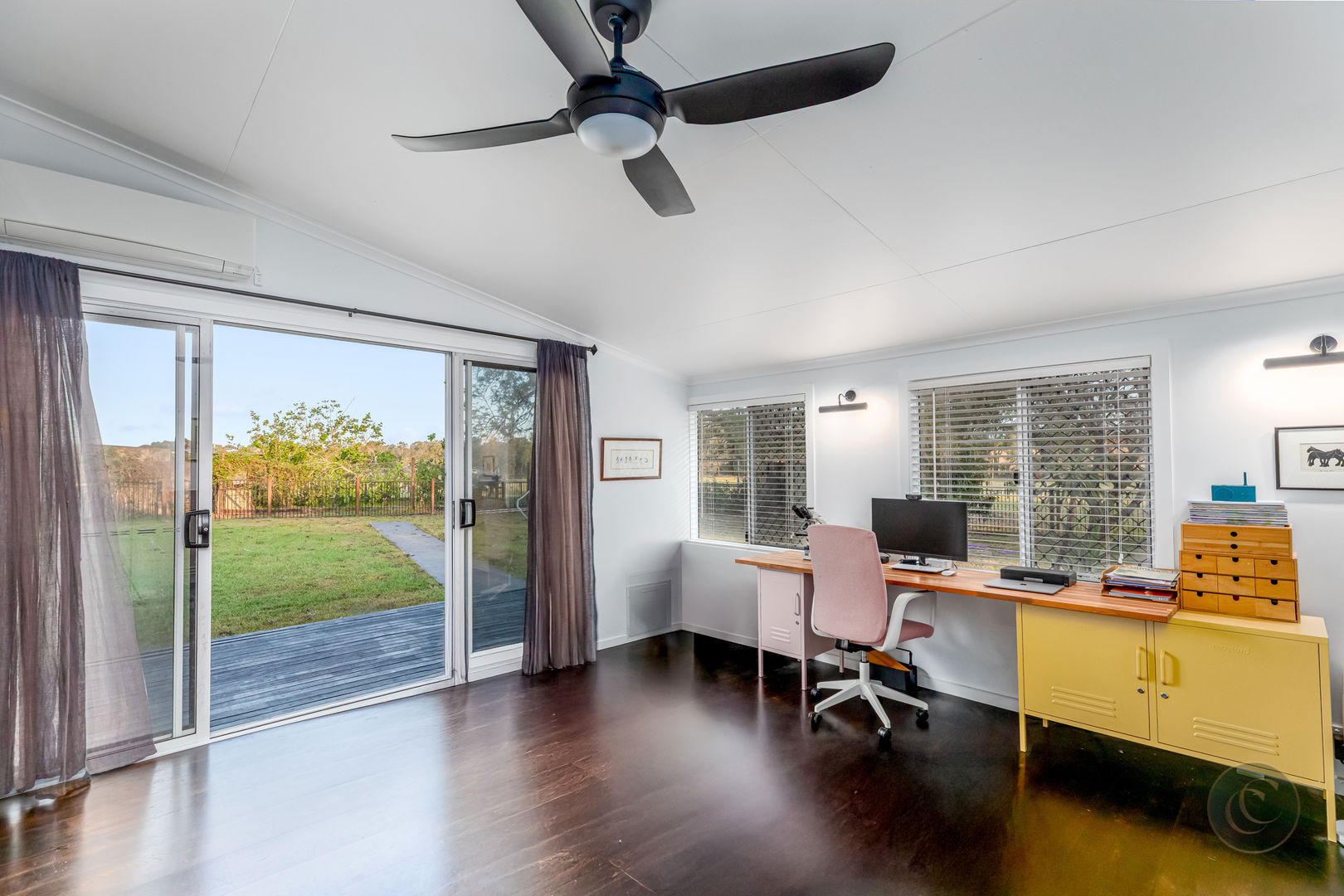 Accommodation includes three spacious bedrooms, all with air conditioning, ceiling fans and built-in wardrobes. The master suite is a serene retreat featuring a barn door entry, soaring ceilings, a large walk-in robe and a modern ensuite. There's also a light-filled home office with sliding doors that lead directly to the back garden, offering a quiet and inspiring place to work from home. Practical features such as Crimsafe screens on external sliding doors, a secure enclosed backyard, and air-conditioning in every room ensure comfort and peace of mind.