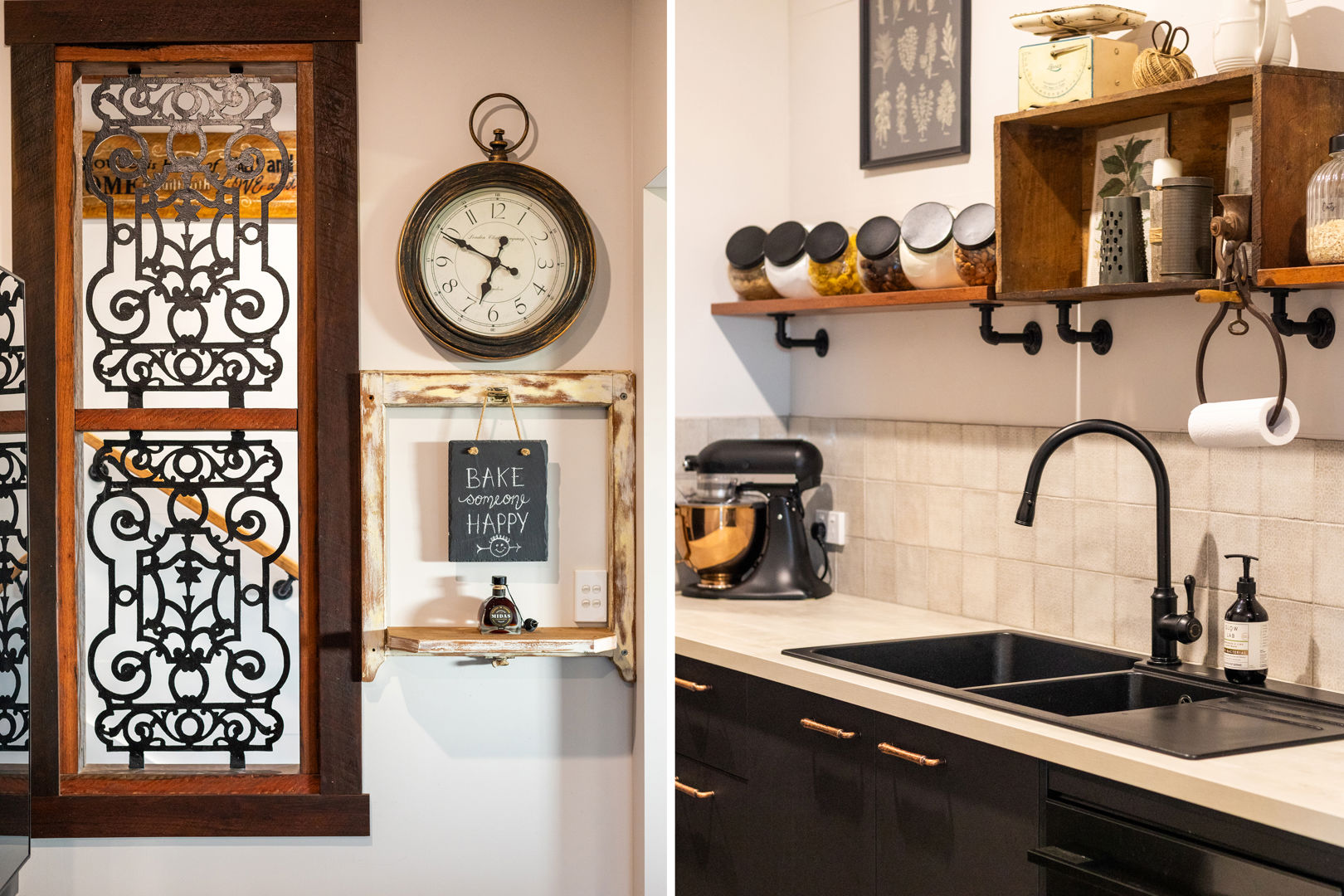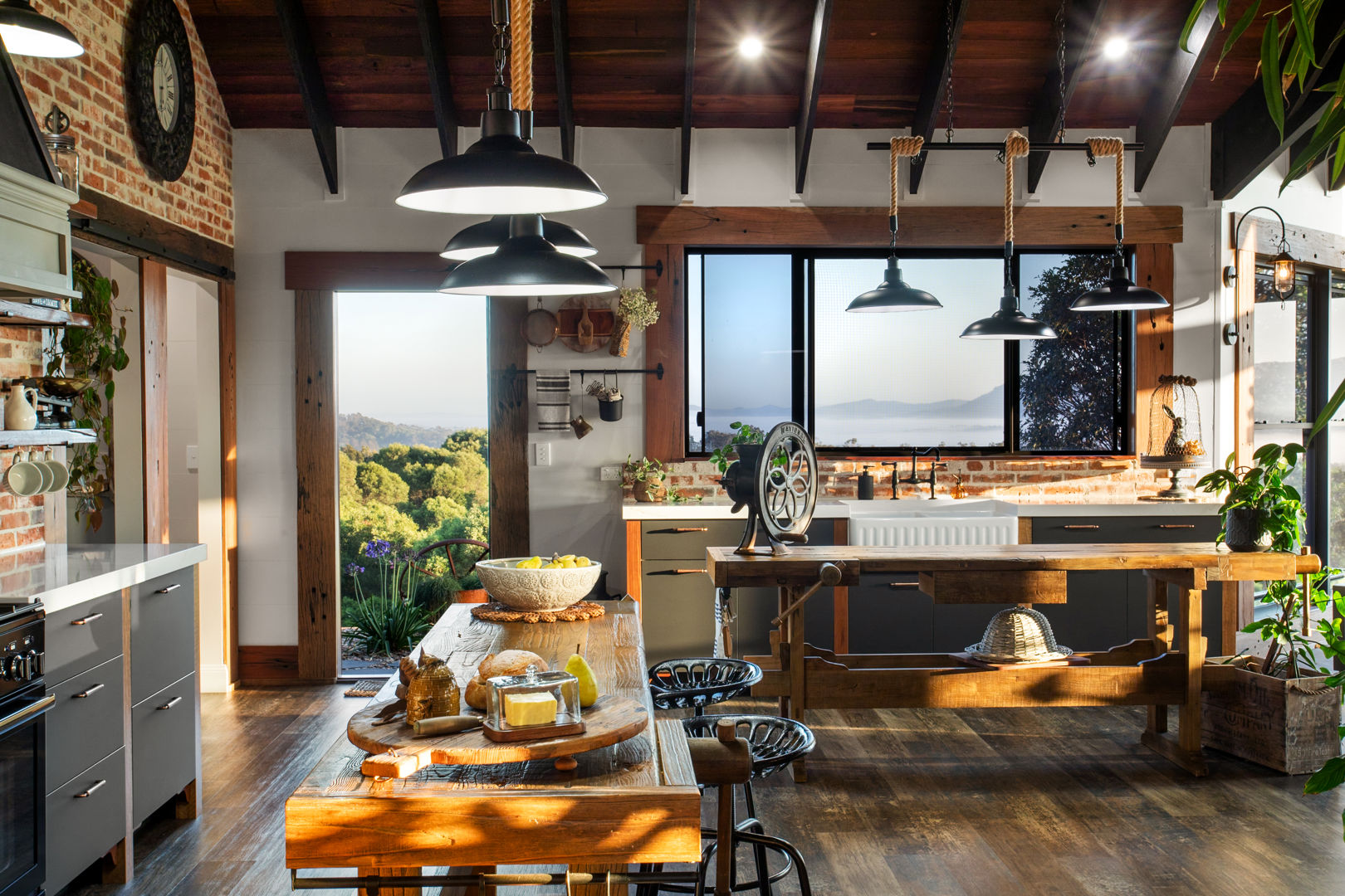 that seamlessly connects the kitchen, living and dining spaces. The hero of the home is the kitchen; truly a textural delight offering feature reclaimed brick walls, stone benchtops, high-end cabinetry, handmade tapware, Falcon gas stove and a generous walk-in butler's pantry, double drawer dishwasher and separate sink. A cozy wood-heater adds warmth and exudes charm. Practical hybrid flooring flows throughout the home.