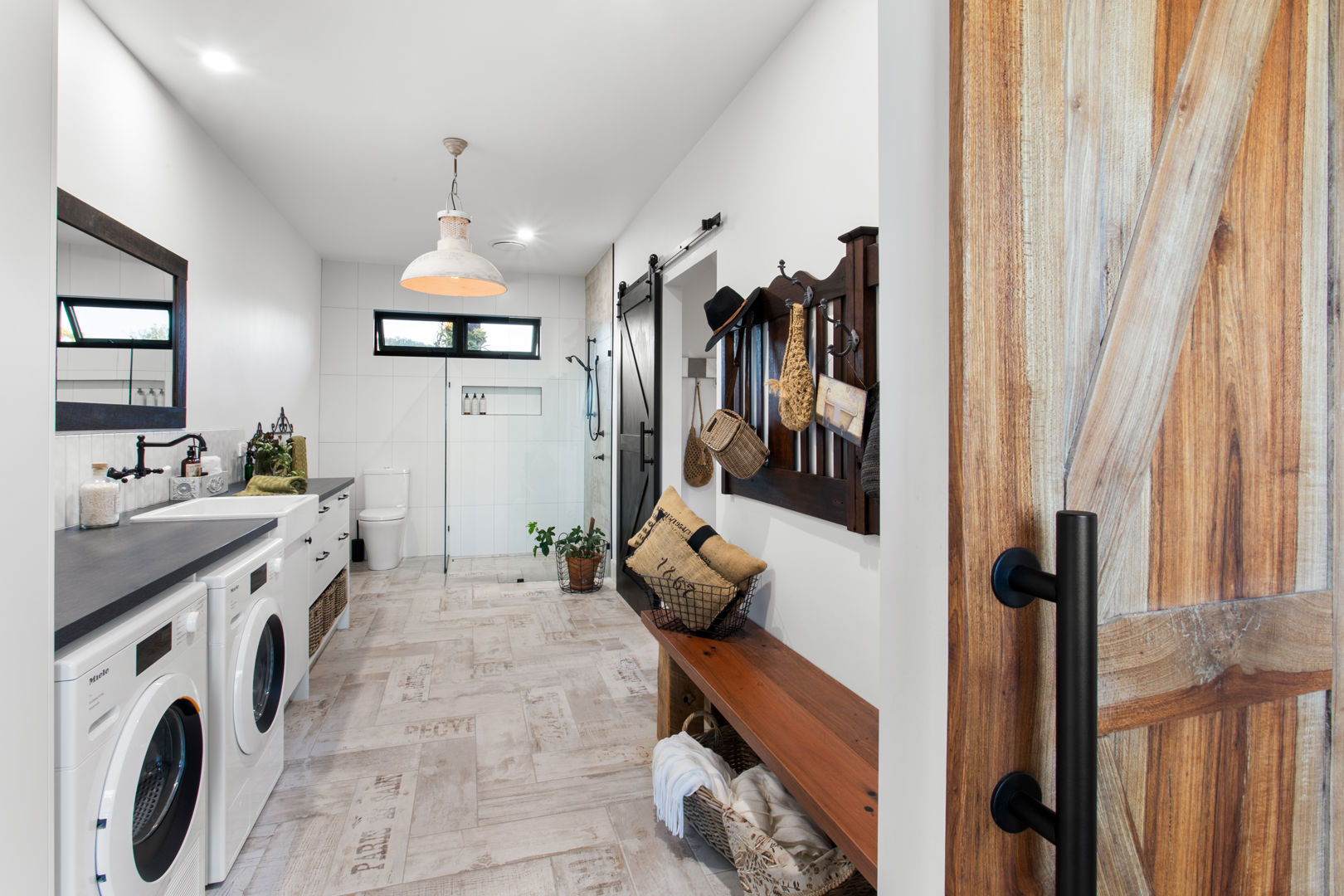 On the upper level you will find two spacious sized bedrooms with high ceilings, ceiling fans, air conditioning, linen curtains and built-in robe. An exceptionally generous family bathroom/laundry/mudroom combined, with private access via sliding barn door into bedroom two. The third bedroom offers a peaceful day bed with picture window for quiet reflection, and hand painted mural feature wall.