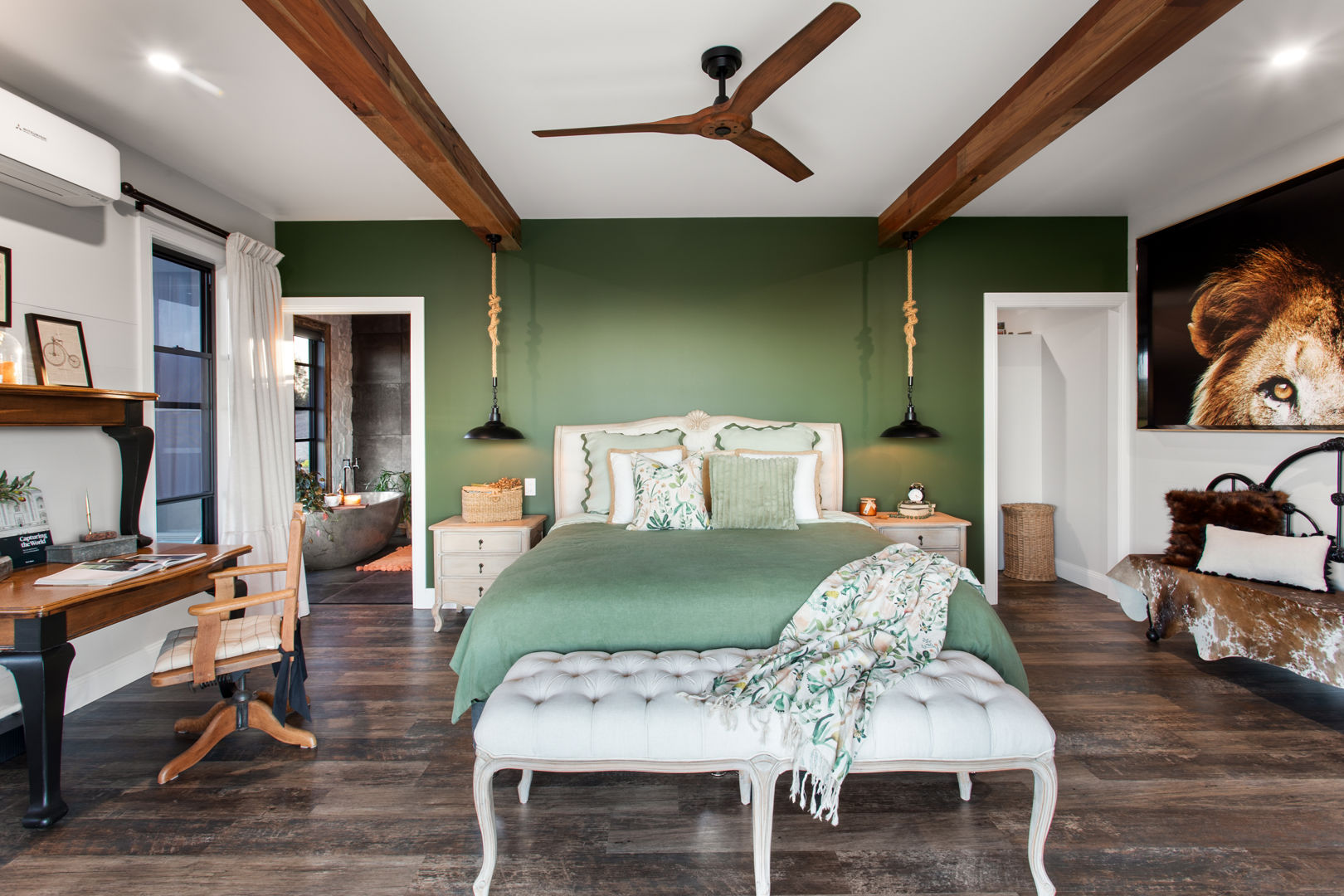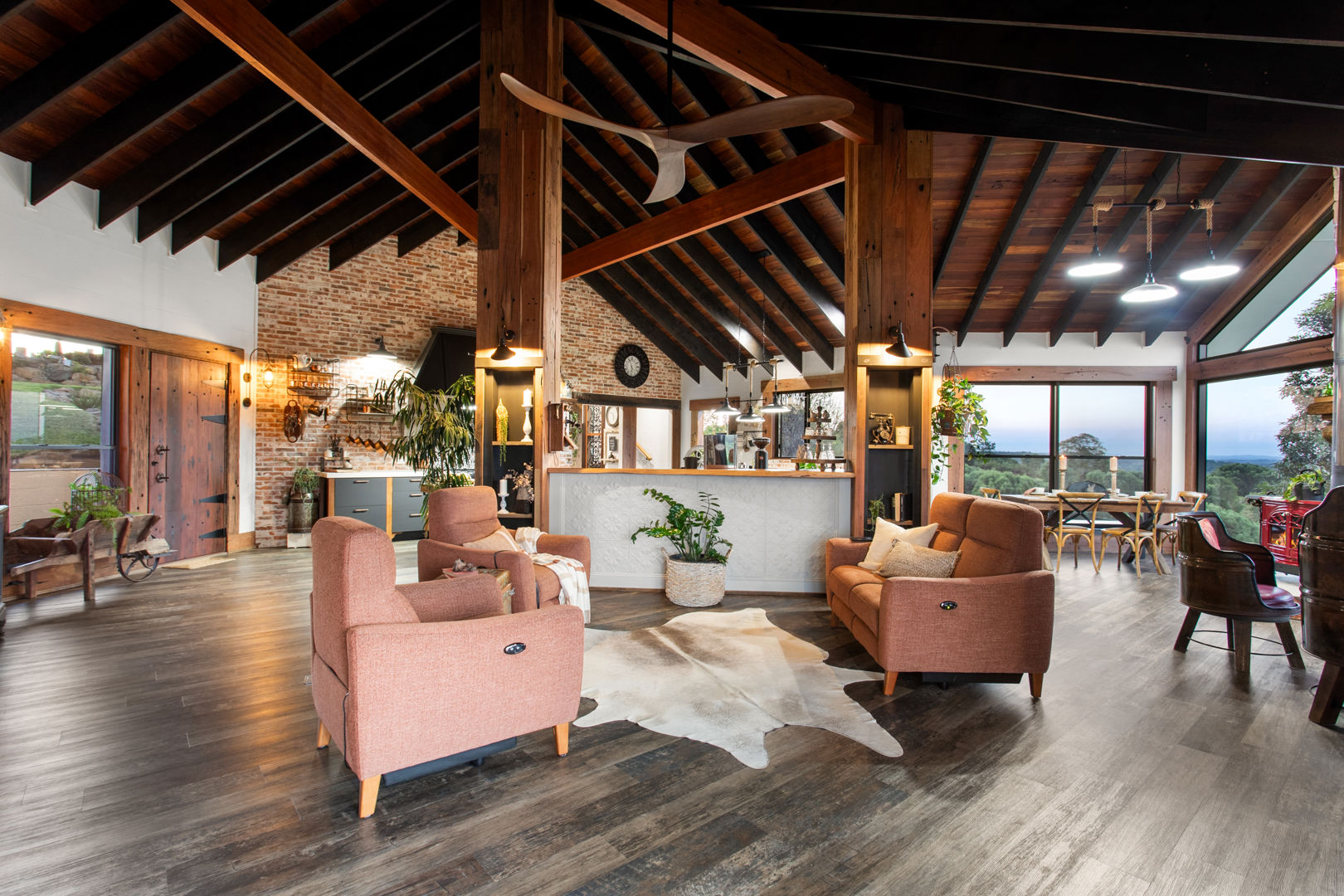 The indulgent King sized master suite offers a tranquil retreat with private patio access, walk-in wardrobe, custom handmade linen drapery, timber beams and reverse cycle air conditioning. Wash the day away in a romantic retreat-like ensuite, whether it be in the sumptuous deep concrete bath or in the double sized shower with dual rainwater tapware.
