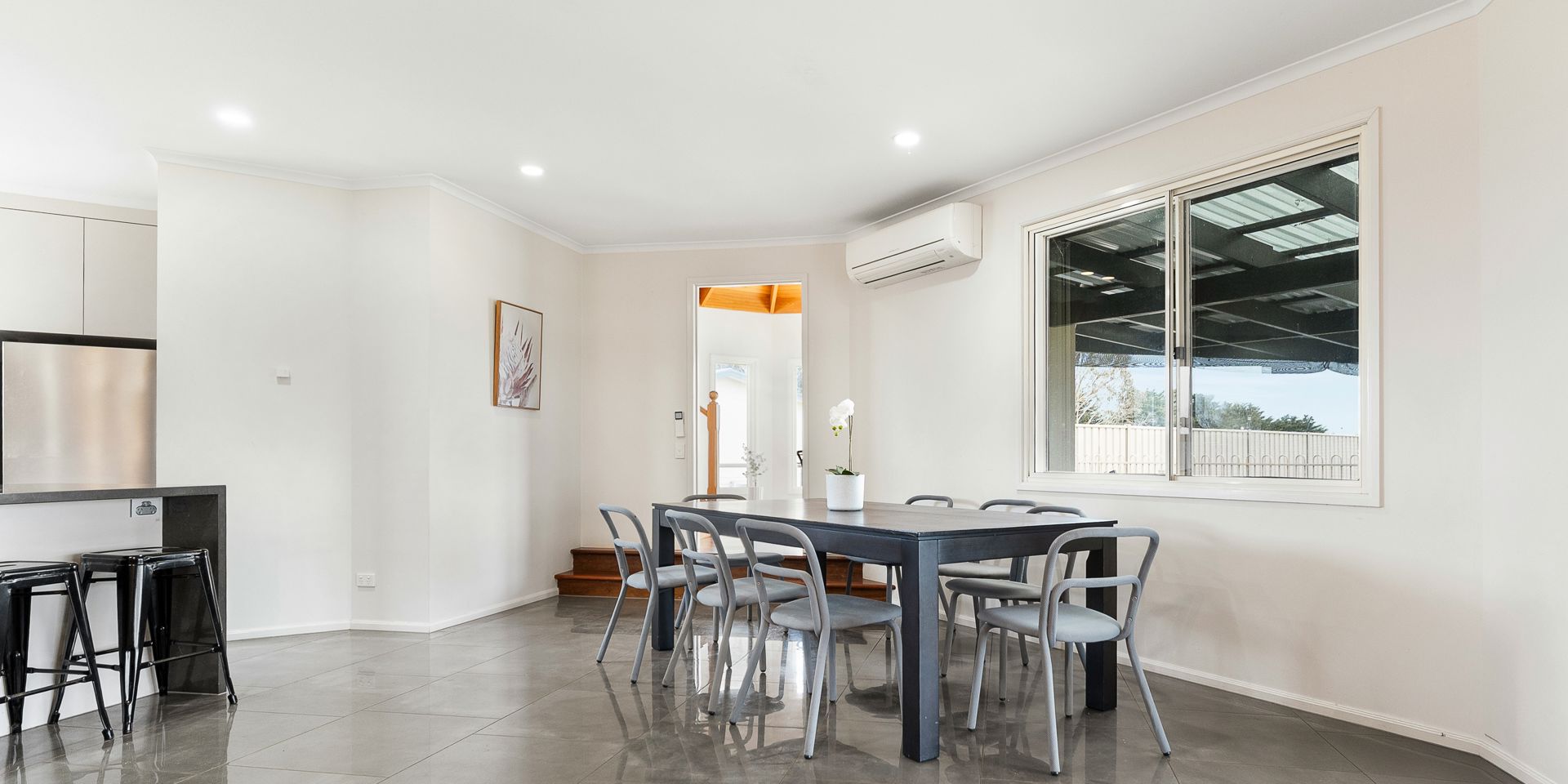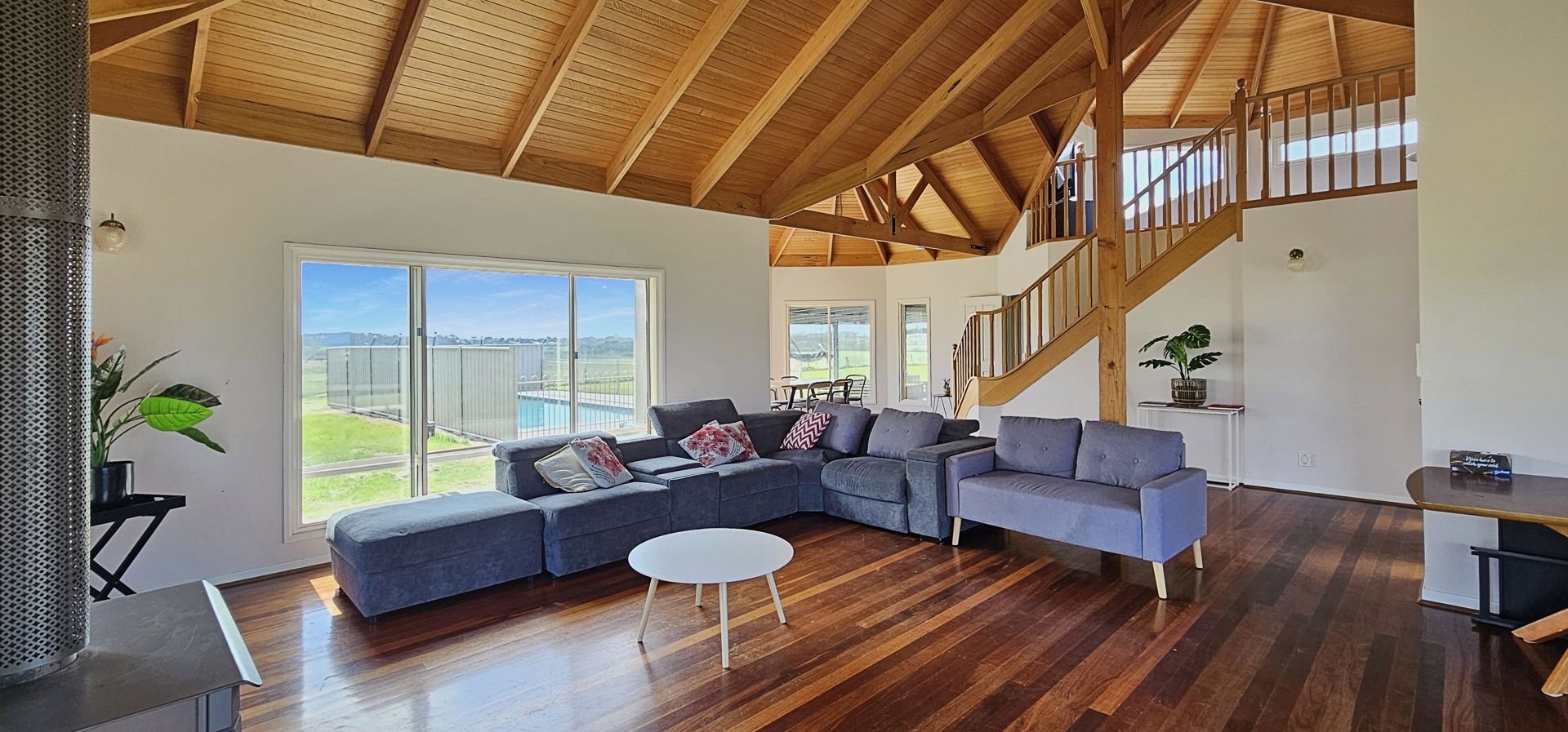 At the heart of the property stands a distinctive five-bedroom, two-bathroom residence where craftsmanship and character shine. Striking timber-coned ceilings soar above the living areas and the private main bedroom retreat, while a beautifully crafted timber staircase leads to a spacious upper lounge boasting sweeping rural and trackside views. Modern comforts are thoughtfully integrated throughout, complemented by the inviting warmth of a large wood fireplace that anchors the main living zone. The kitchen, perfectly positioned at the centre of the home, features an island bench, walk-in pantry and utility cupboard, creating a seamless hub for family dining and entertaining. Each robed bedroom is generously sized and enjoys peaceful garden or rural outlooks. Outside, a sun-drenched patio and sparkling, fully fenced in-ground pool offer an idyllic setting for summer gatherings or moments of quiet relaxation amid the surrounding countryside.