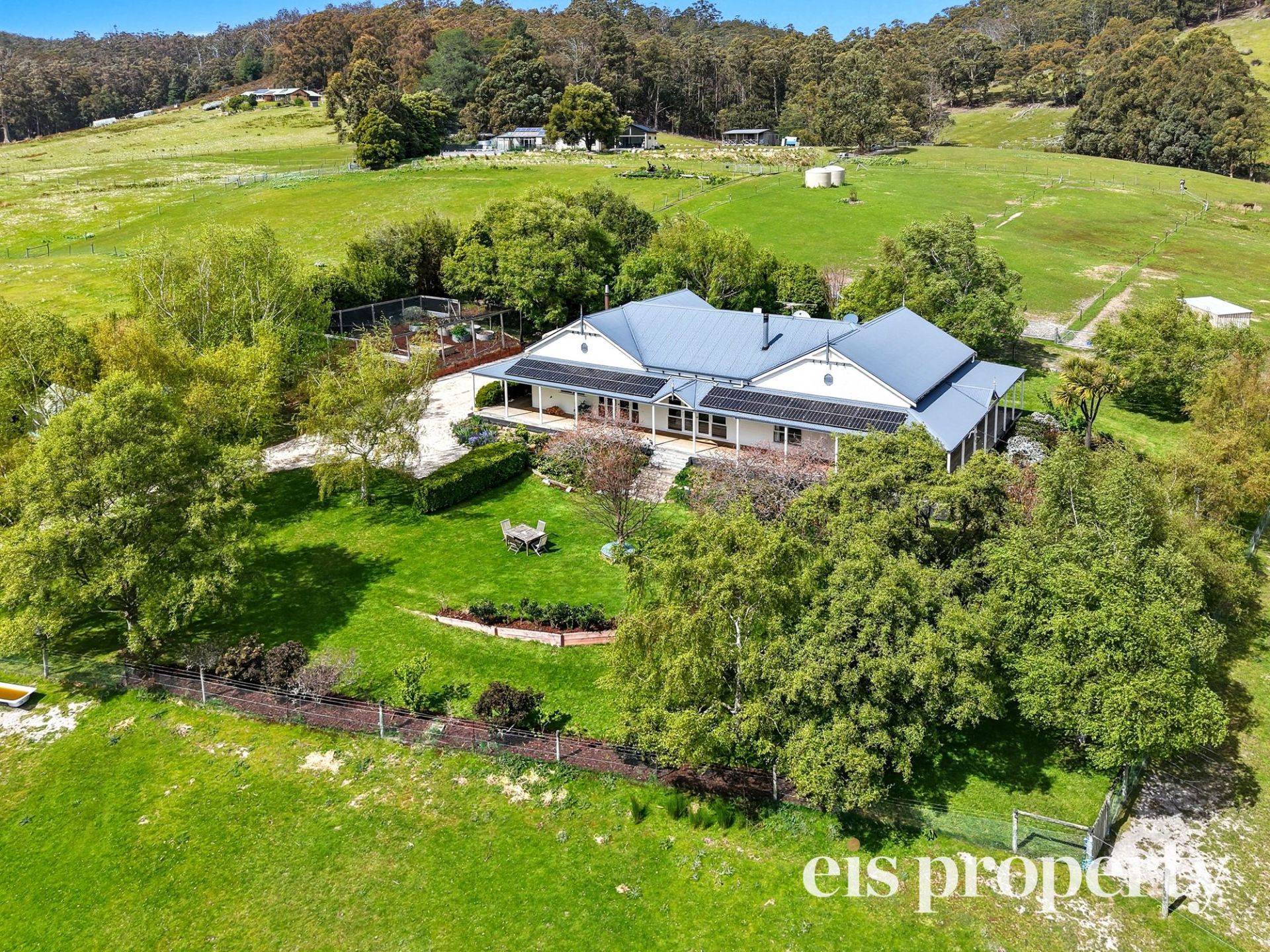 The gardens are a true sanctuary, featuring a greenhouse, enclosed vegetable garden and automated irrigation. Water is abundant, with 30,000 litres of house storage plus a further 60,000 litres for gardens and livestock. The home also includes a 6.5kW solar system and hydronic heating from the fuel stove, providing hot water to the kitchen and main bathroom, with radiators in both the living area and ensuite as well.