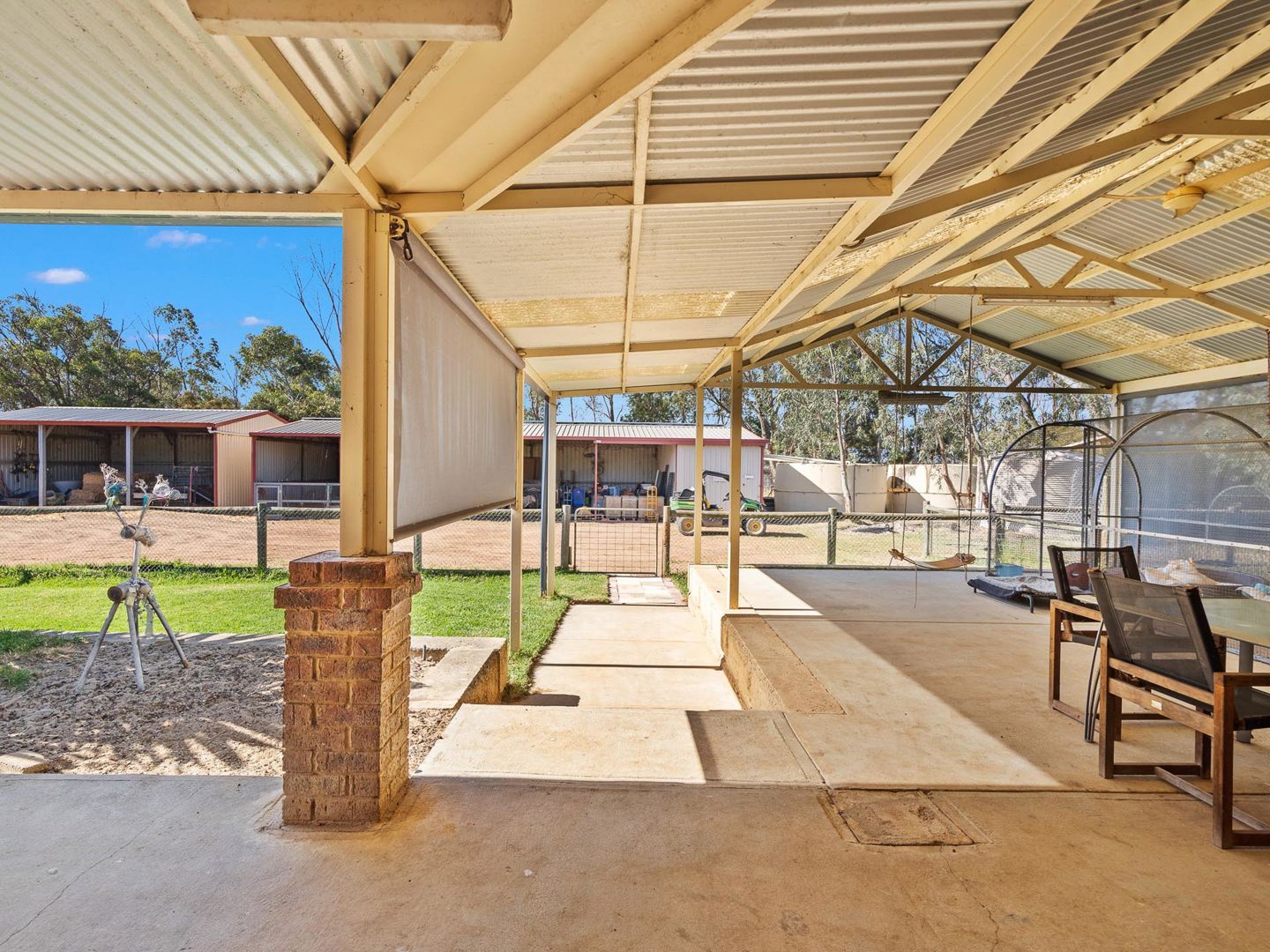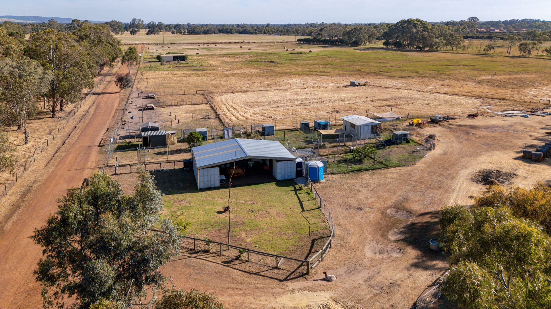 The wraparound verandah and two patios provide idyllic spots to relax, entertain and enjoy serene rural views. With 12 paddocks and 3 large storage sheds, the property is perfectly set up for farming or another animal sanctuary. You can currently harvest up to 150 hay bales, adding great value for those looking to generate income or support livestock. The insulated function area provides the perfect rural backdrop to host events. Additional features include secure chicken coops, gravity troughs, electric fencing and a 40ft solar-lit shipping container, currently used as a feed room with solar lighting. Three rainwater tanks, a bore with reticulation and solar power, add sustainability to this incredible property.