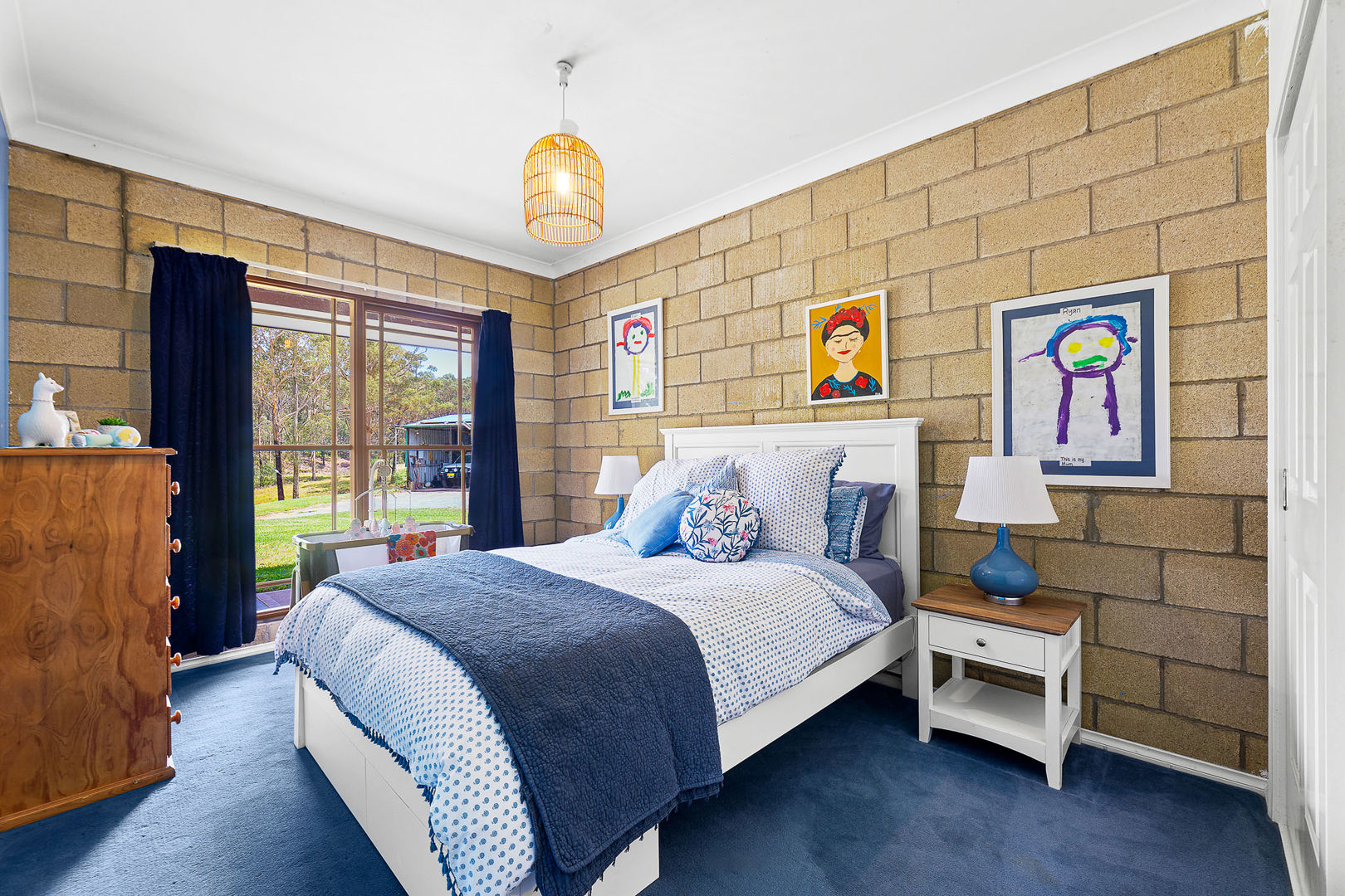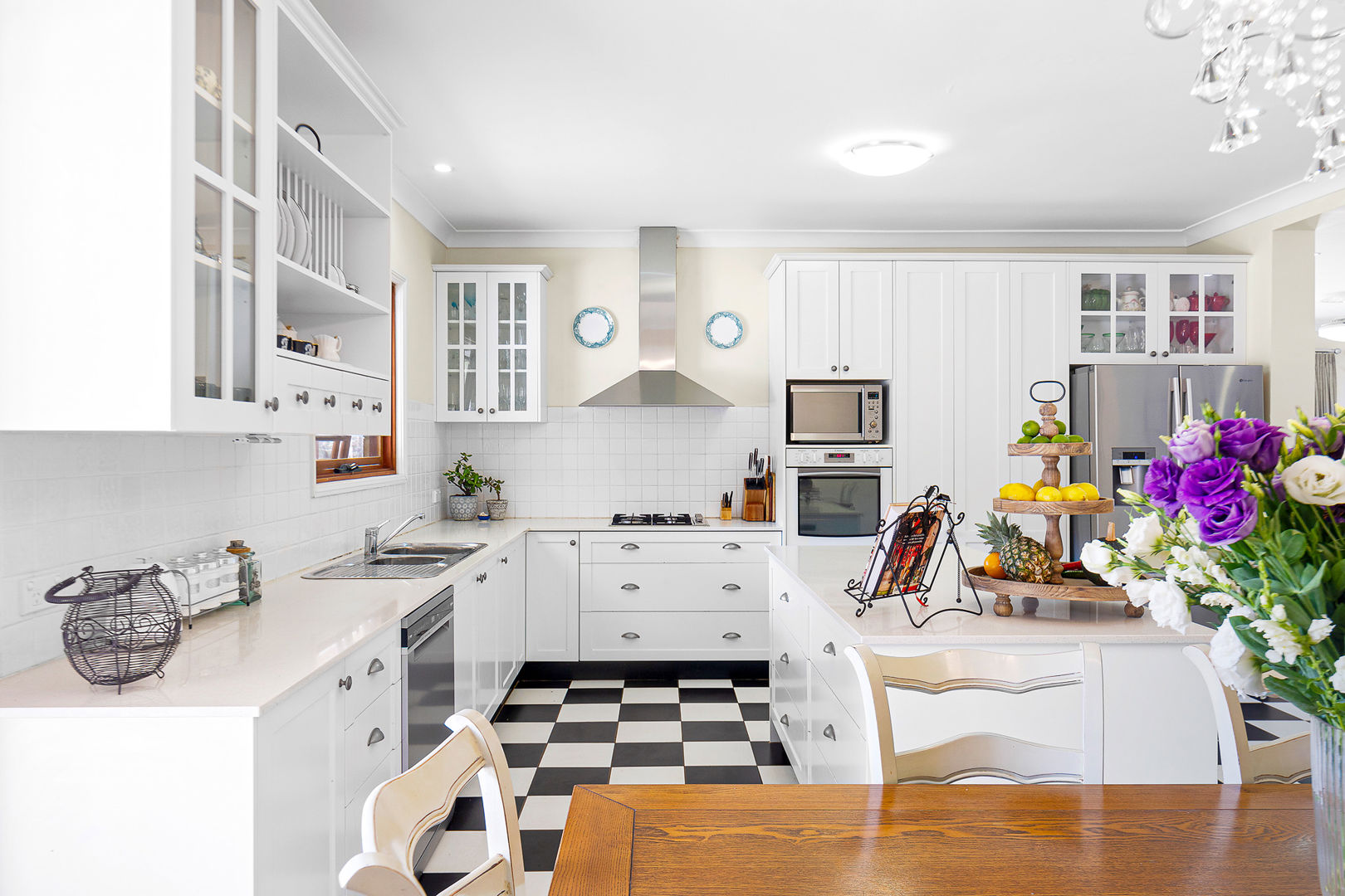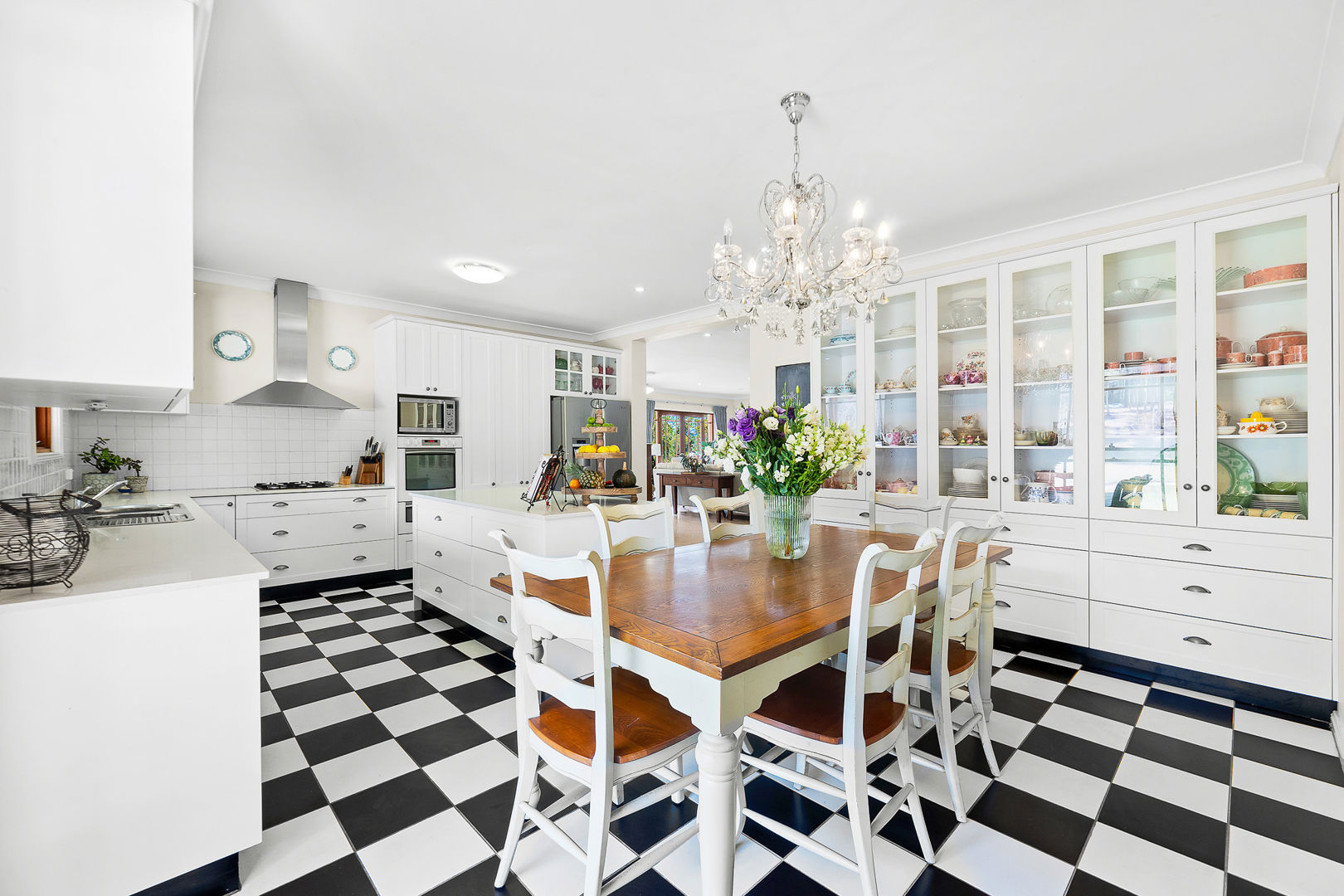 Country style living - This solid Besser brick house is designed with a charming country aesthetic, featuring checkerboard floors, an island kitchen bench, a beautiful chandelier, and an open fireplace, creating a warm, inviting atmosphere throughout.