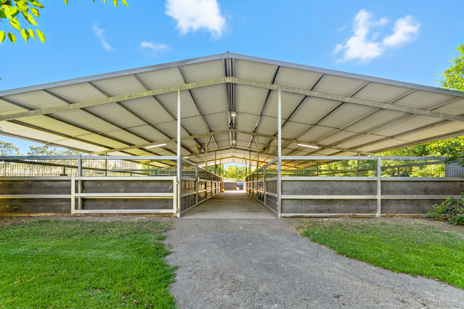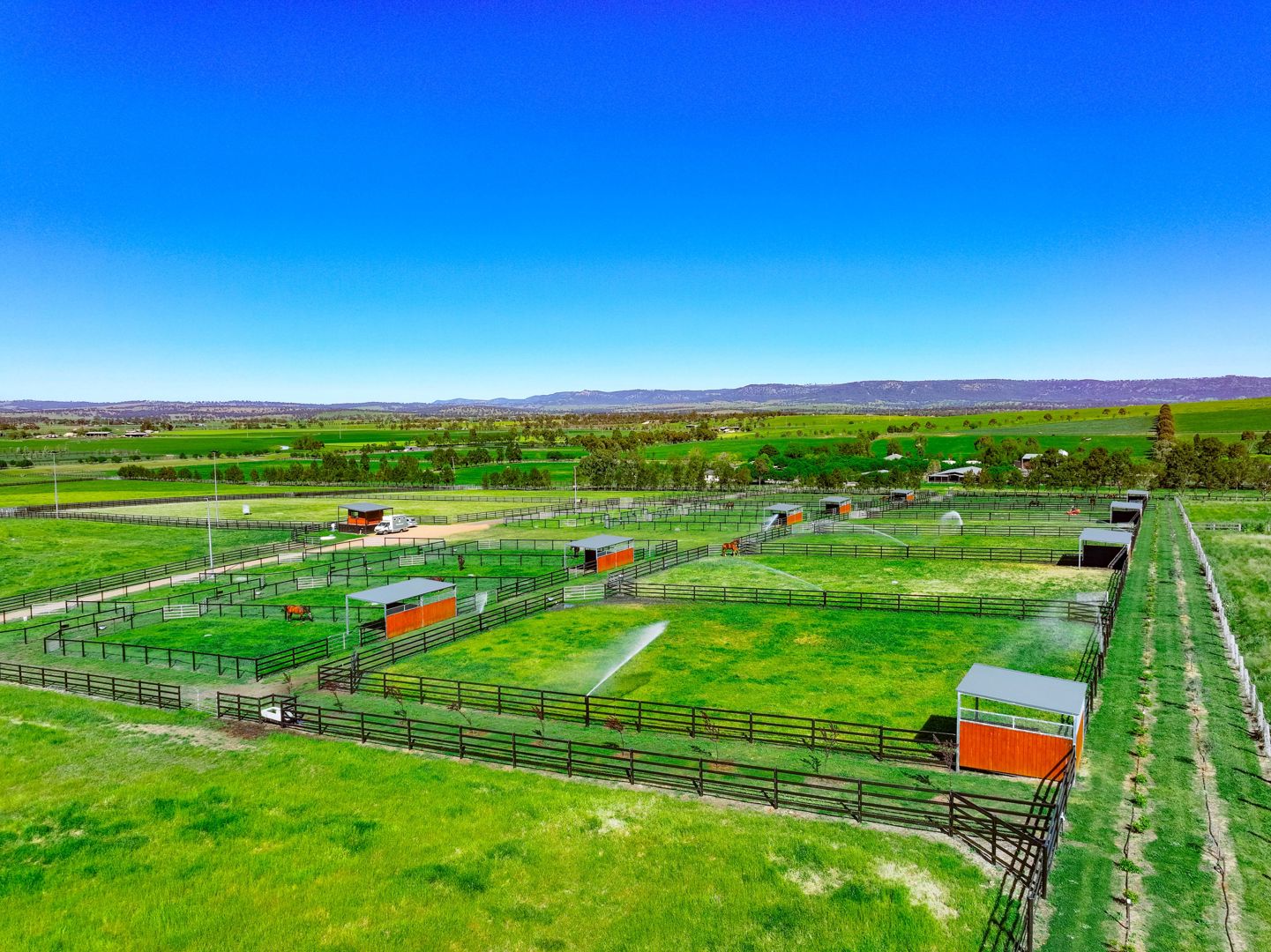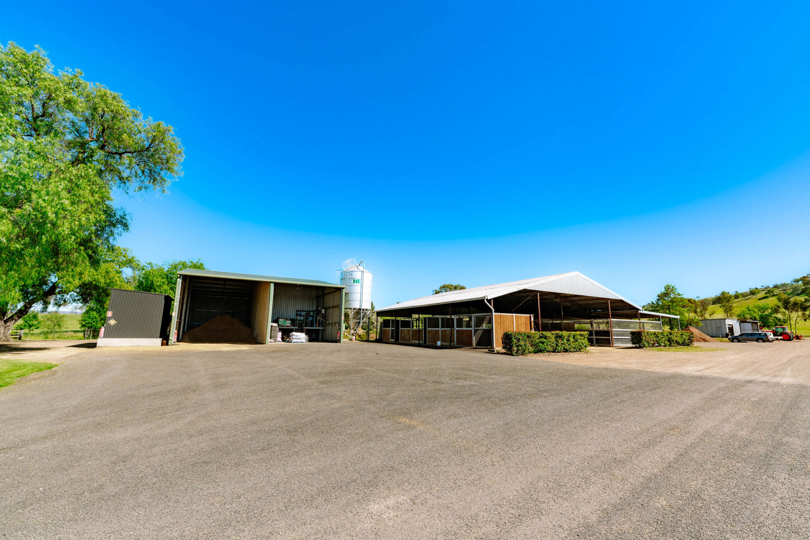 Farm infrastructure includes a feed barn, hay sheds, workshop, nursery shed, fuel shed, bore and pump sheds, cattle yards with loading ramp, and a 60-tonne silo. The property is fenced into approximately 30 main paddocks ranging from 1.3 to 27 hectares, plus over 70 smaller holding yards - all recently refurbished with Duncan equine post and rail plus horse mesh in intense use areas.