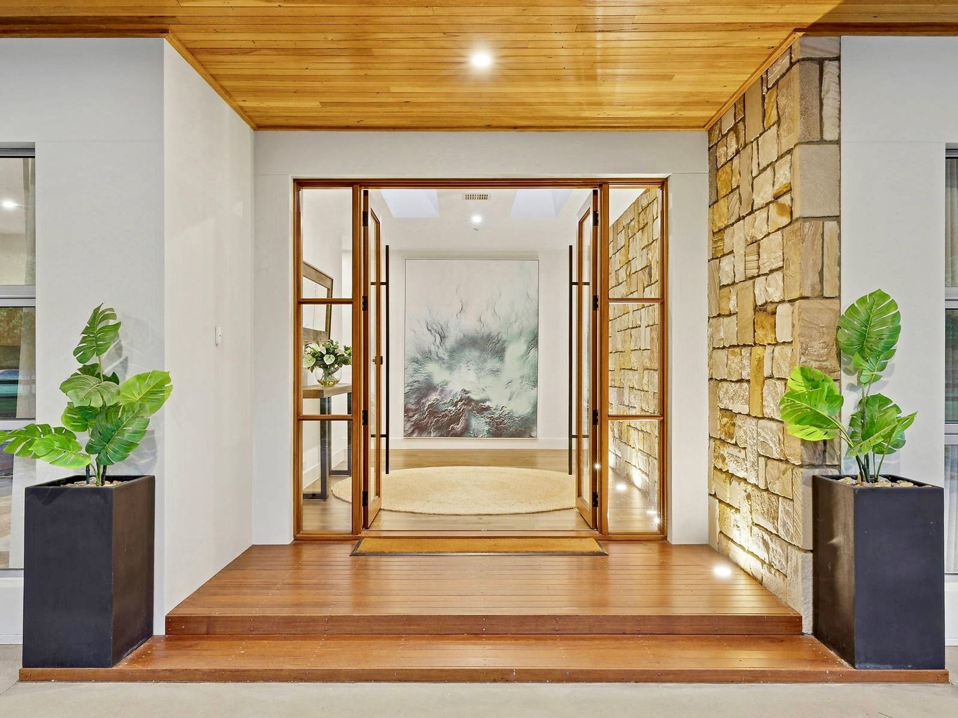 A striking stone entry wall and covered drive-through portico set the tone for what lies within - a warm, contemporary home defined by natural textures, seamless functionality, and luxurious detail.