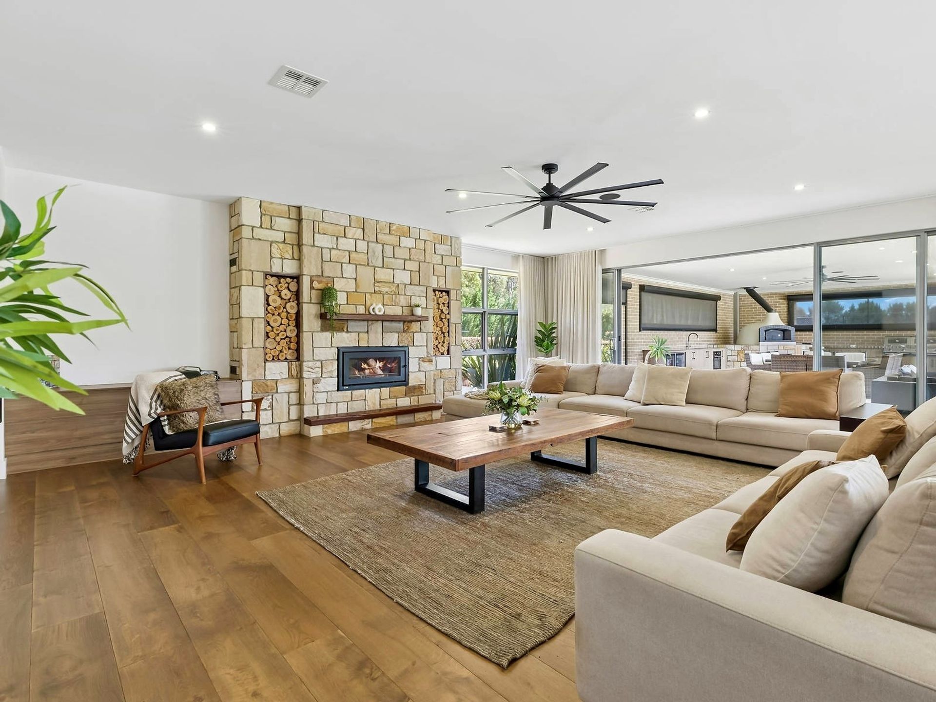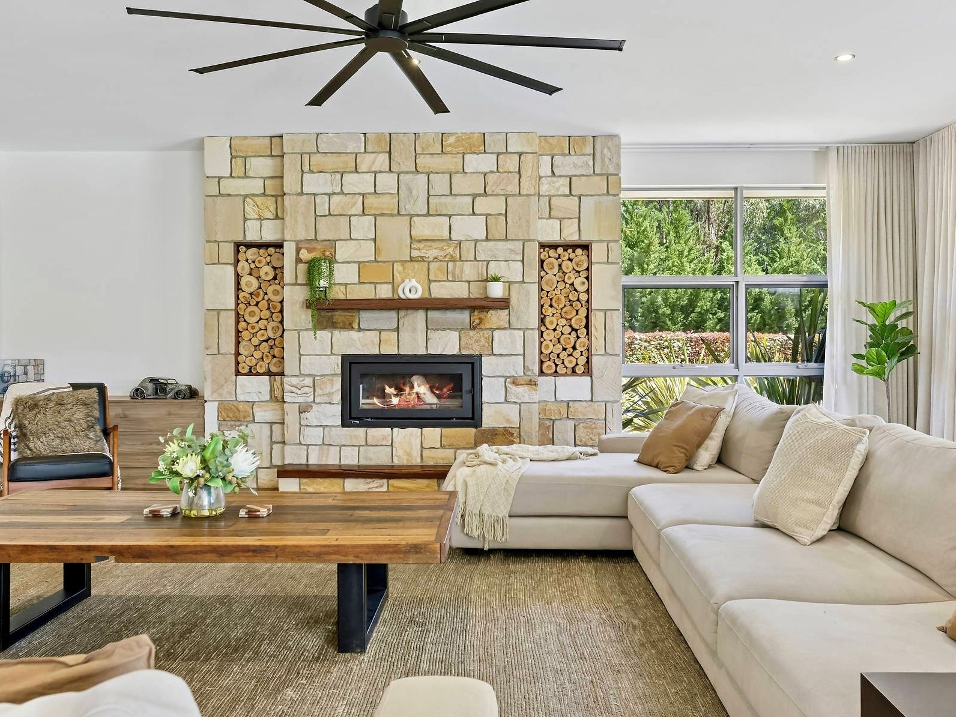 - Stone feature fireplace with dual internal/external firewood box