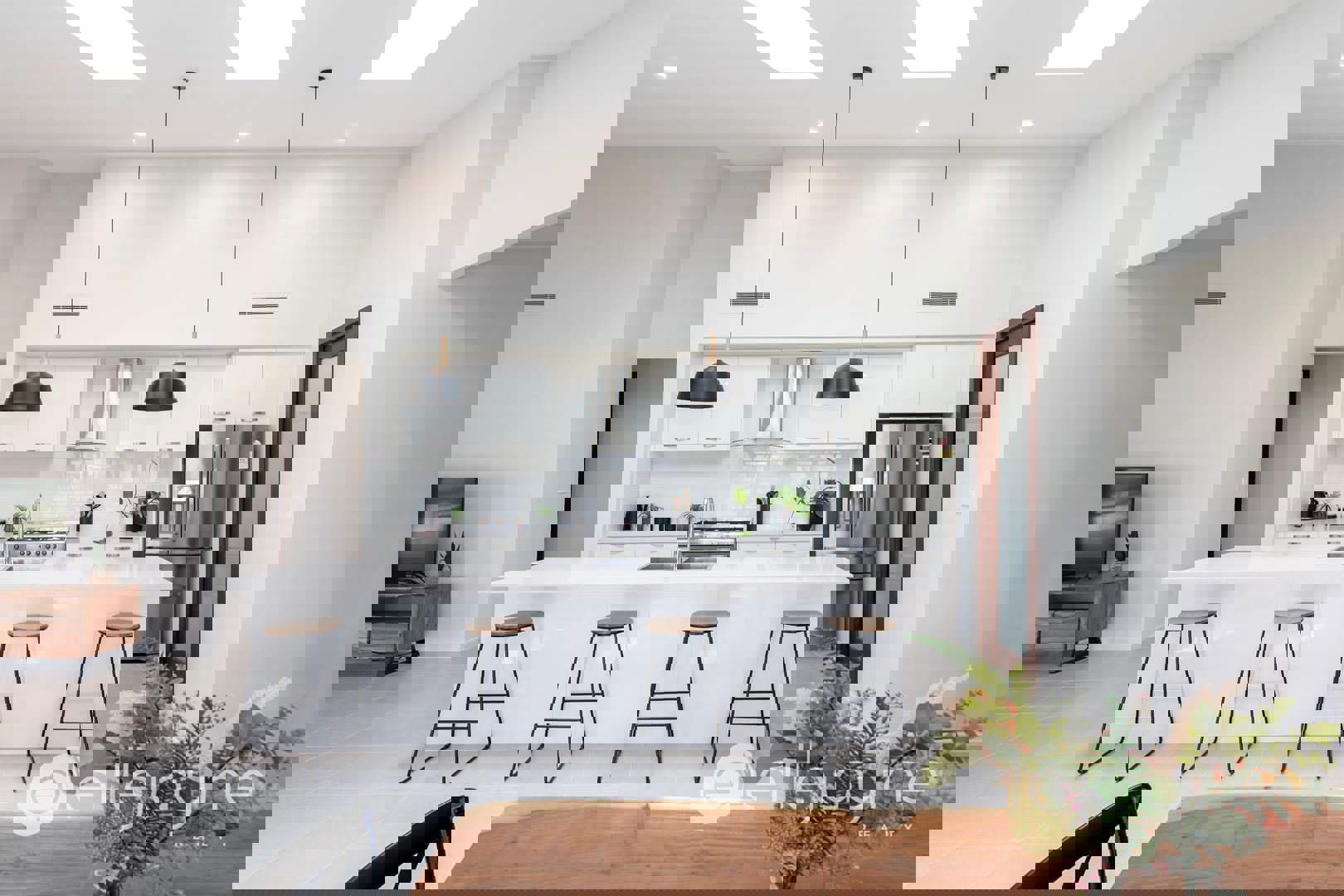 • Modern designer kitchen with raked ceilings and beautiful design features including pendant lighting, multiple skylights and bench with breakfast bar, plenty of bench space with stone benchtops, walk-in pantry and stainless-steel appliances.