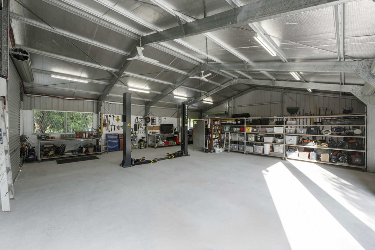 • Fully insulated 8-bay shed with car hoist, 6 roller doors (one over-height), and 5000 ltr water tank - ideal for trades, car/boat storage, workshop, studio or hobby space.