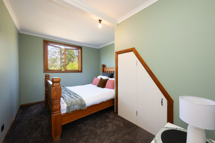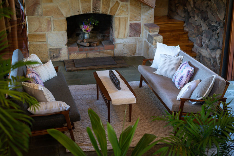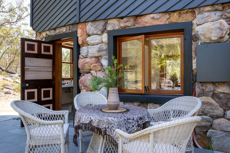 At the heart of the home, a striking double sided fireplace framed by floor-to-ceiling sandstone block walls defines the open plan living and dining areas, while subtly separating the formal lounge. These feature walls are constructed from turn of the century hand cut sandstone, setting a powerful design precedent throughout the home. Locally sourced hardwoods, milled nearby at Athol Glen, are used extensively, adding warmth and authenticity. The bush rock sandstone forming the entire ground floor exterior was collected directly from the property, while 1800s Grafton Racecourse bricks have been repurposed to construct the fireplace chimney and kitchen piers.