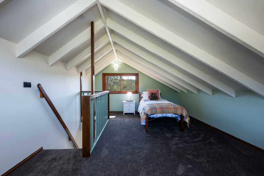 The architecturally designed floorplan prioritises comfort and liveability, with all bedrooms located on the main level. The north-eastern master suite enjoys a private, north facing covered deck, generous walk in wardrobe, spacious ensuite, and an adjoining loft ideal for a study or reading retreat. Two additional bedrooms, a large secondary loft, and an elegant main bathroom complete this level.